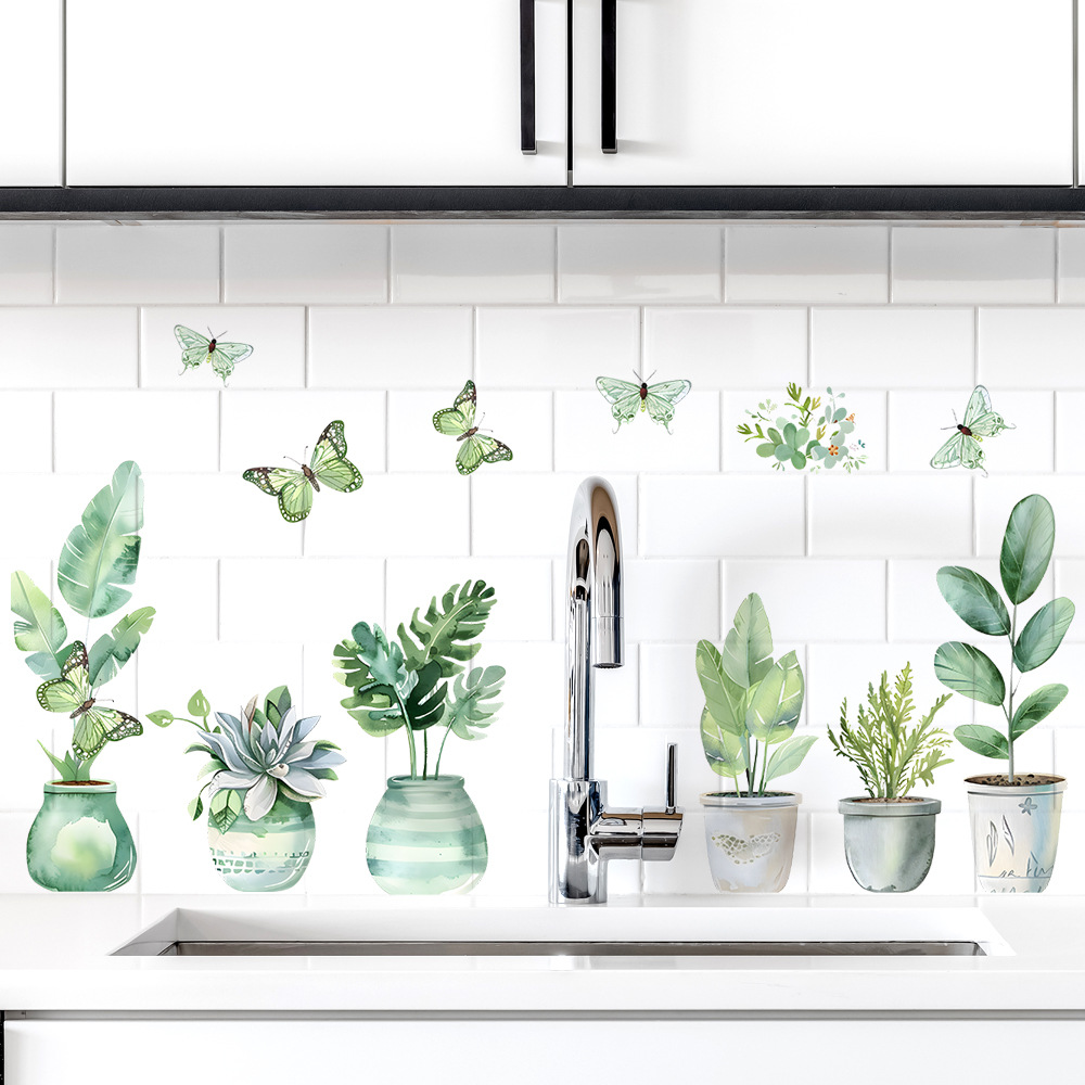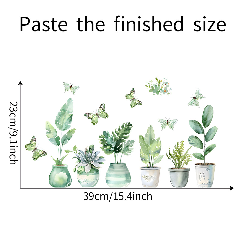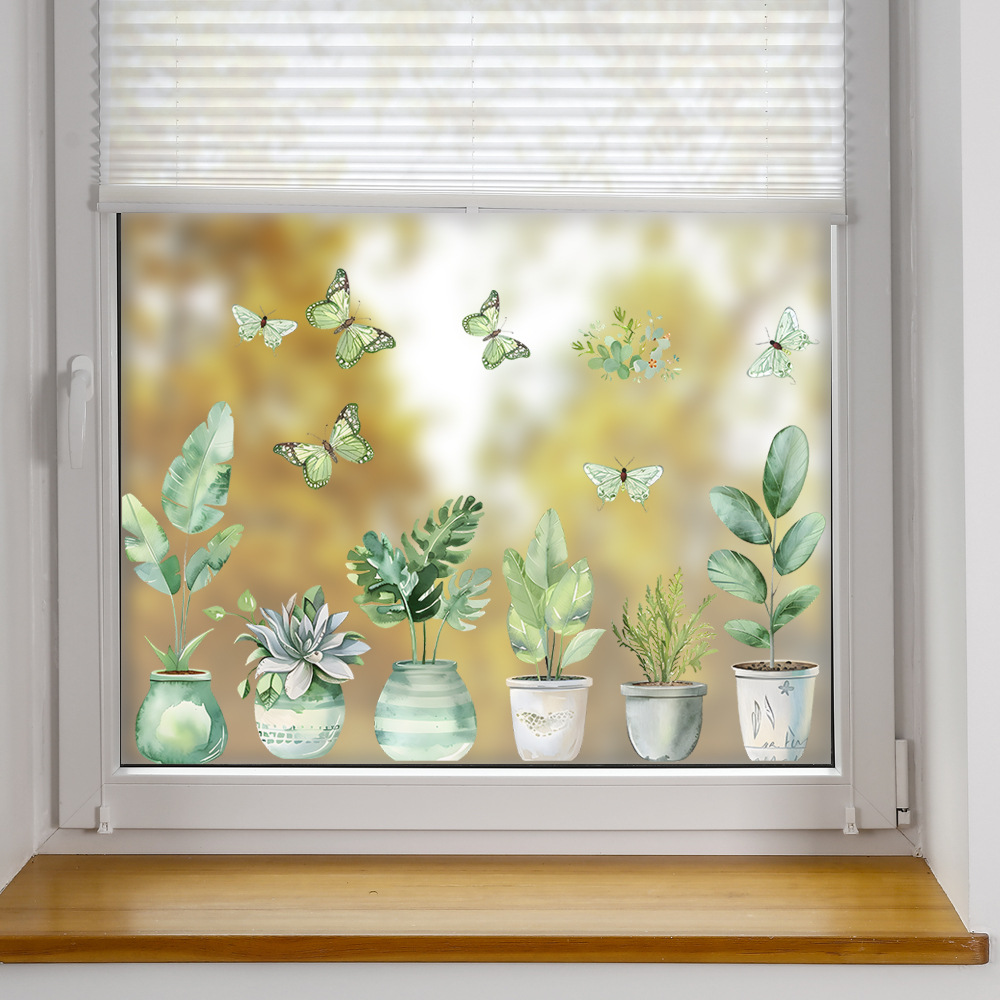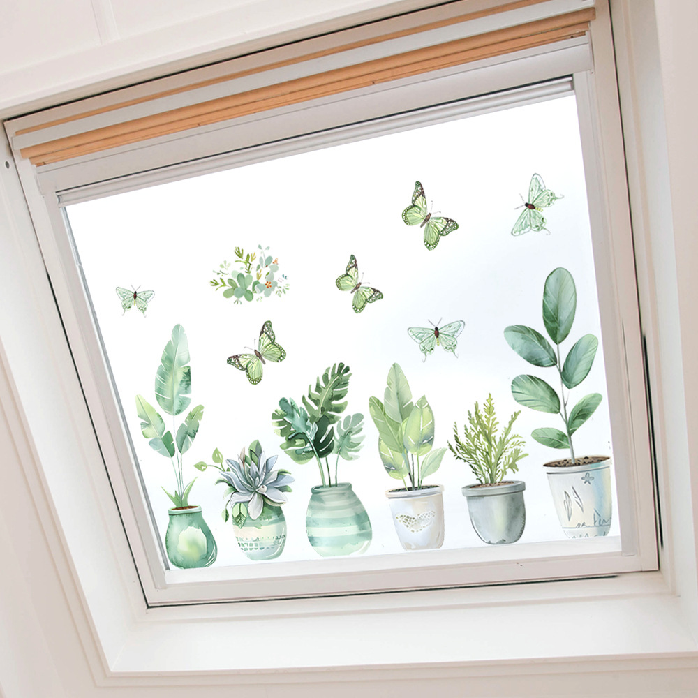 Fun-W016 작은 신선한 녹색 식물 화분 유리문과 창문 거실 집 미화 장식 창 스티커 도매 자기 접착