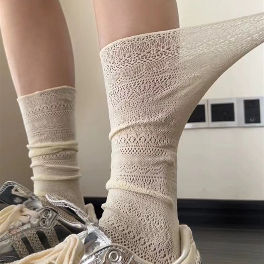 화이트 레이스 더미 슬림 핏 하이 송아지 양말 여성용 여름 얇은 할로우 메쉬 통기성 여름 스타킹