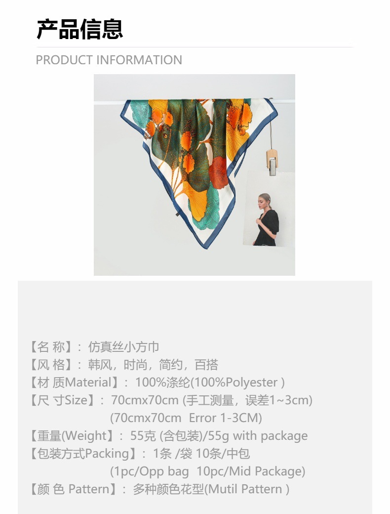 새로운 컬러 은행나무 잎 인쇄 광장 스카프 작은 실크 스카프 여성 한국 스타일 패션 올 매치 서양식 모방 실크 스카프