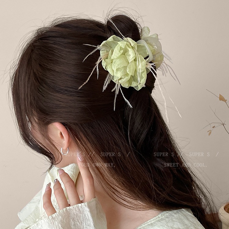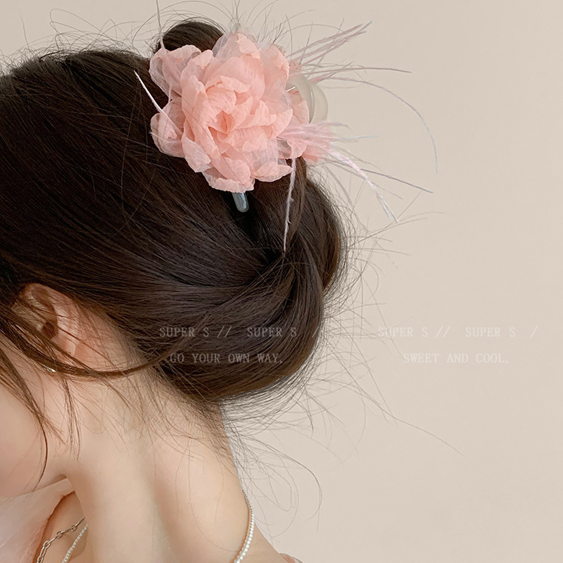 牡丹花羽毛流苏抓夹2024新款发夹后脑勺显发量蓬松高颅顶鲨鱼夹