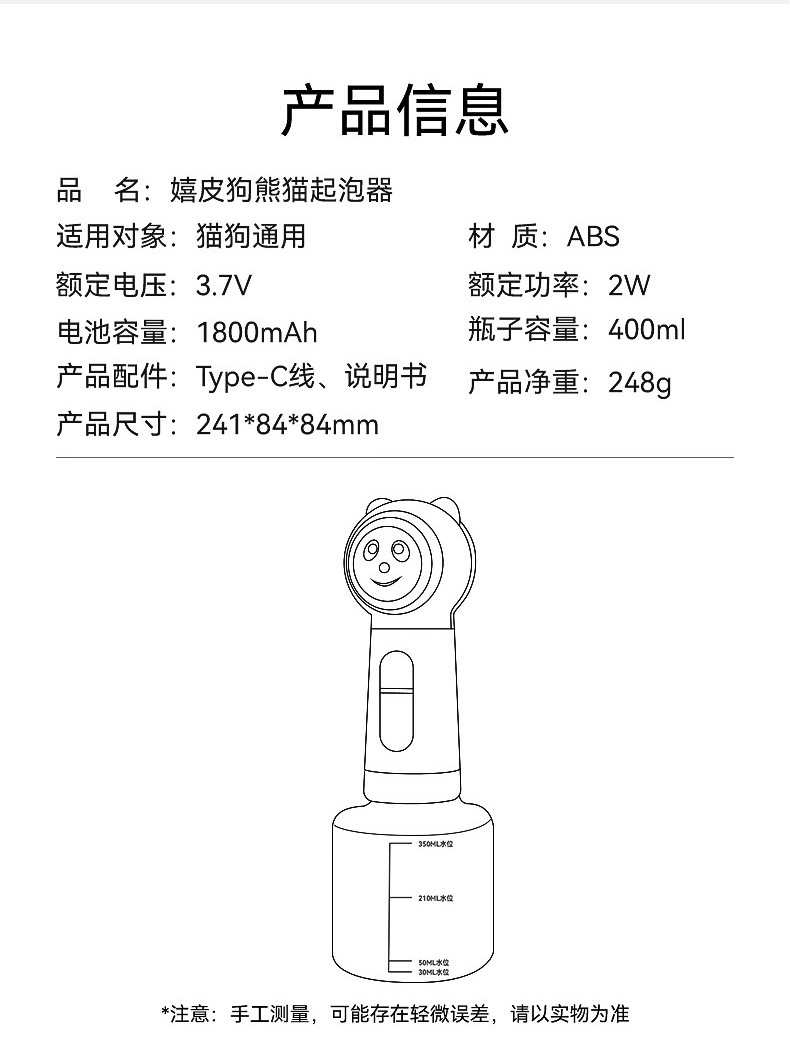 애완 동물 거품 기계 귀여운 팬더 거품 기계 개 고양이 목욕 목욕 샤워 젤 개 지능형 거품 기계