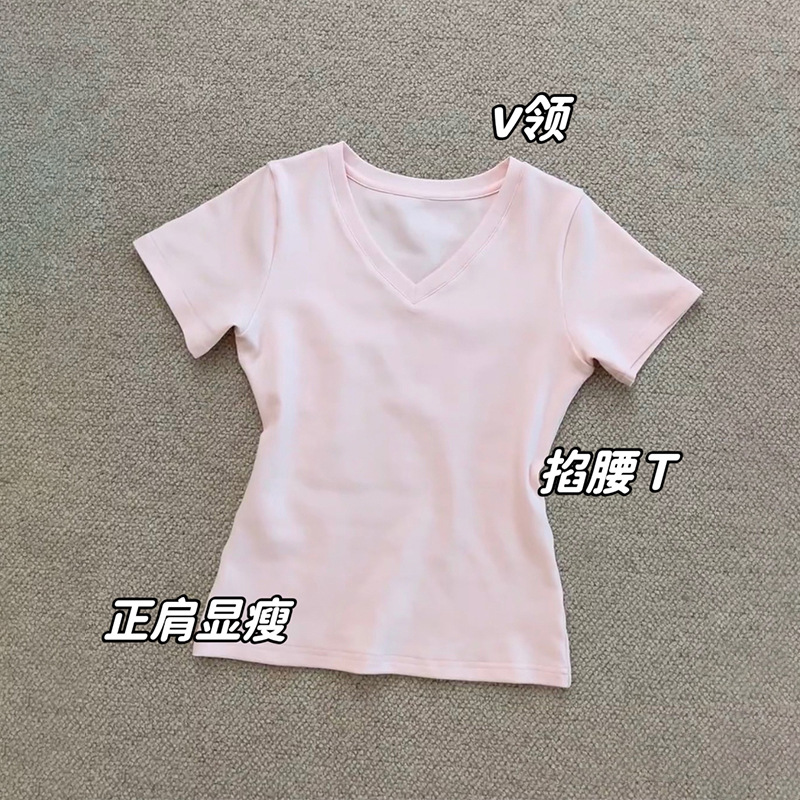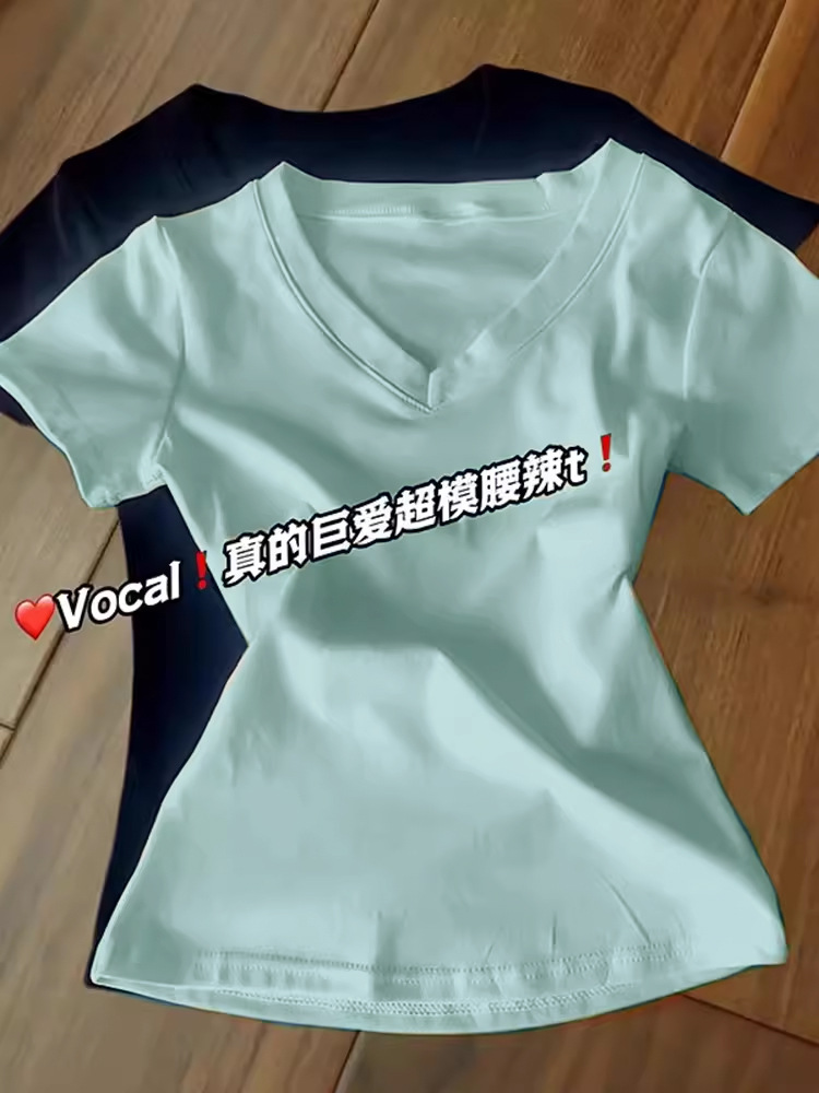블랙 숄더 티셔츠 여성용 반팔 V-Neck 슬림 핏 슬리밍 타이트 허리 디자인베이스 셔츠 미국 핫 걸 탑