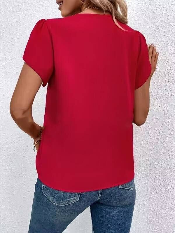 유럽과 미국 스타일의 여름 달콤한 연꽃 소매 V 넥 슬림 짧은 소매 쉬폰 셔츠 레이스 중공 올 매치 최고 여성 탑