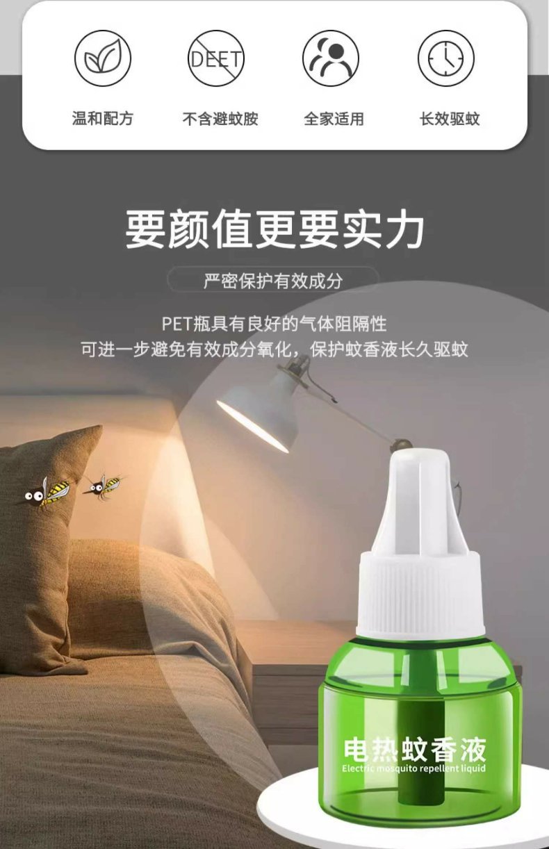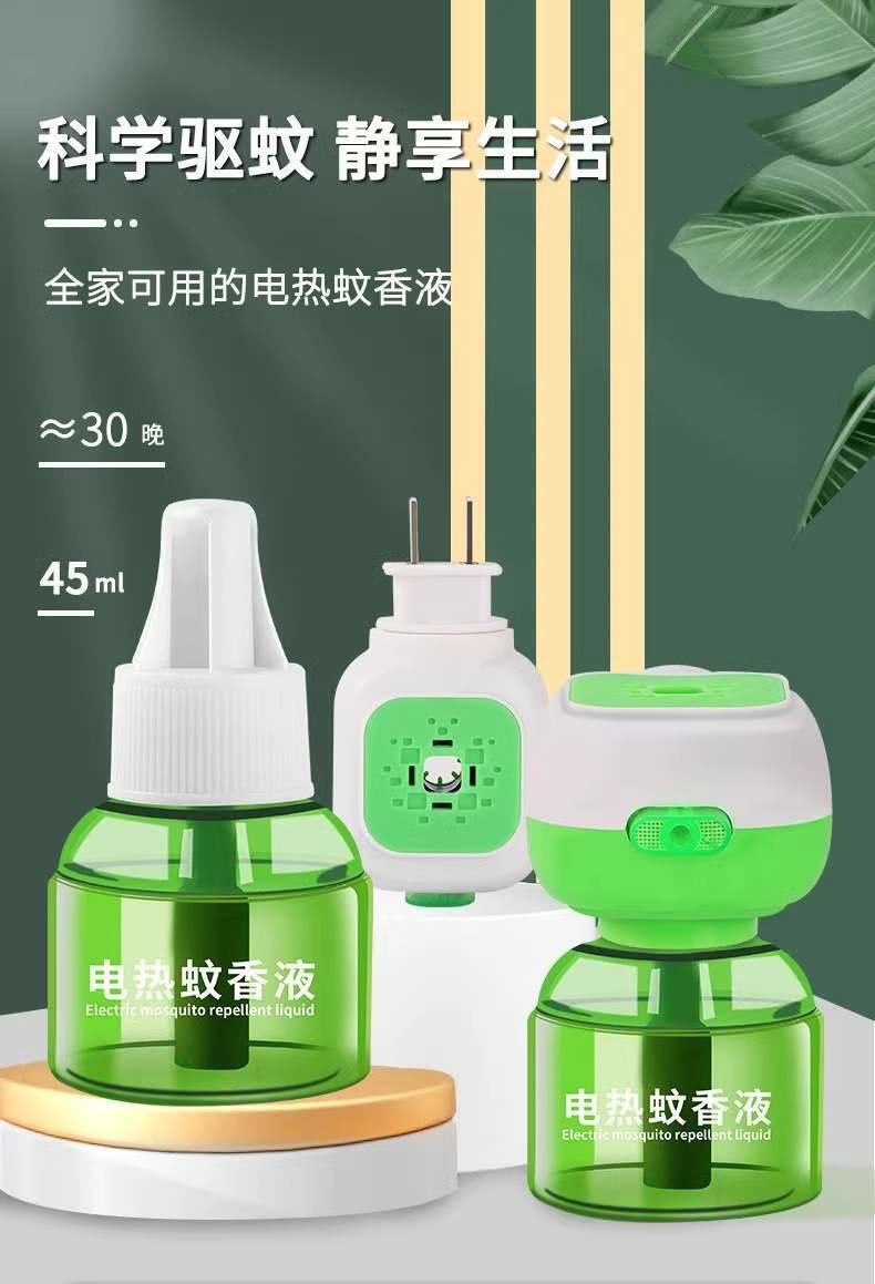 전기 모기향 액체는 무취이며, 아기와 임산부도 사용할 수 있습니다. 전기 모기향 기계는 가정용 모기 퇴치제로, 플러그인 방식으로 작동합니다.