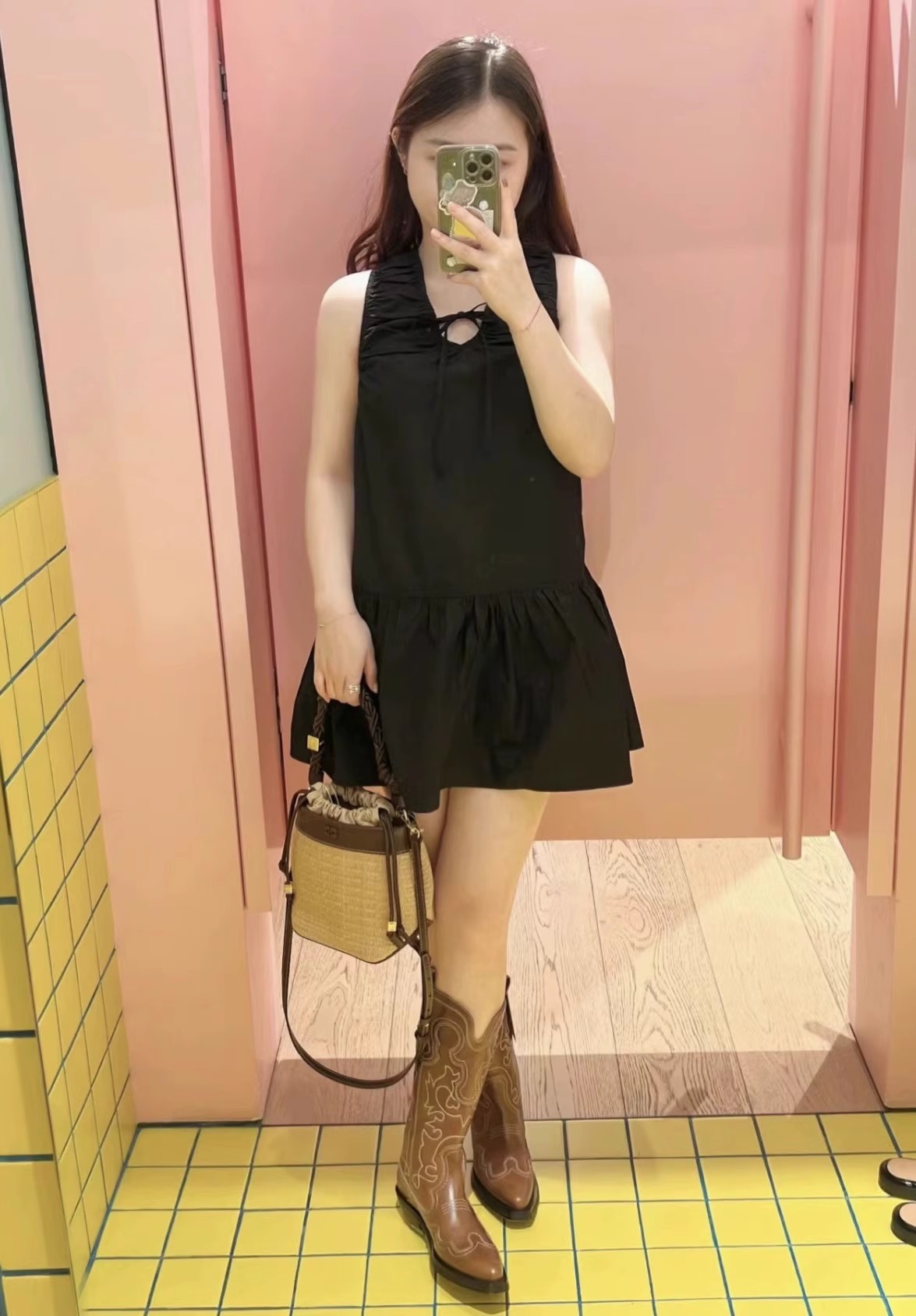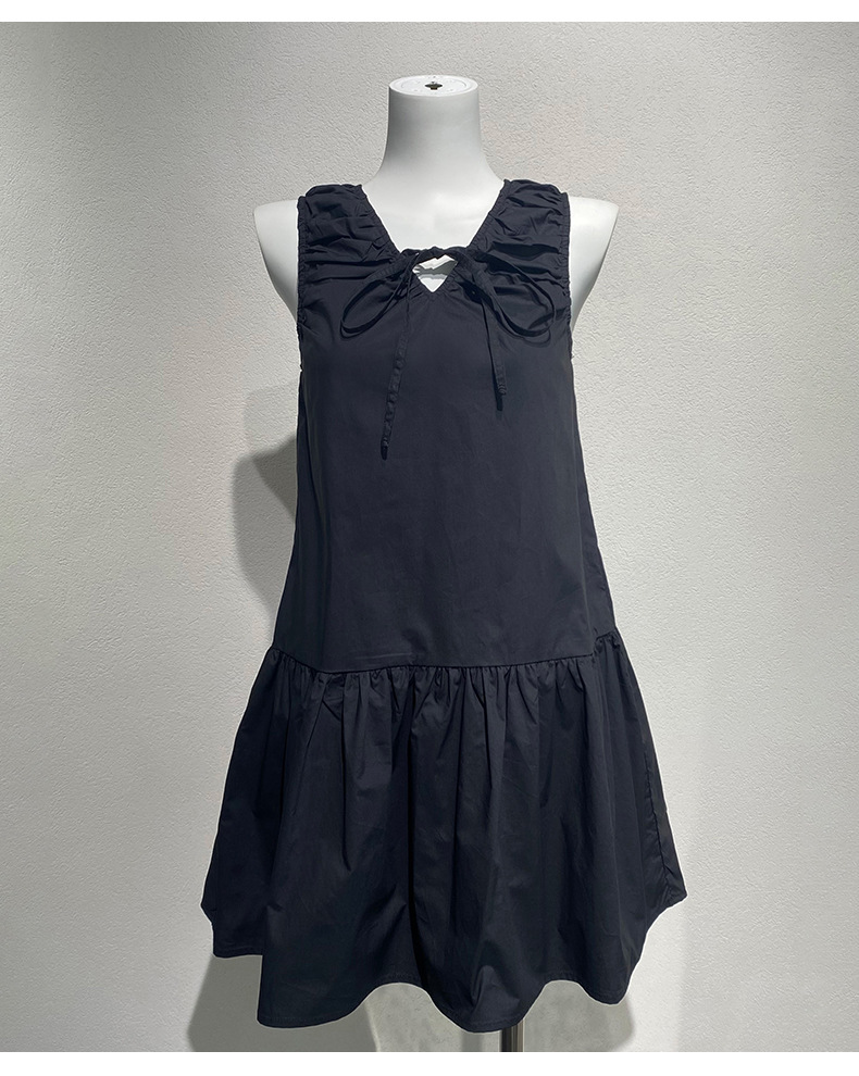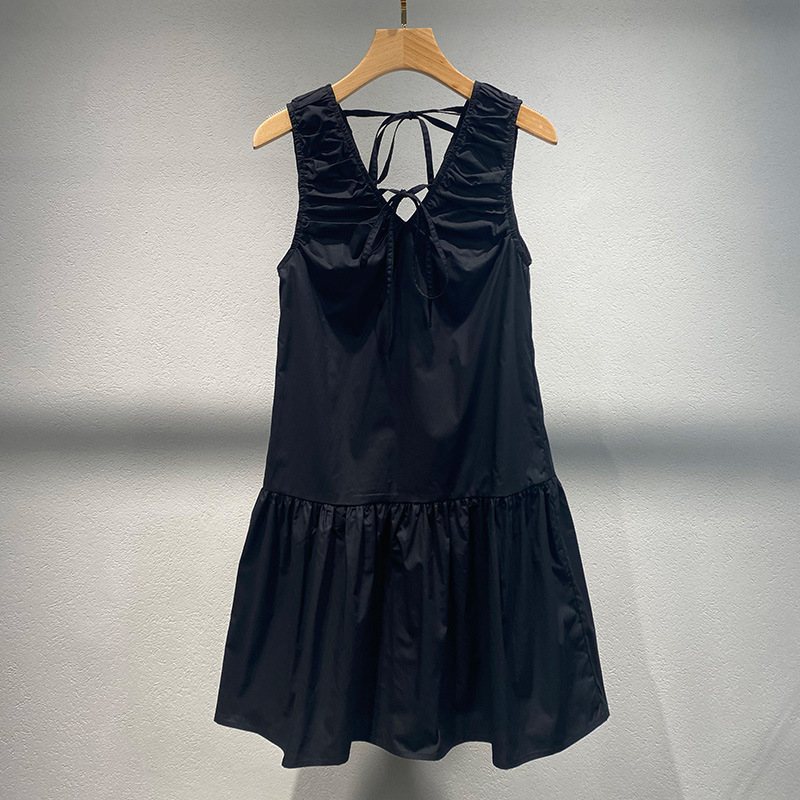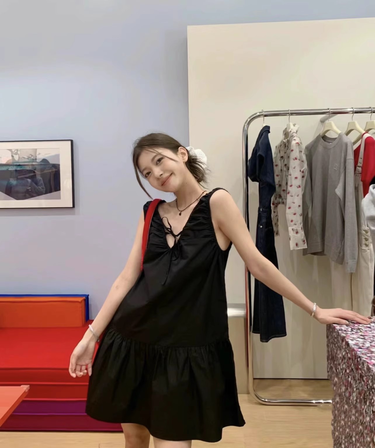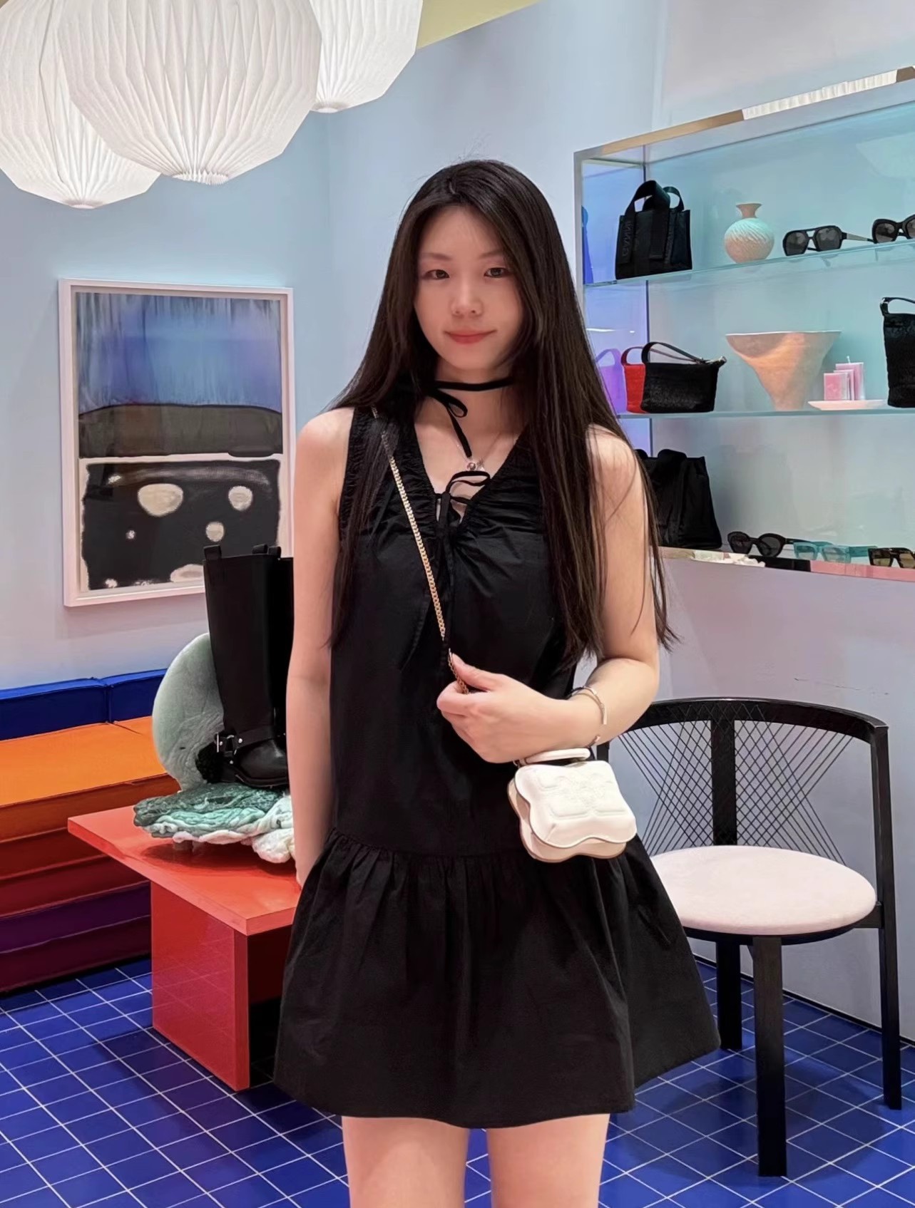 Xiaozhong 2024 여름 새로운 블랙 V 넥 슬림 핏 레이스 업 민소매 짧은 원피스 여성