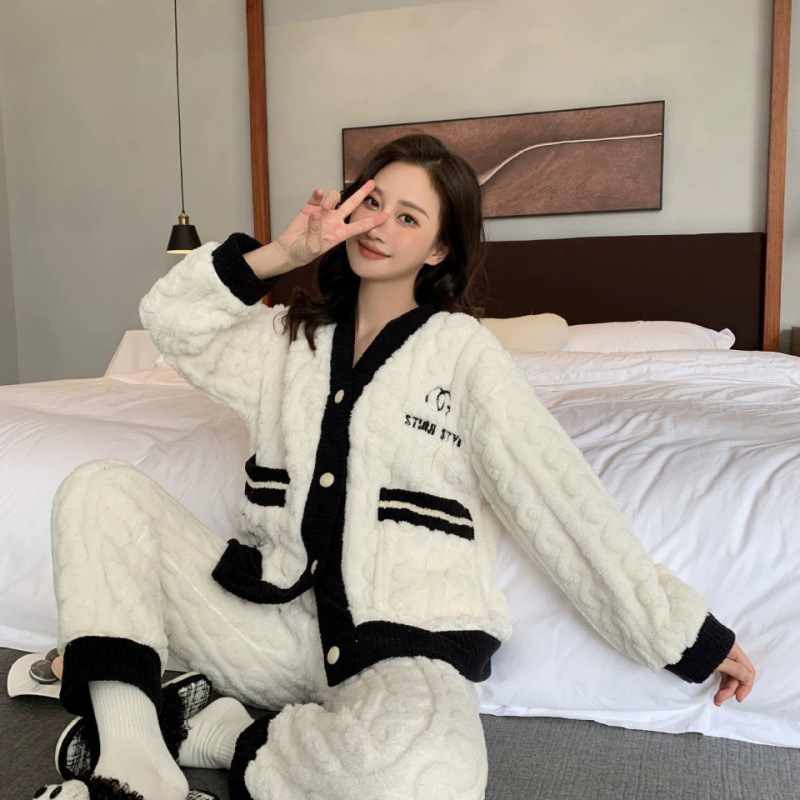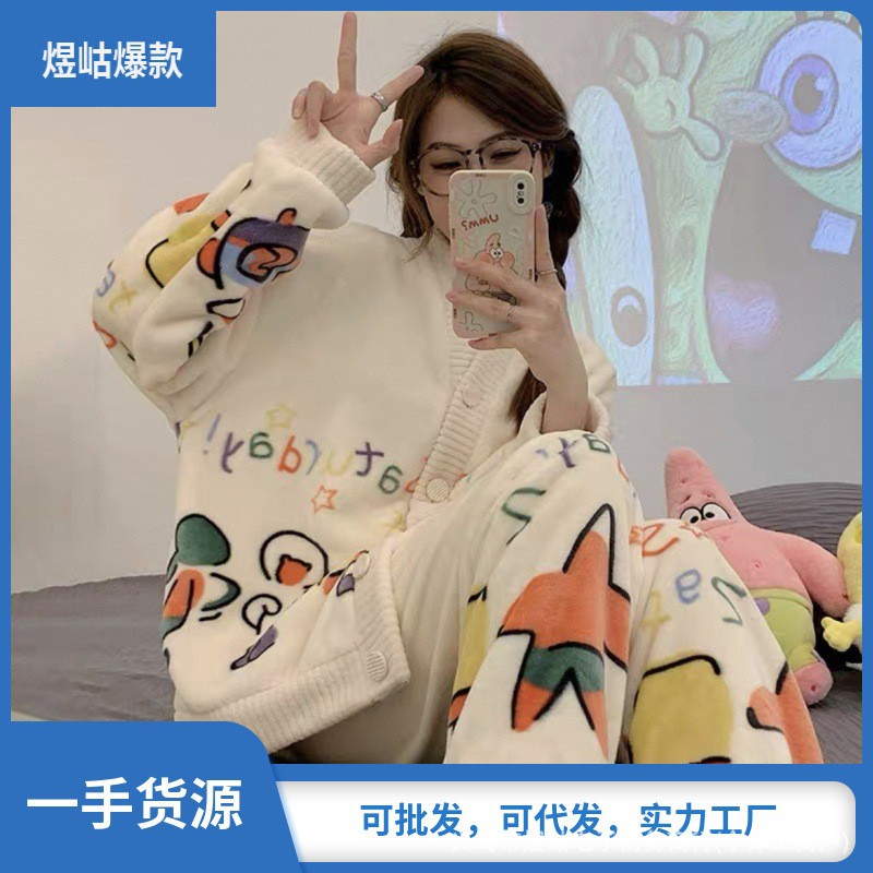 가을 겨울 잠옷 여성의 높은 가치 기모 두껍게 따뜻한 느슨한 외부 착용 홈 의류 세트 산호 양털 새로운