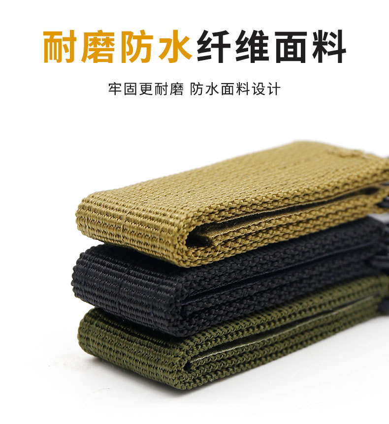 整体采用双层加厚织带,搭配强力弹簧扣,坚固耐用,可搭配普通腰带,战术腰带,战术背包使用,是强大的molle系统扩展装备。