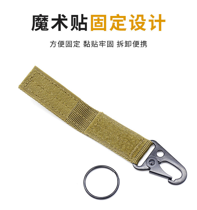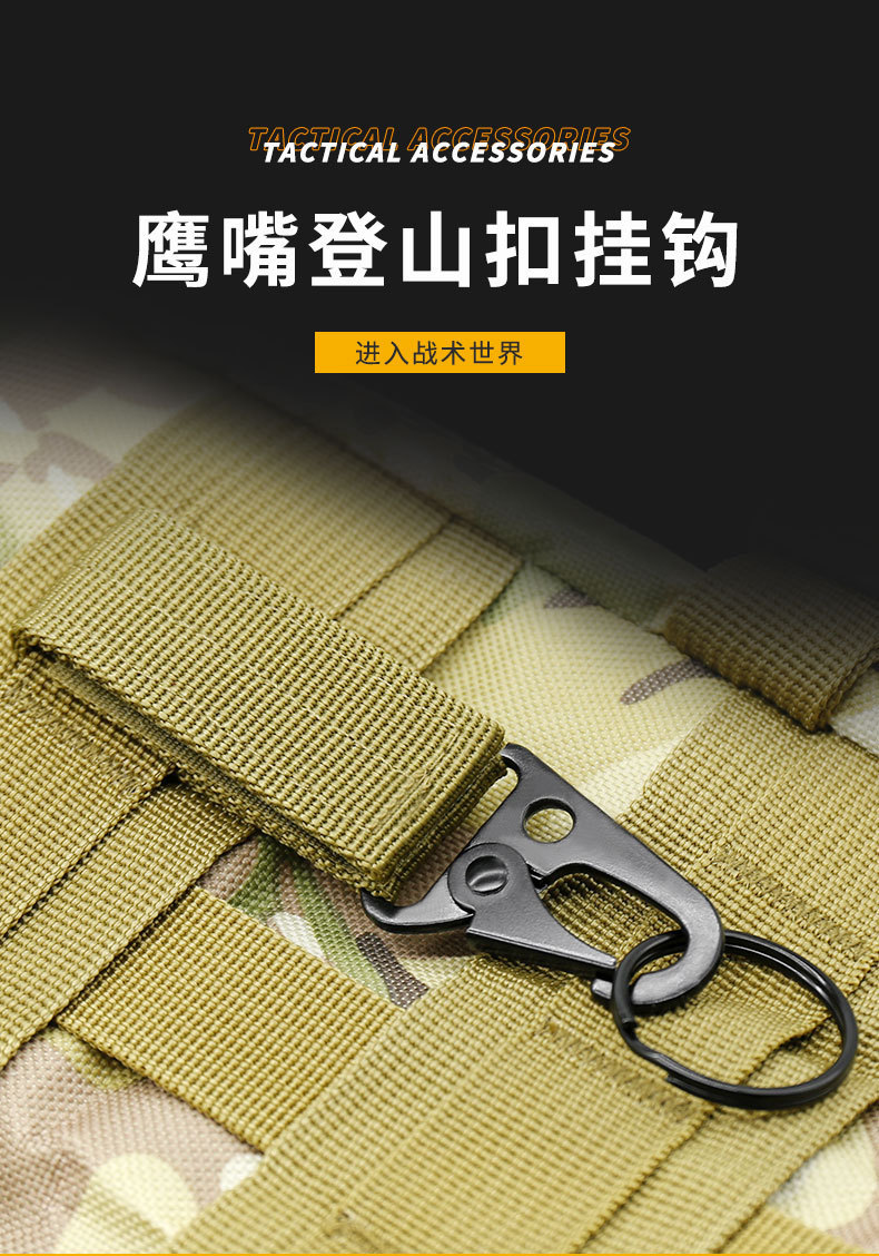 功能:多功能molle,织带挂扣,可挂多串钥匙,搭载强力魔术贴,也可佩挂在户外背包上,双层面料更加厚实,加厚鹰嘴扣更加牢固,使用者可以加强紧挂在腰带或者战术背心织带上面,不用担心脱落。一物多用,是户外运动中不错的选择!