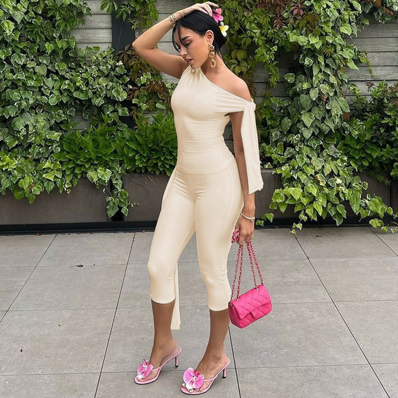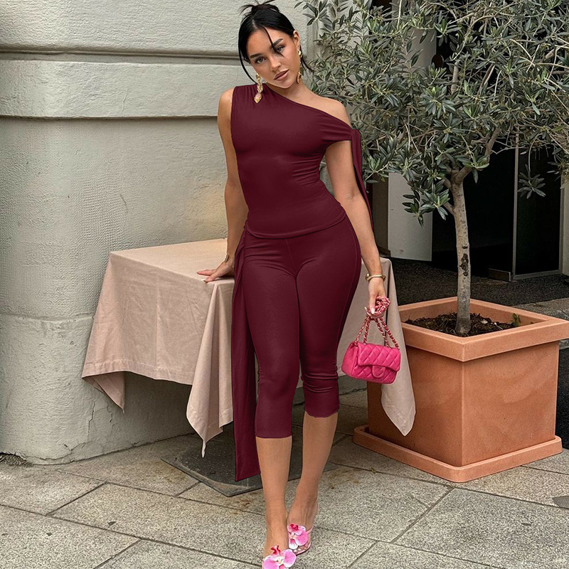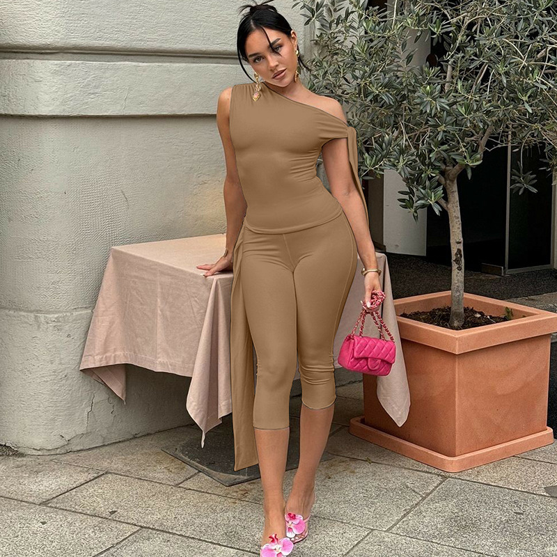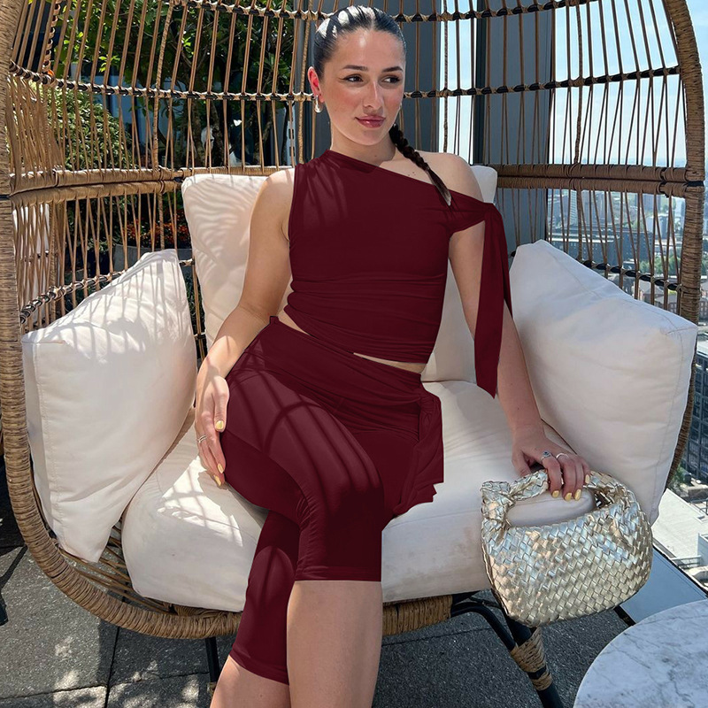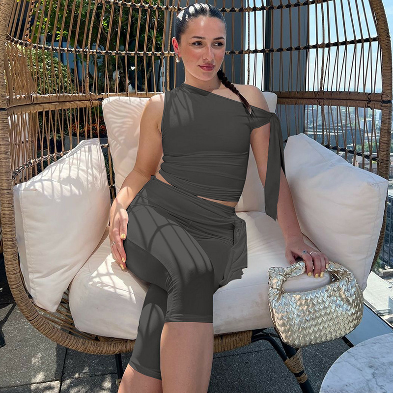 유럽 및 미국 여성복 2025 여름 신상 패션 스트리트 스타일 사선 넥라인 민소매 탑 슬림핏 레이스업 반바지 세트 도매