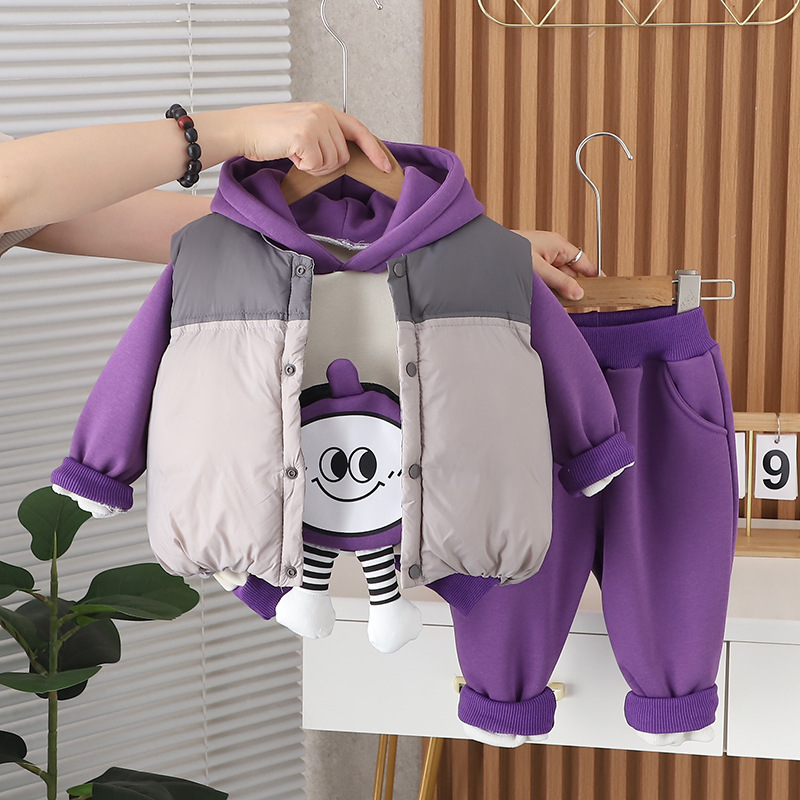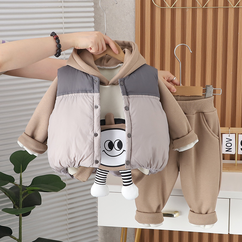 소년 겨울 옷 겨울 기모 두꺼운 면화 패딩 옷 2024 새로운 아기 어린이 컬러 매칭 조끼 후드 스웨트 셔츠 3 피스 세트