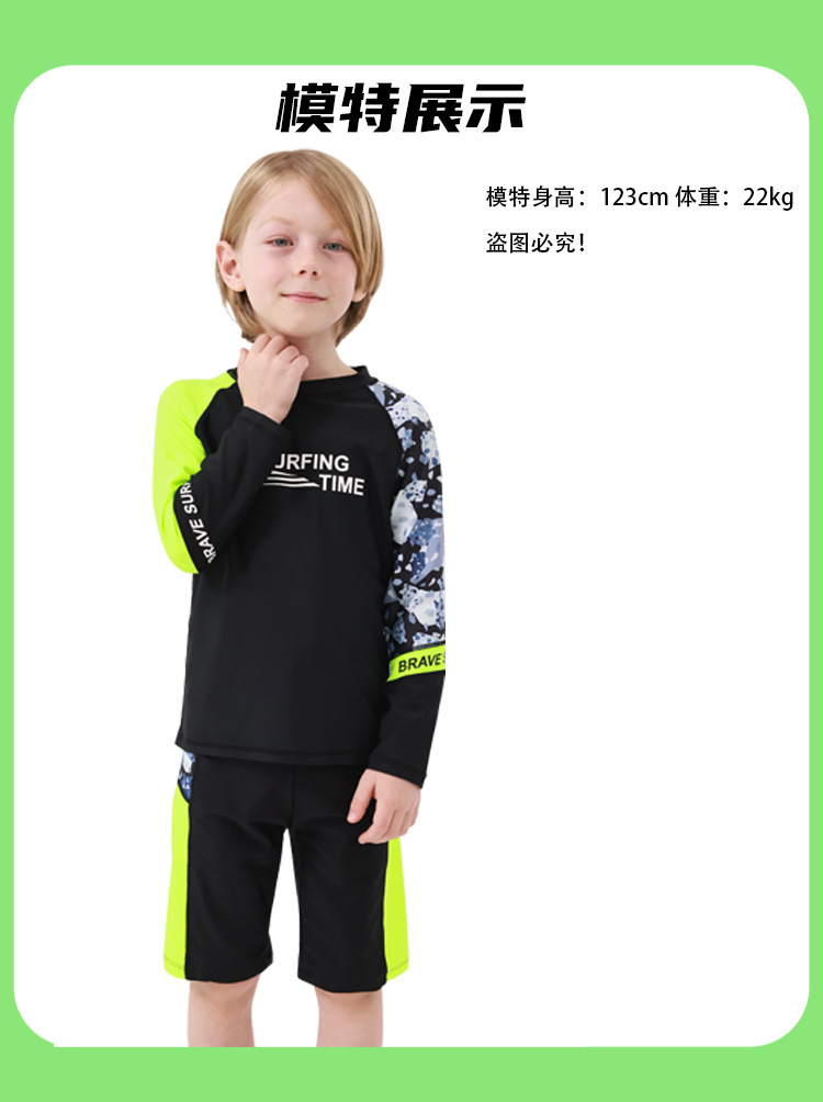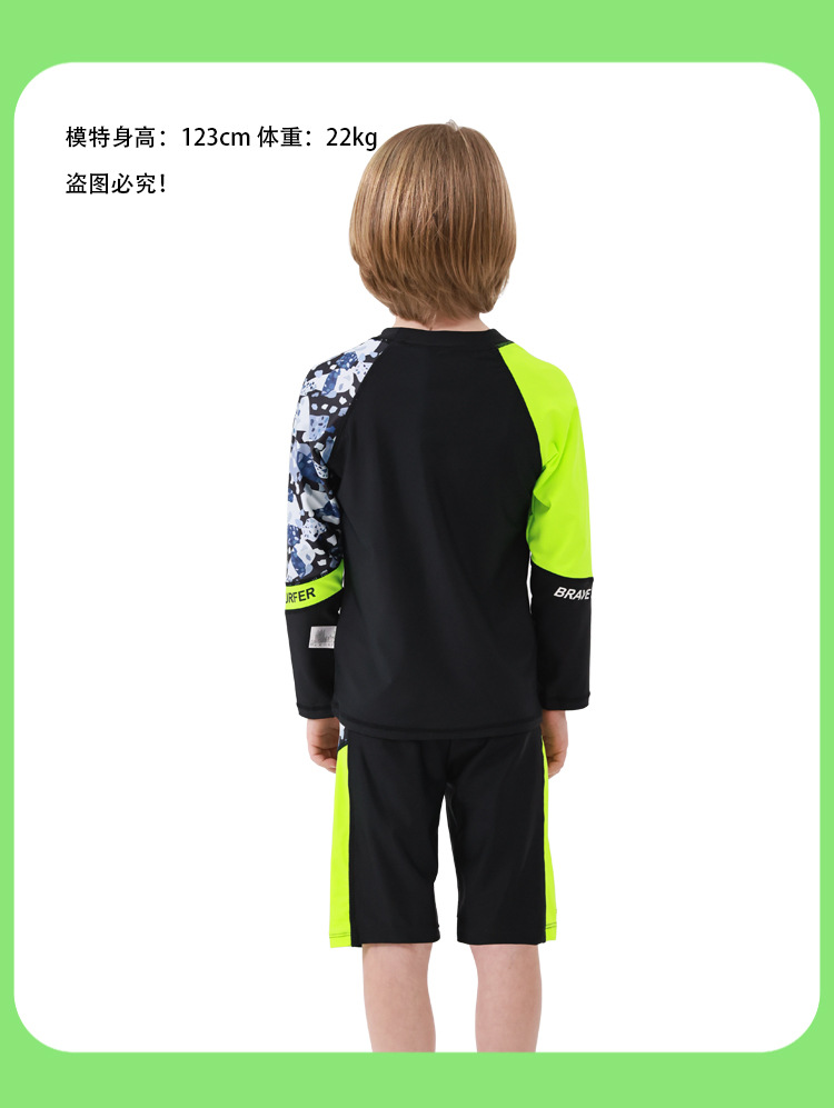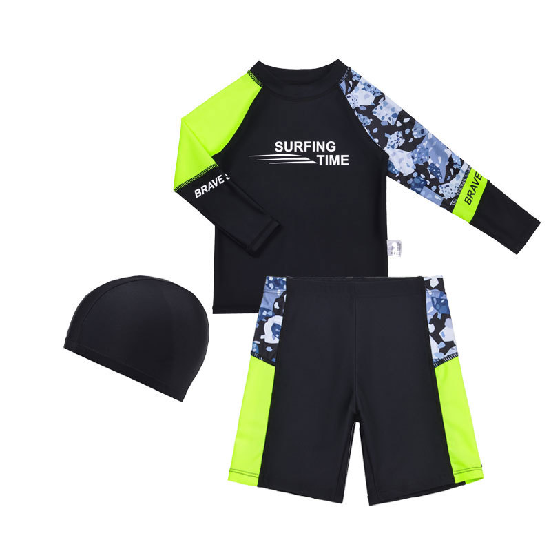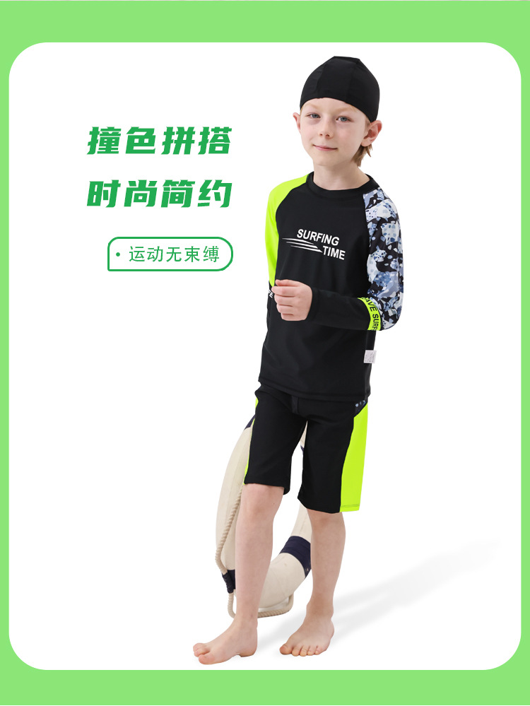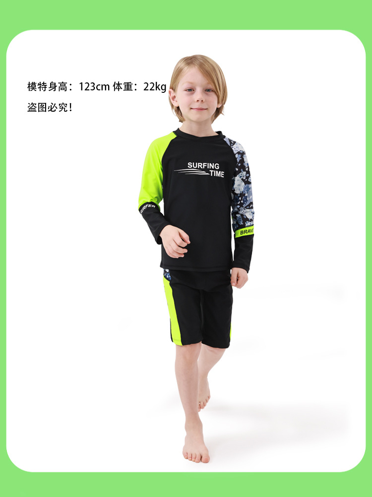 어린이 수영복 소년의 새로운 긴 소매 빠른 건조 태양 보호 중형 및 대형 어린이 형광 반바지 수영복 아기 소년의 수영복