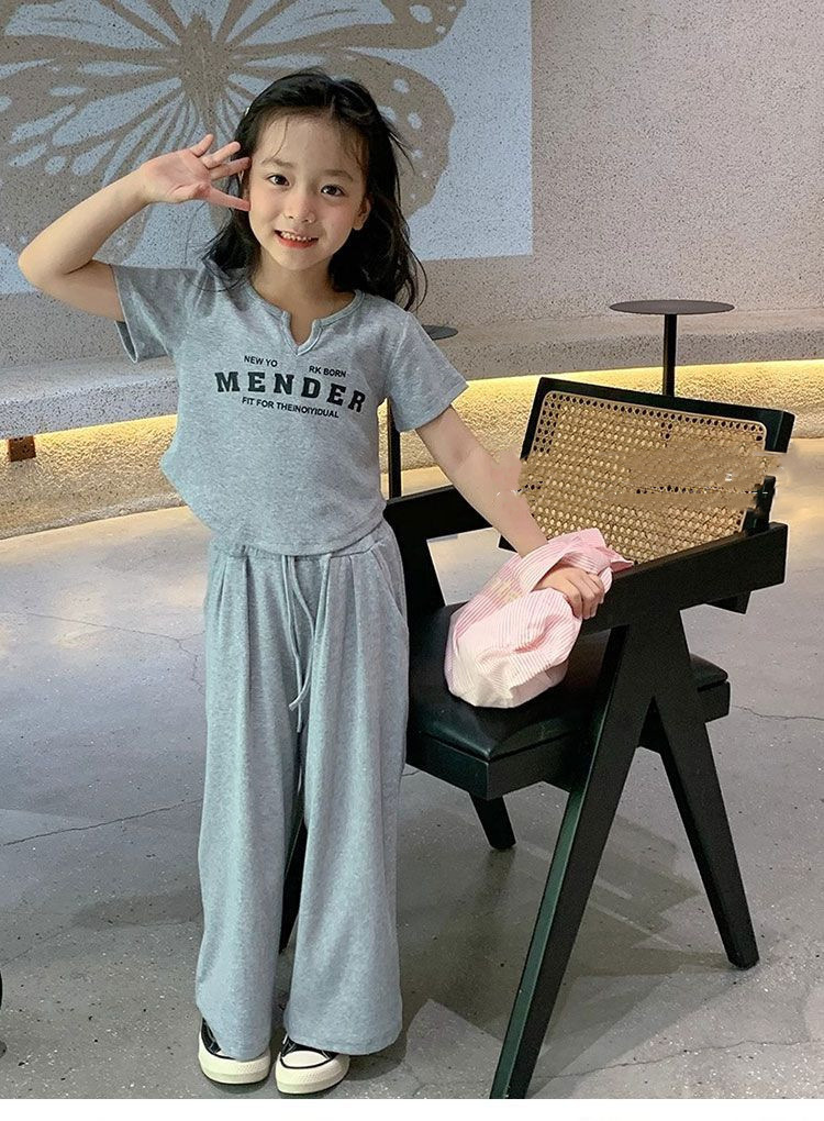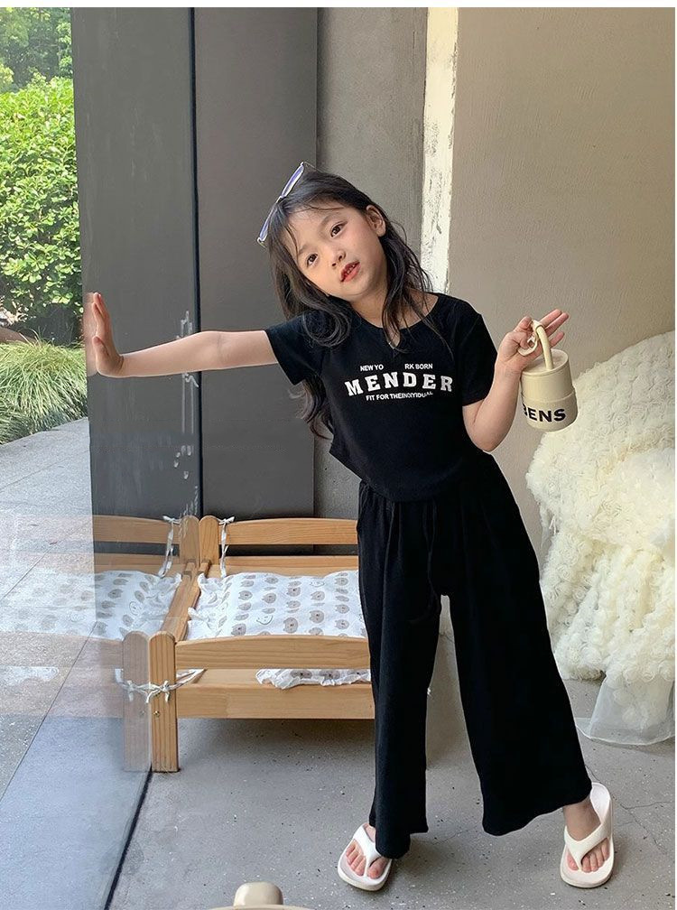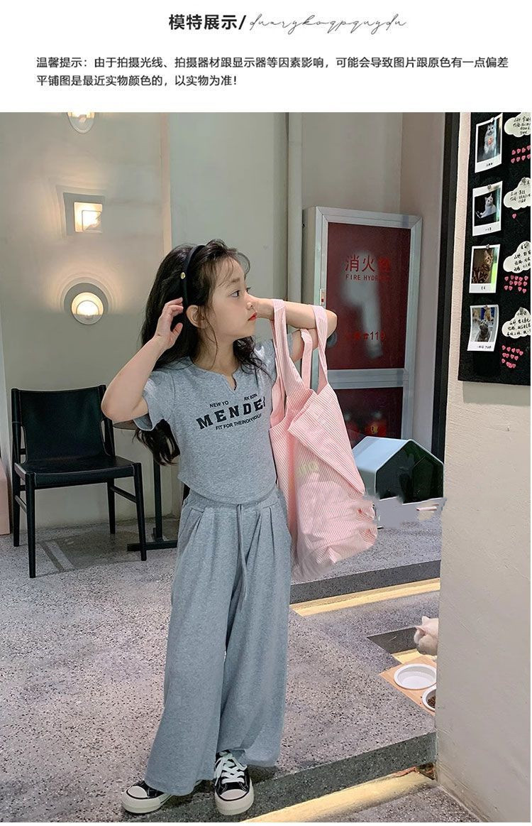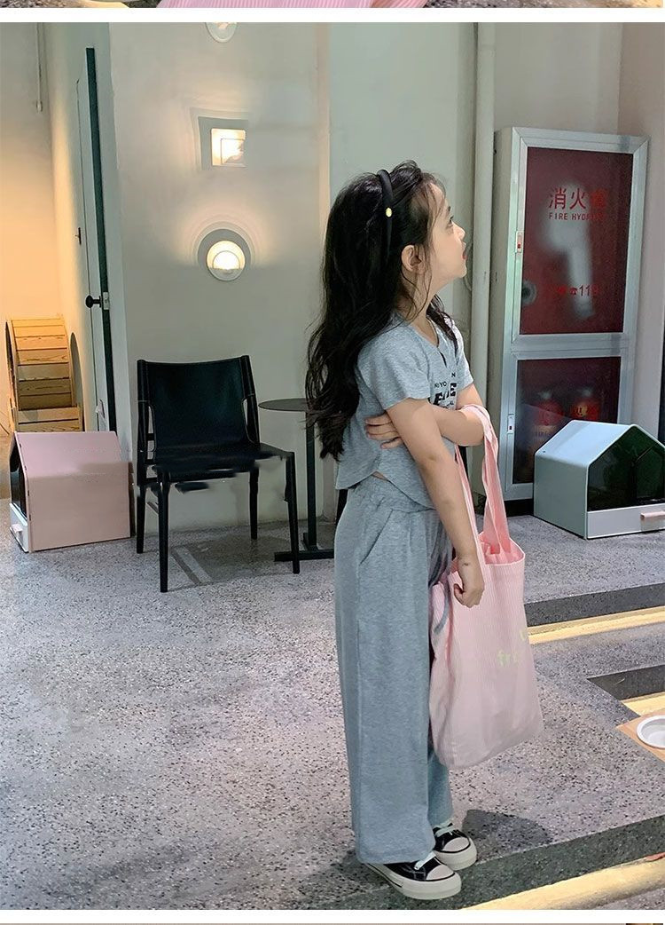 여자 여름 서양식 세트 여름 2024 새로운 어린이 반팔 티셔츠 넓은 다리 바지 패션 캐주얼 2 조각 세트스토어 가기