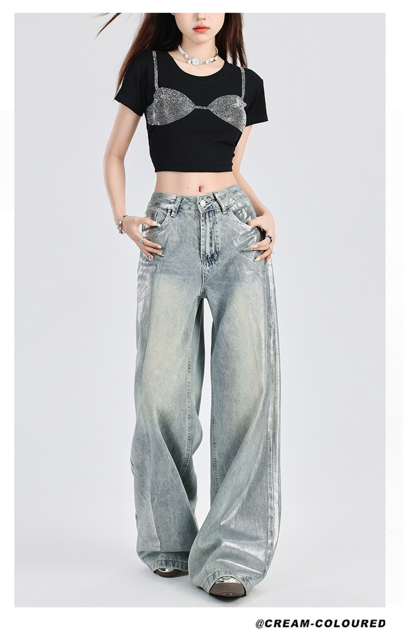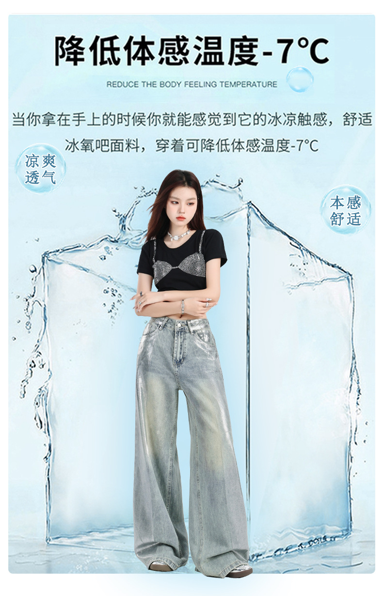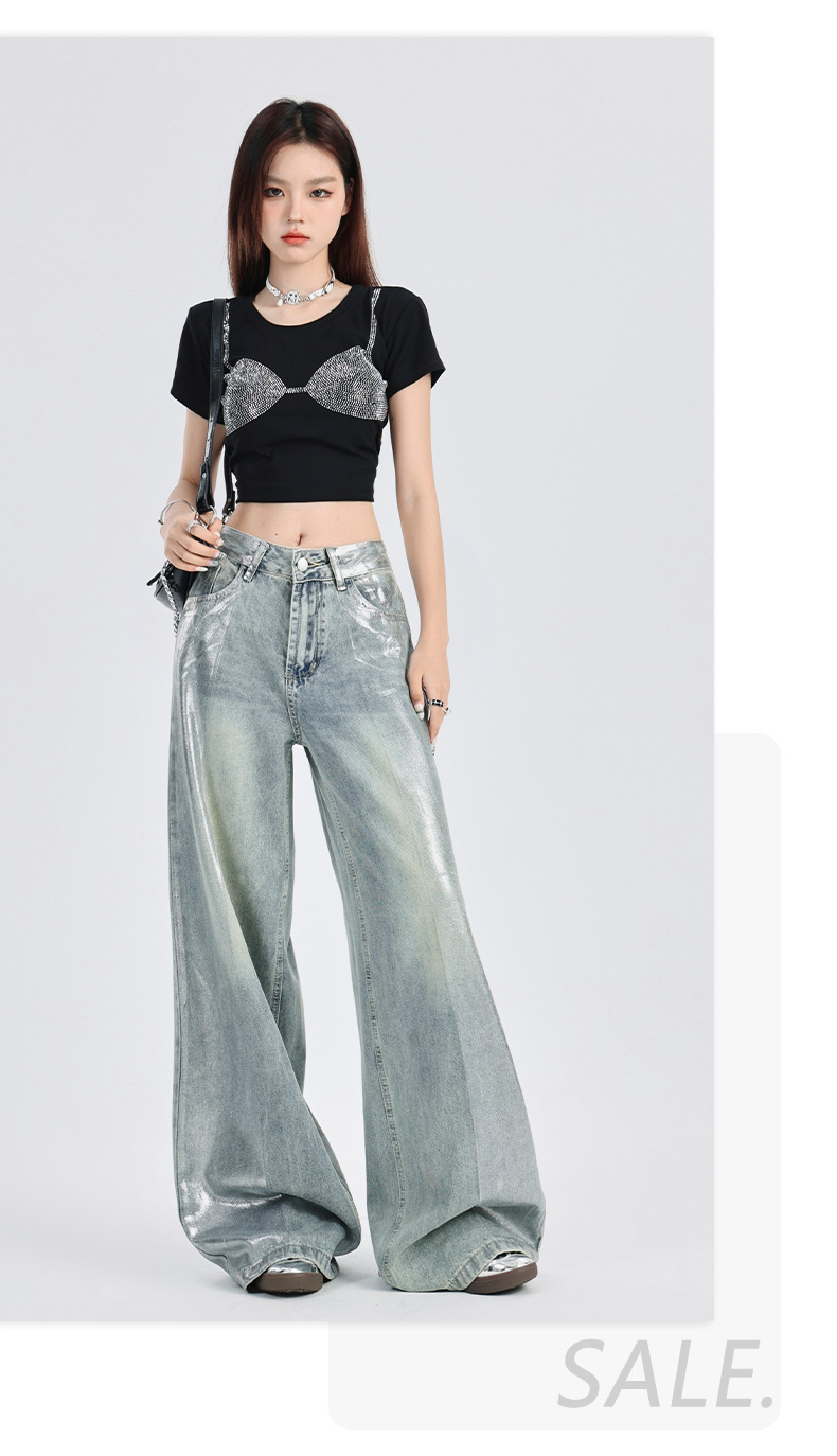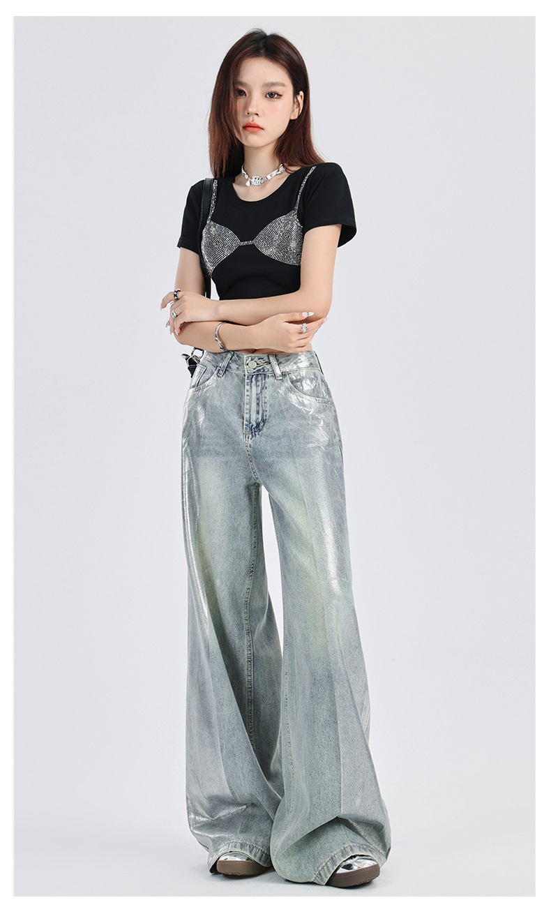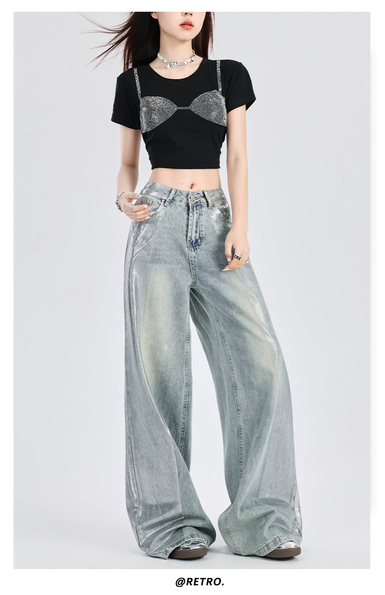 뜨거운 실버 높은 허리 텐셀 와이드 레그 청바지 여성 여름 새로운 미국 틈새 배 모양의 피규어 딥 바지스토어 가기