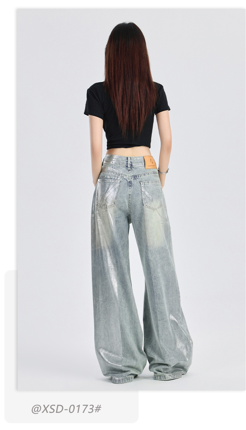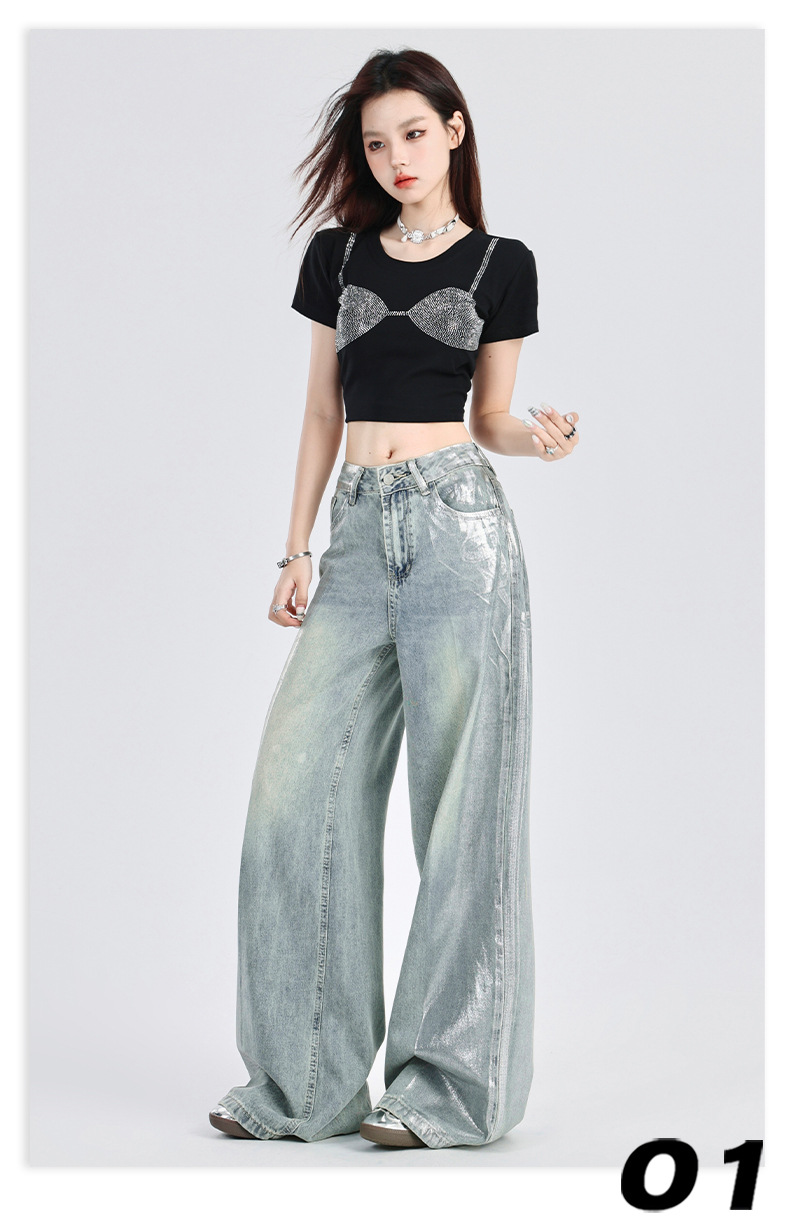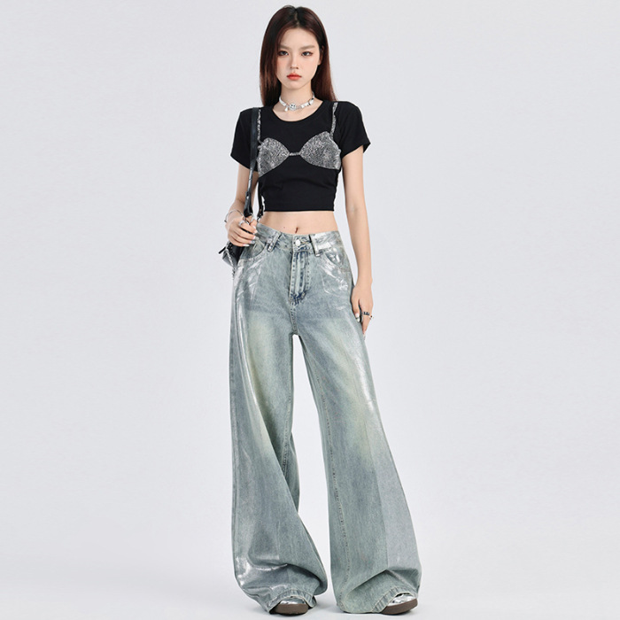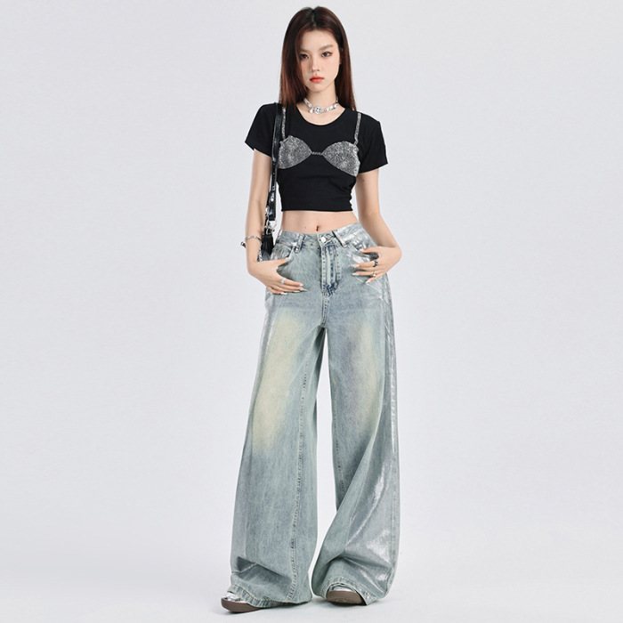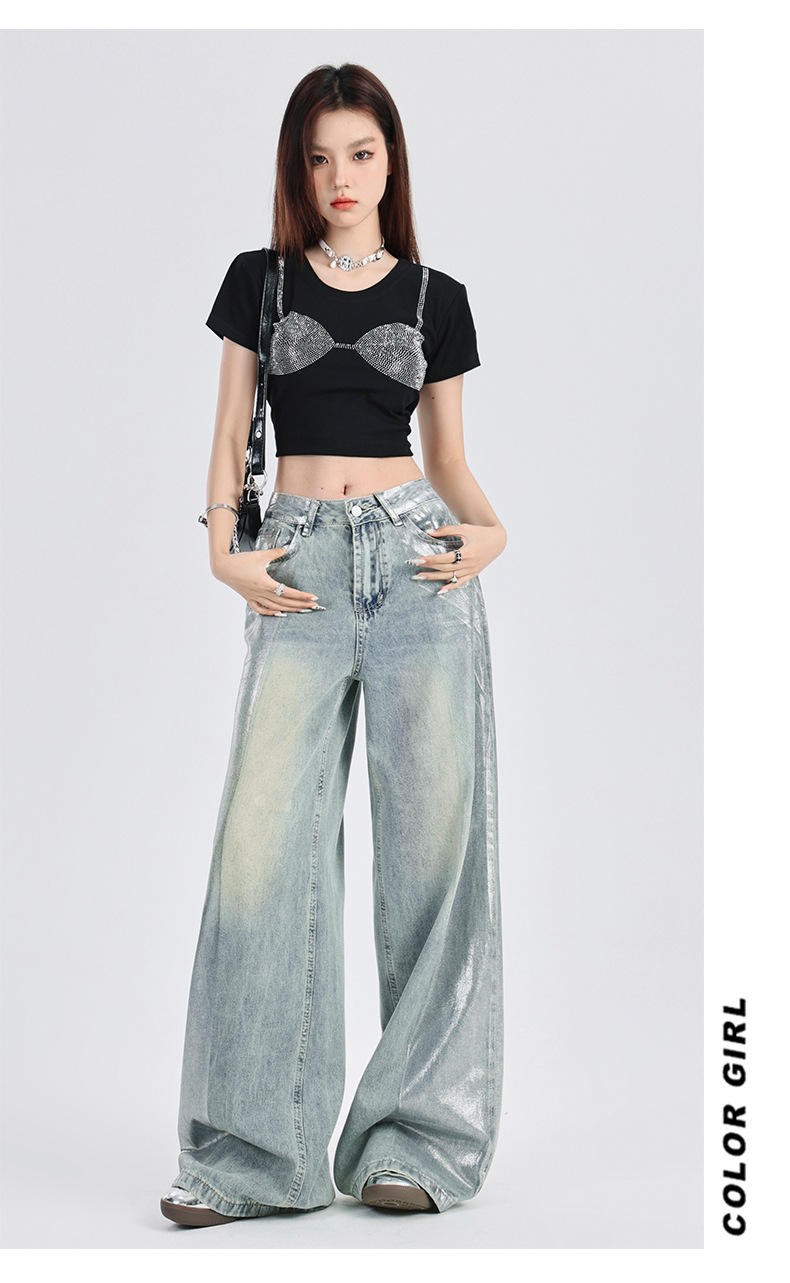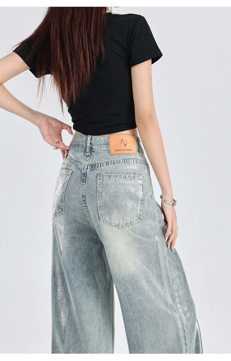 뜨거운 실버 높은 허리 텐셀 와이드 레그 청바지 여성 여름 새로운 미국 틈새 배 모양의 피규어 딥 바지스토어 가기