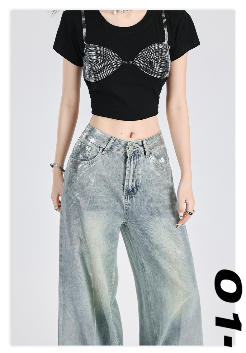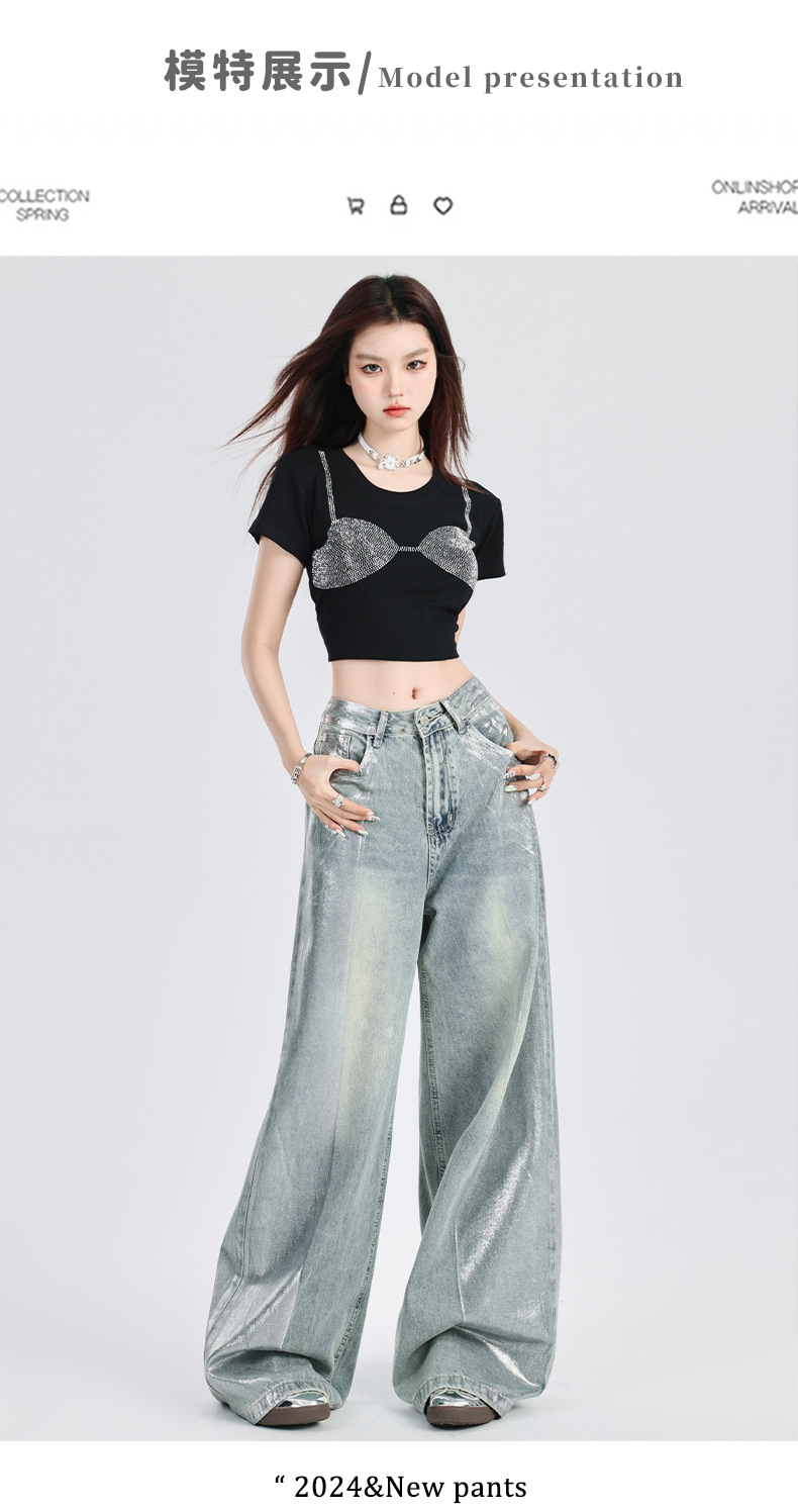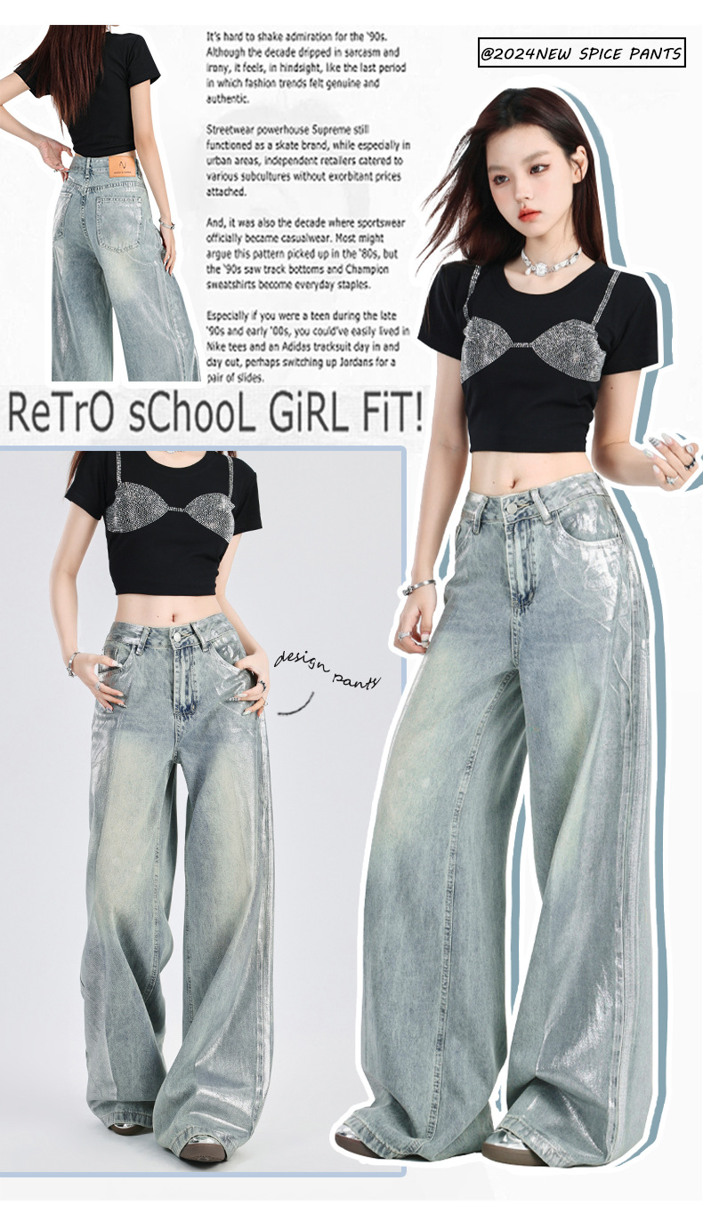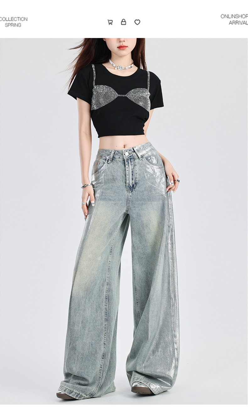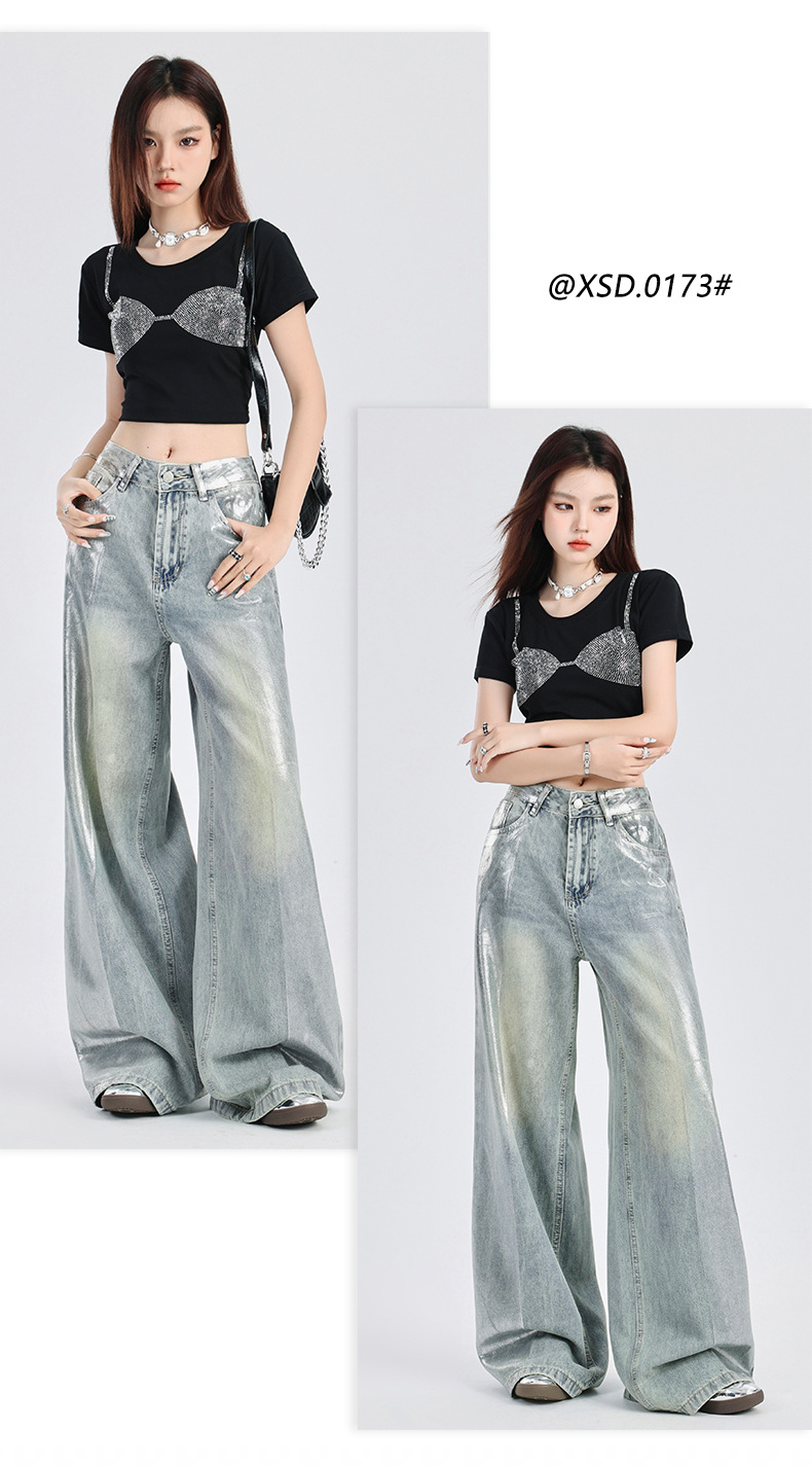 뜨거운 실버 높은 허리 텐셀 와이드 레그 청바지 여성 여름 새로운 미국 틈새 배 모양의 피규어 딥 바지스토어 가기