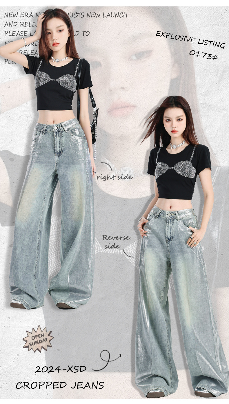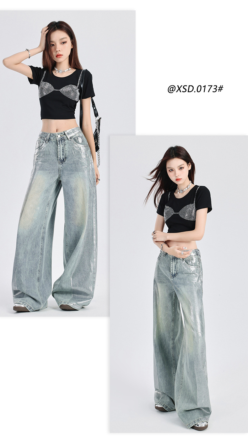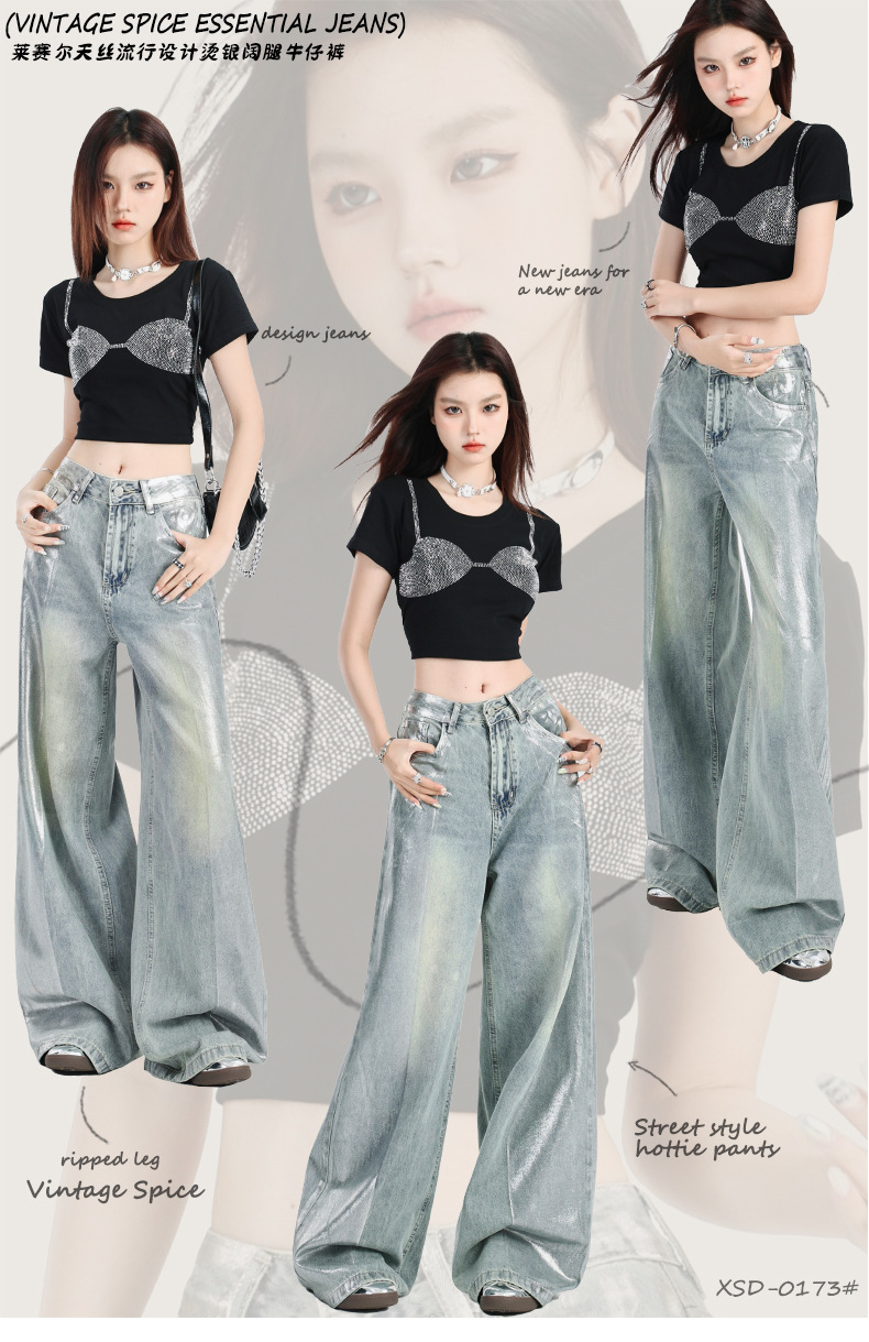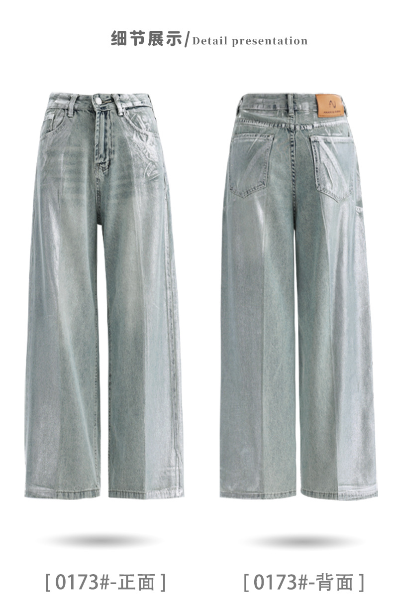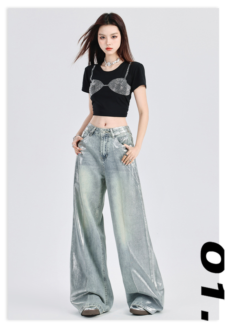 뜨거운 실버 높은 허리 텐셀 와이드 레그 청바지 여성 여름 새로운 미국 틈새 배 모양의 피규어 딥 바지스토어 가기