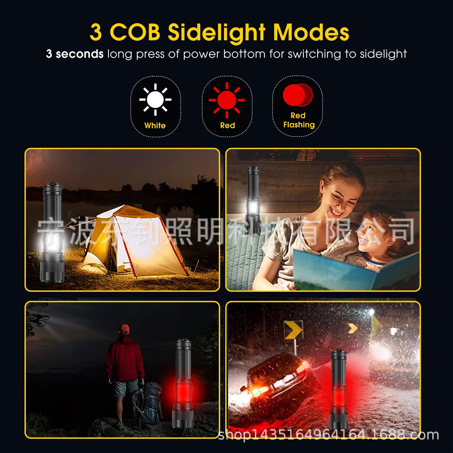 照明模式:单击开关前灯强-弱-闪。双击开关;COB白光强-弱-闪 红光亮*-闪