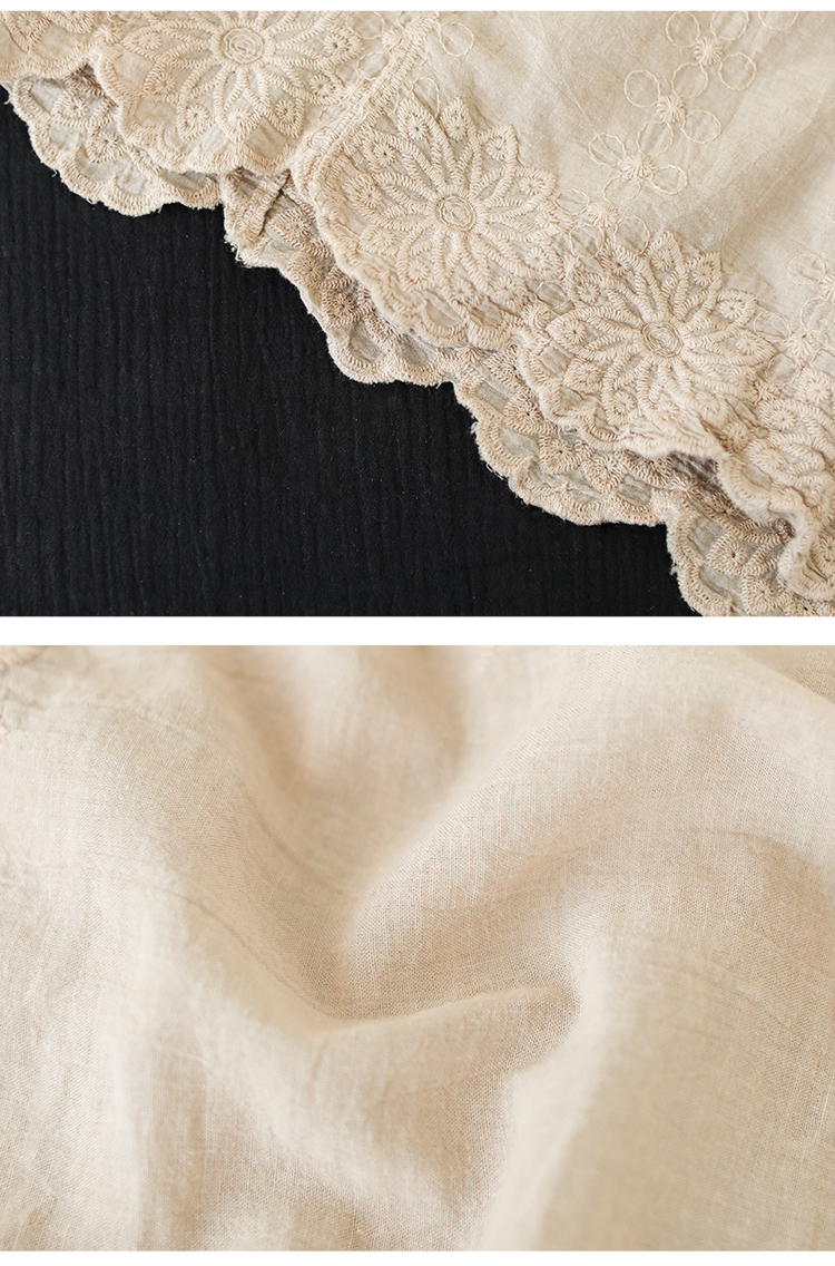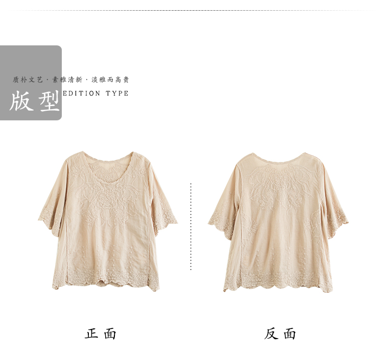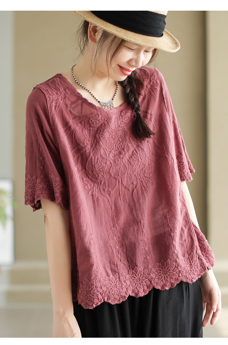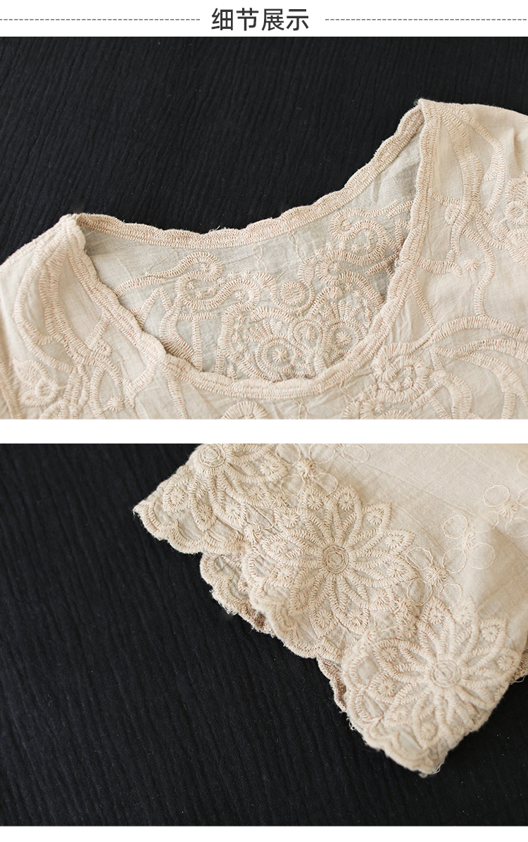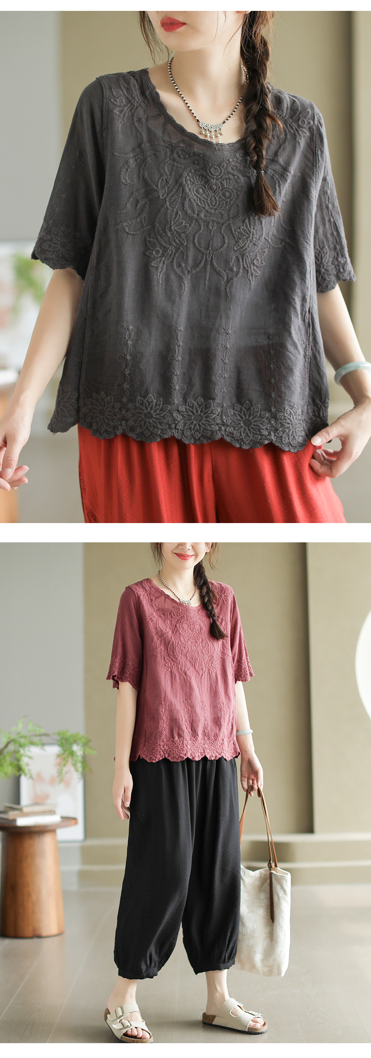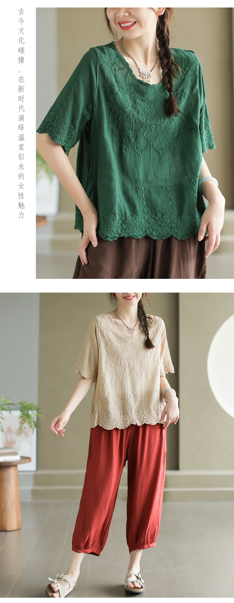 예술적 레트로 볶은 컬러 코튼 자카드 미드 슬리브 티셔츠 여성용 여름 새로운 솔리드 컬러 풀오버스토어 가기