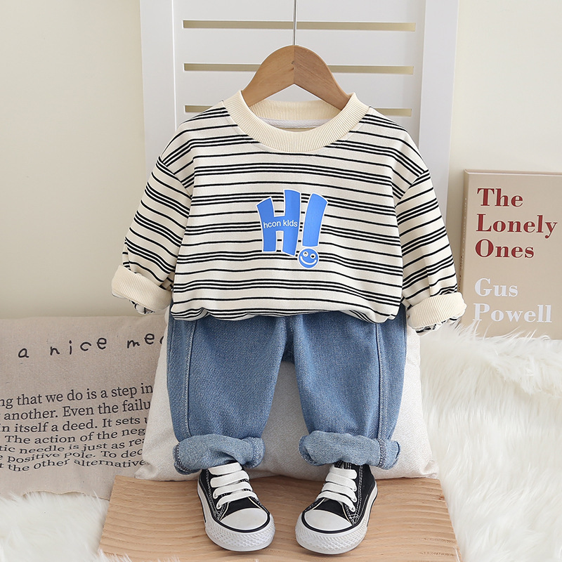 남학생 가을 의류 세트 2024 새로운 어린이 아기의 봄 의류 캐주얼 스트라이프 레터 스웨터 청바지 투피스 세트스토어 가기