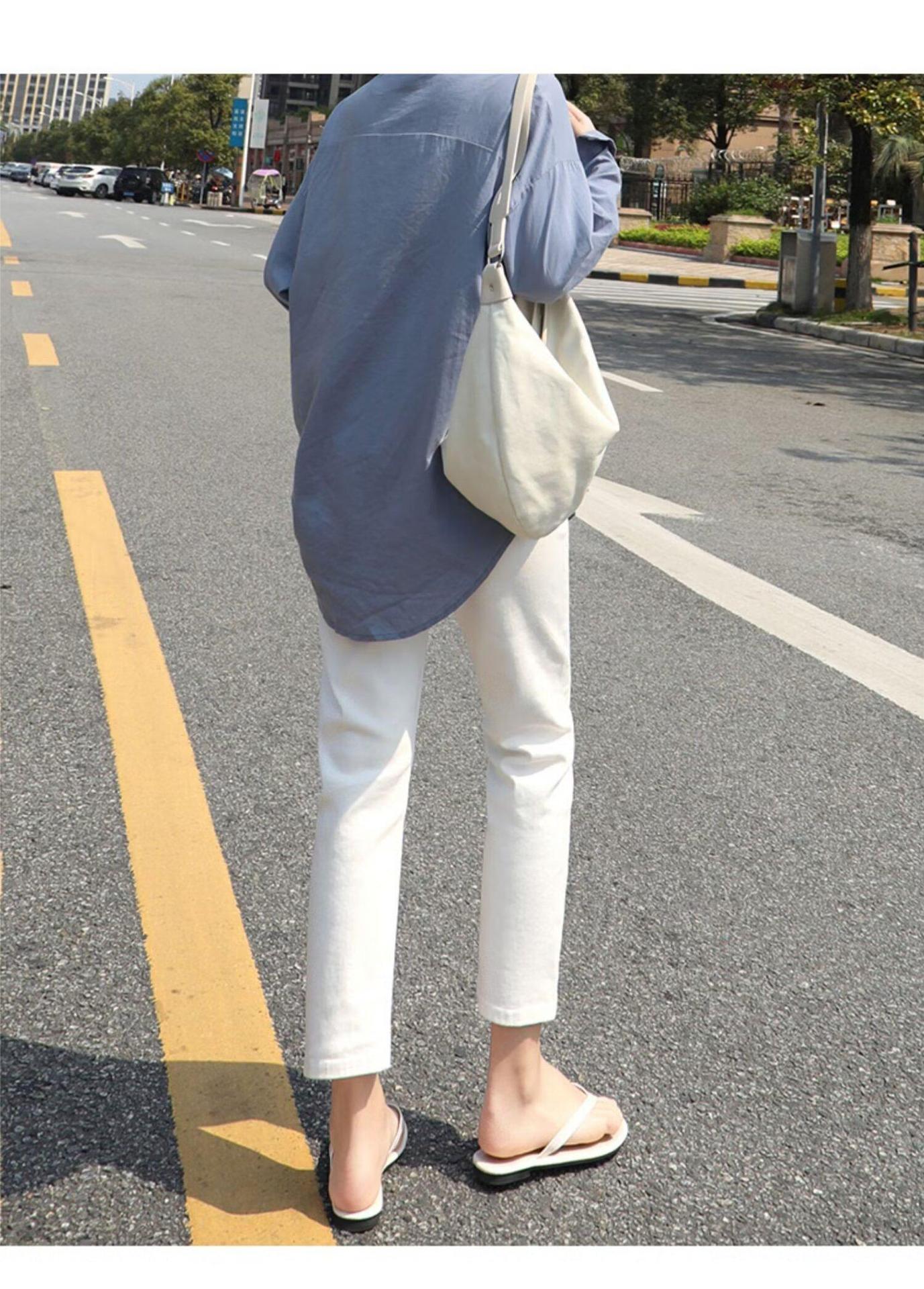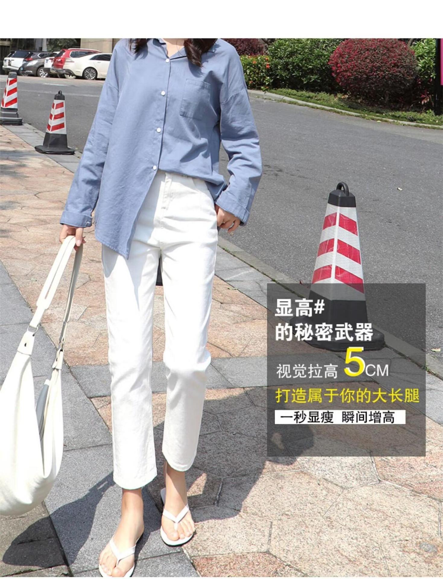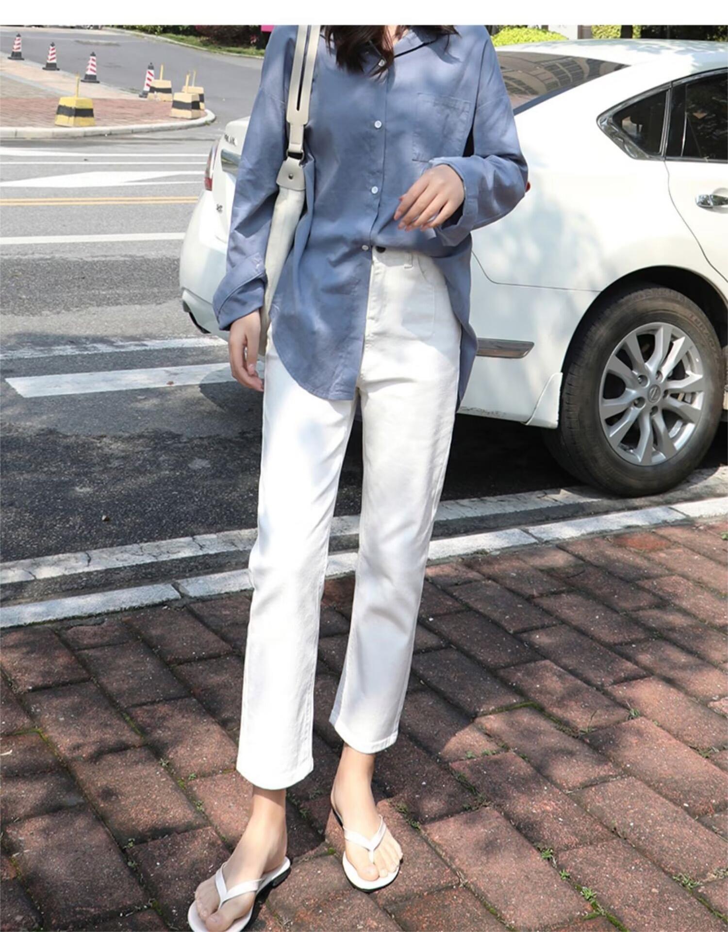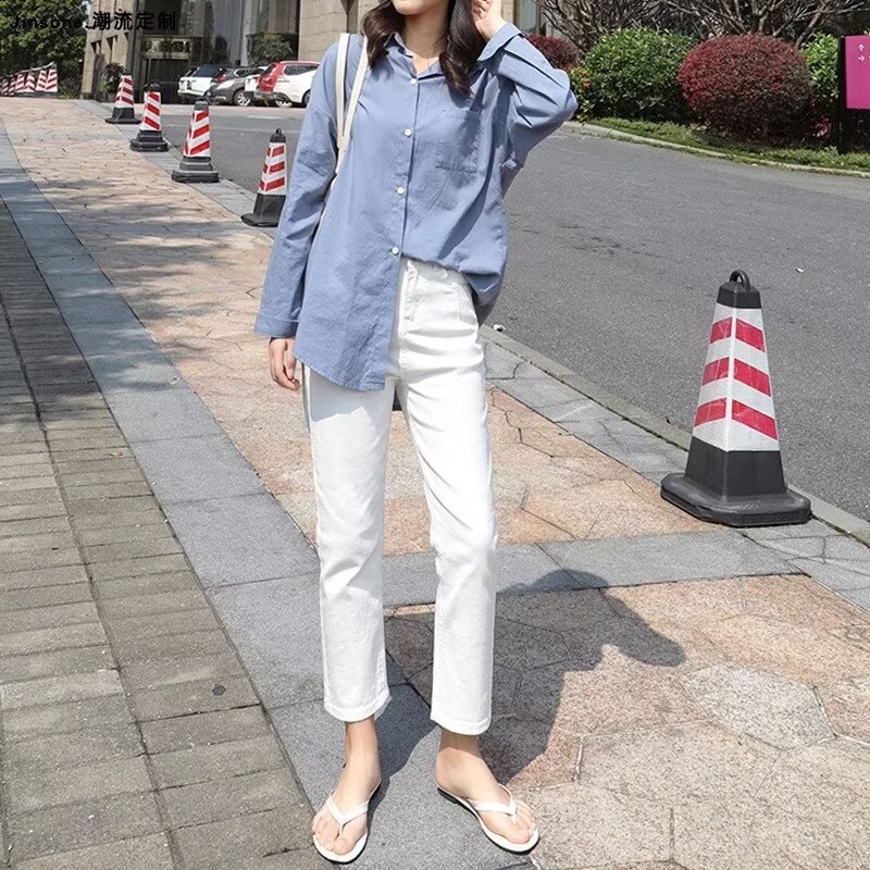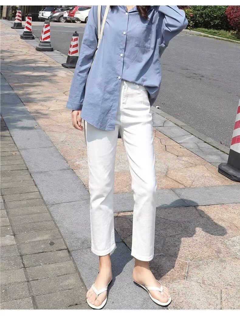 봄 여름 여성을 위한 한국식 하이웨이스트 스트레이트 청바지 새로운 트렌디 브랜드 루즈한 화이트 다용도 슬리밍 담배 파이프 9부 바지스토어 가기