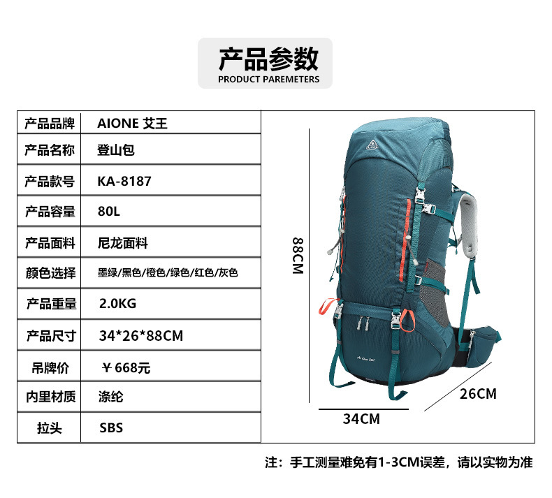 재고 Aiwang 공장 직접 정품 Aiwang 야외 장거리 여행 배낭 대용량 등산 가방 80L
