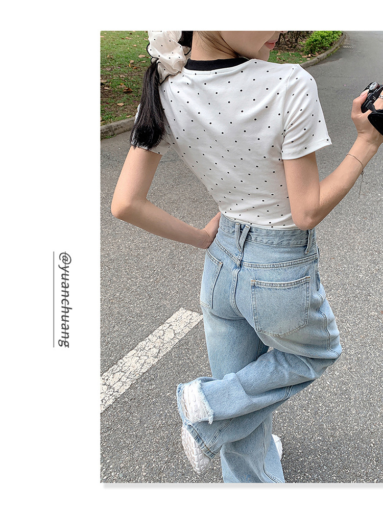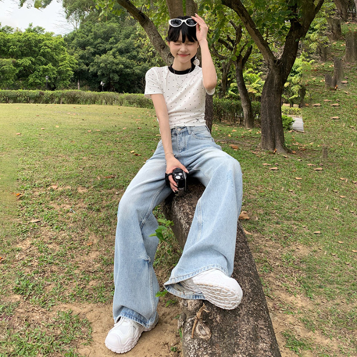 찢어진 와이드 레그 청바지 여자 여름 미국 복고풍 바지 높은 허리 슬리밍 스트레이트 레그프리 마이크로 팬츠