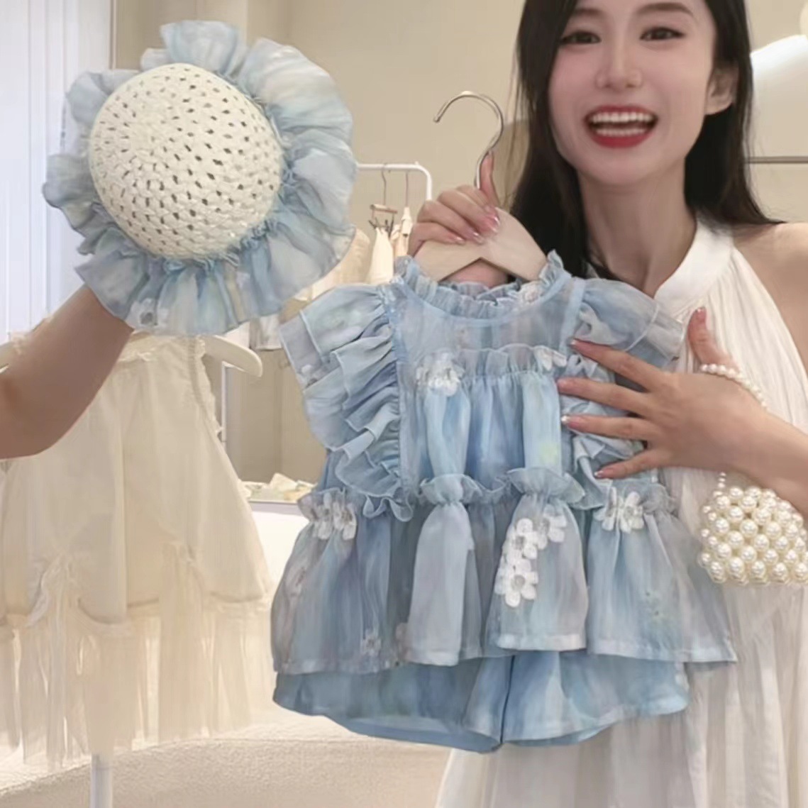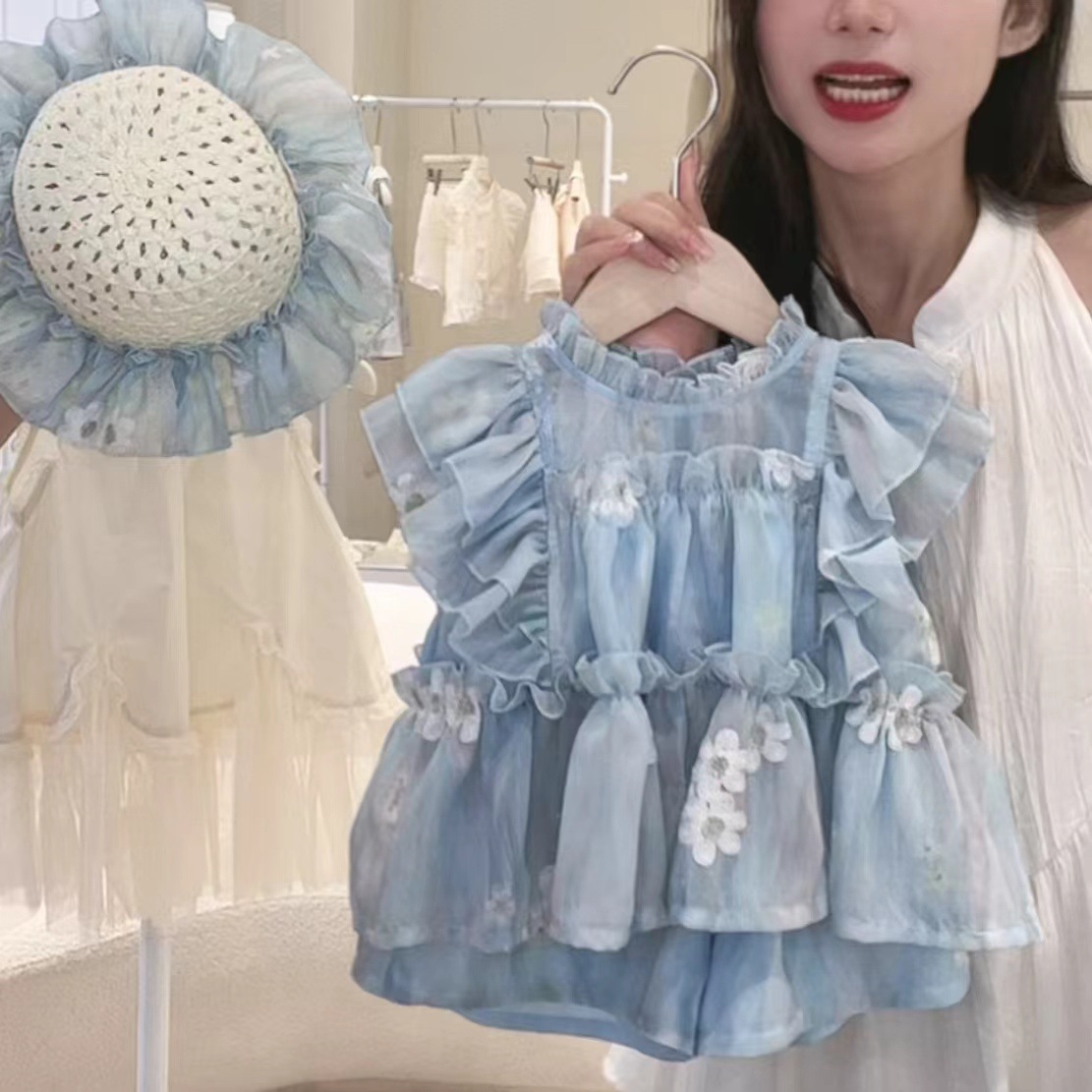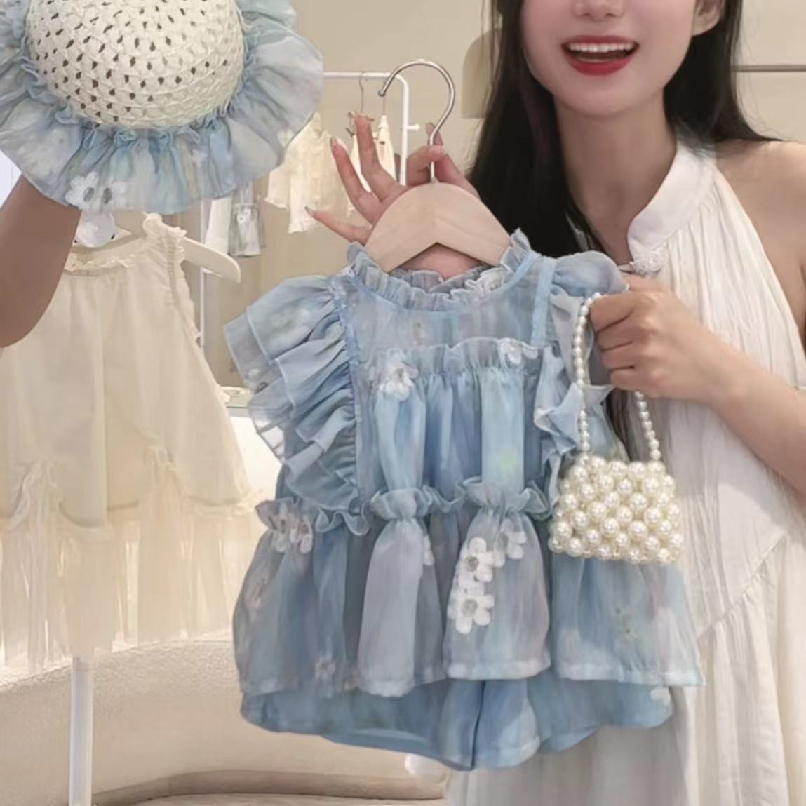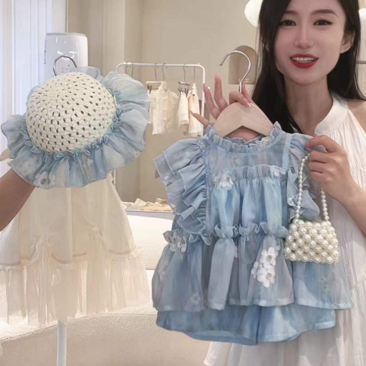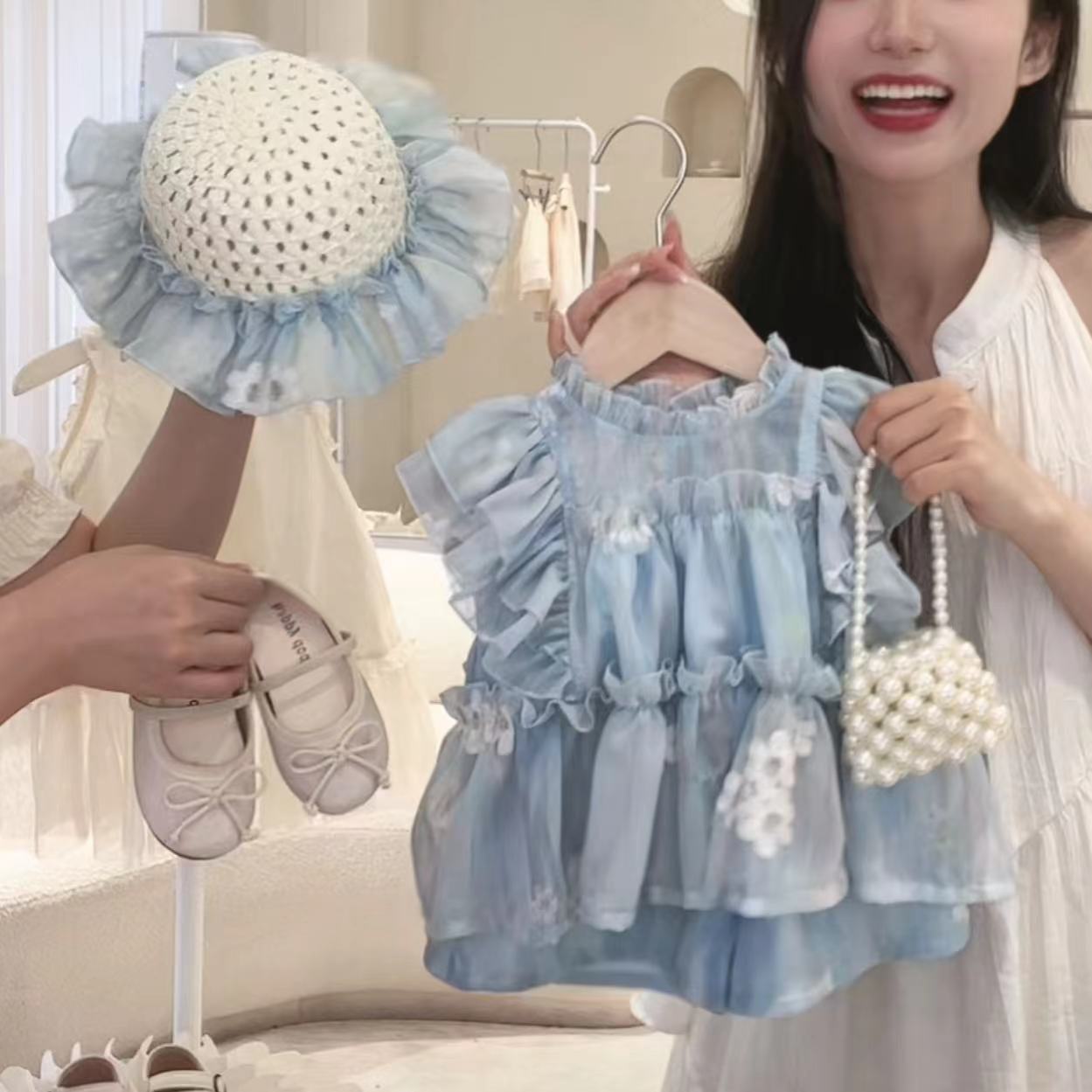 어린이 스타 라운드 한국 스타일 아동복 2025 신상 여름 여아 플라잉 슬리브 베이비돌 셔츠 아동 패션 얇은 투피스 세트 트렌디스토어 가기