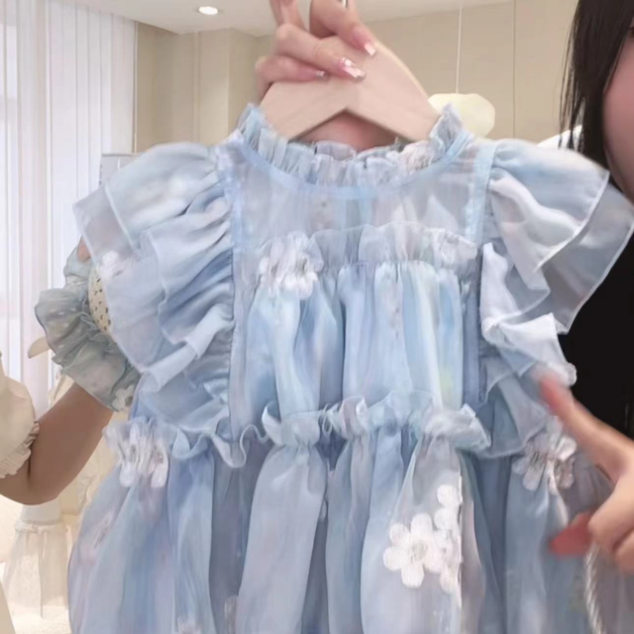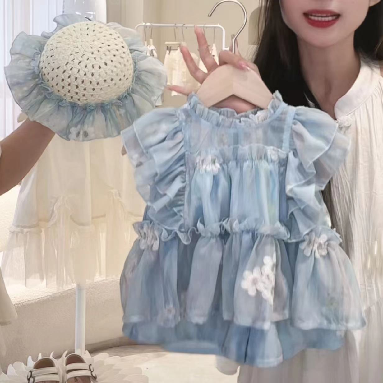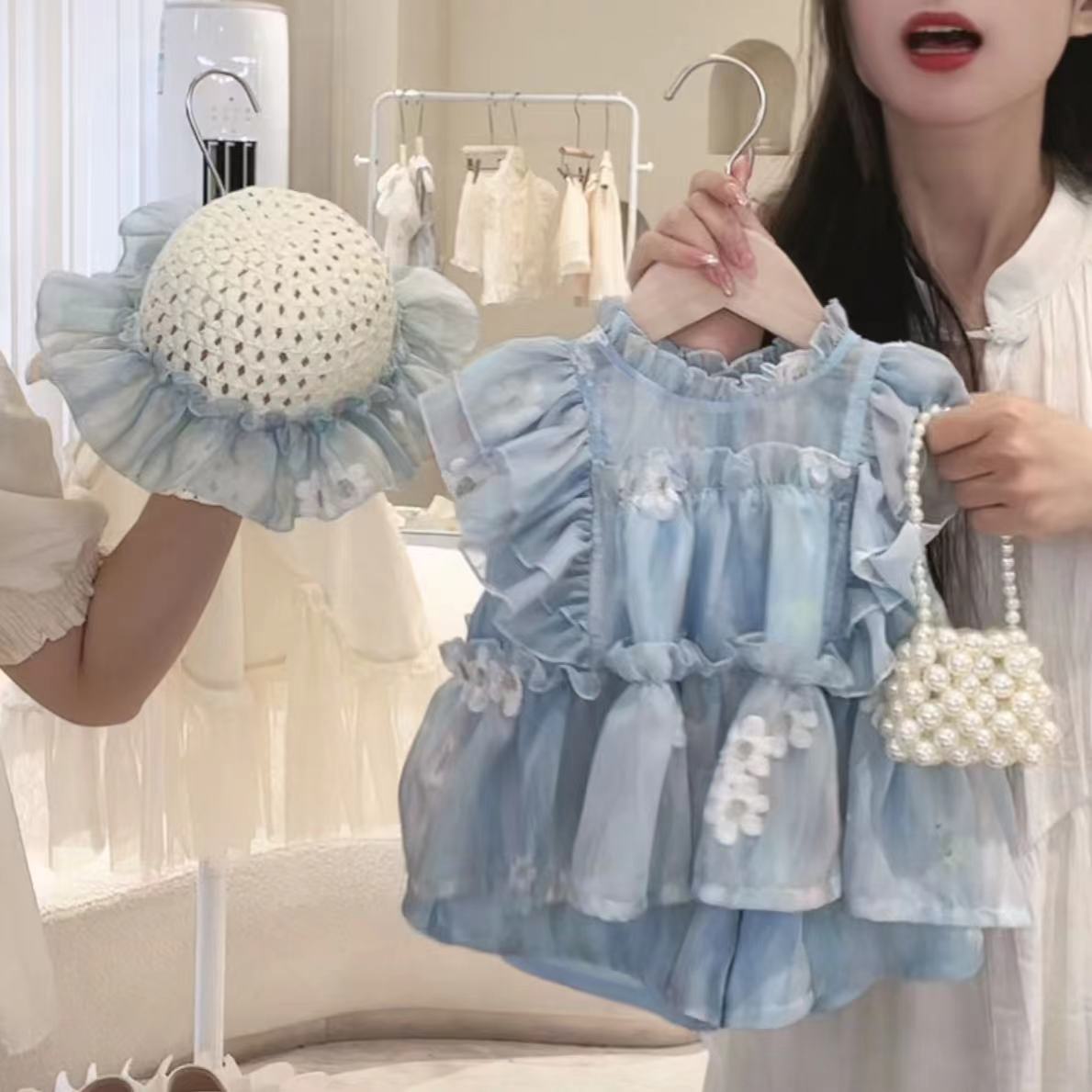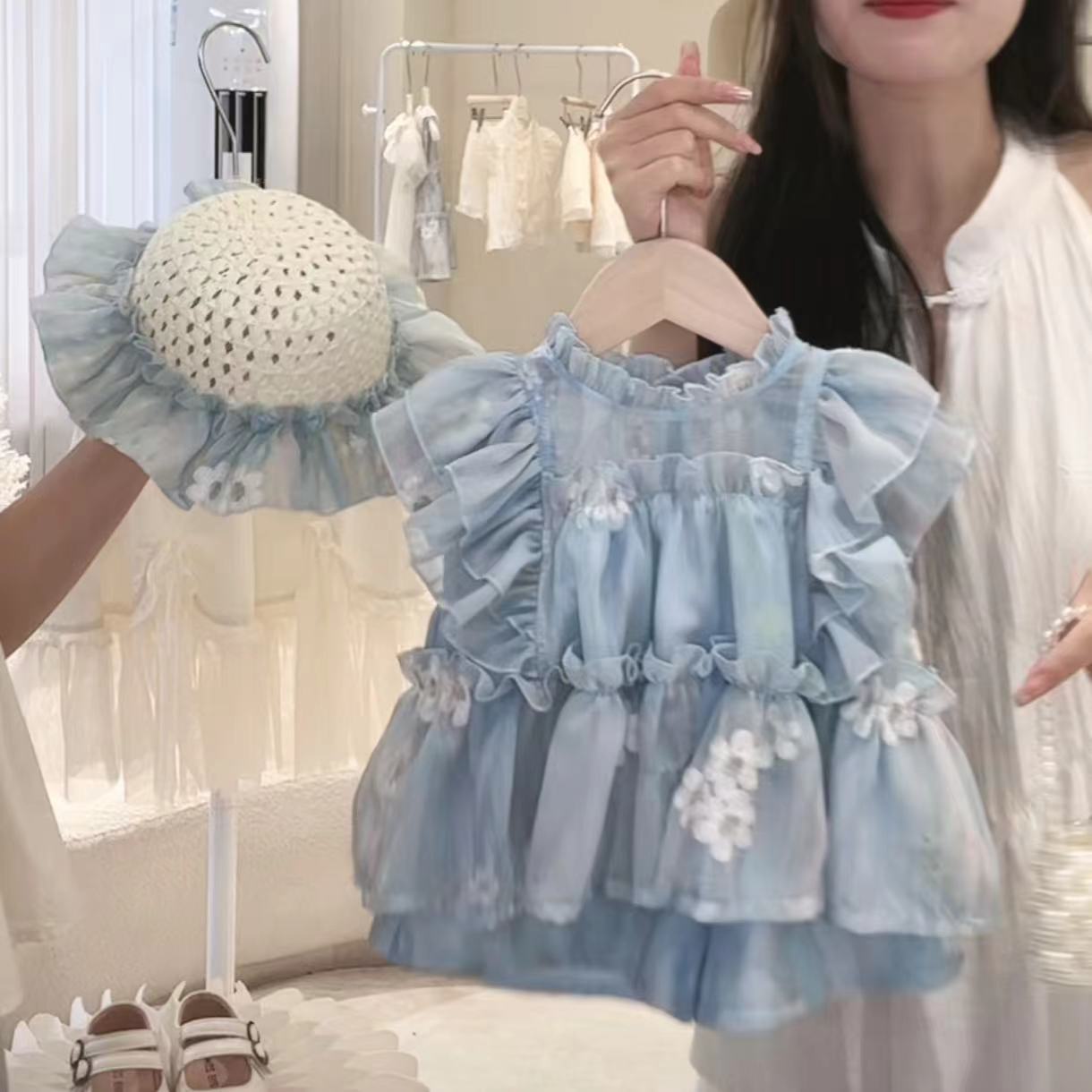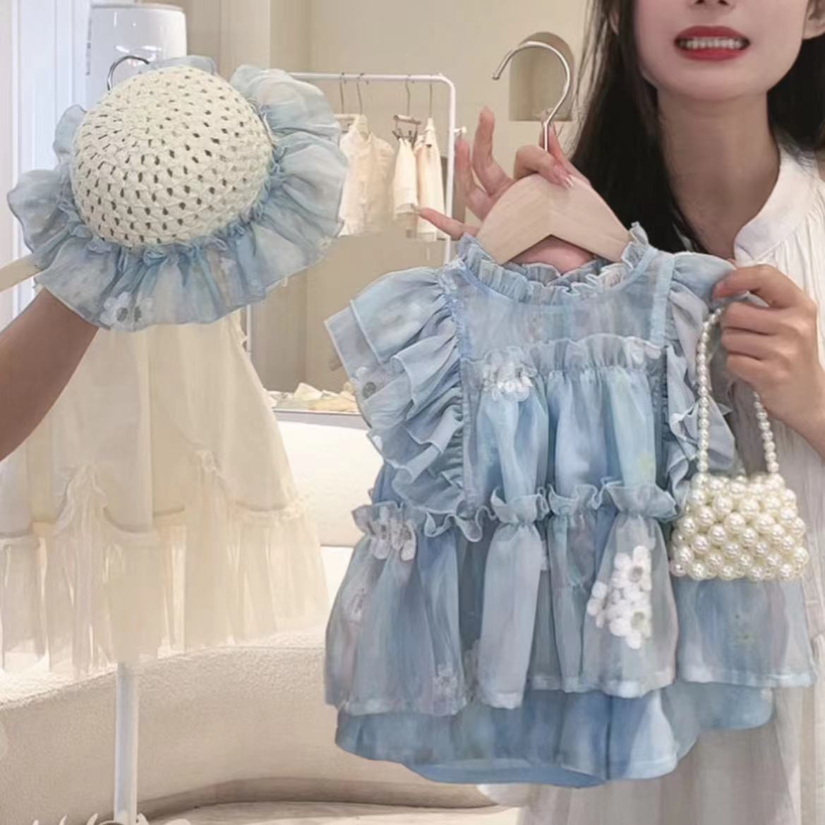 어린이 스타 라운드 한국 스타일 아동복 2025 신상 여름 여아 플라잉 슬리브 베이비돌 셔츠 아동 패션 얇은 투피스 세트 트렌디스토어 가기