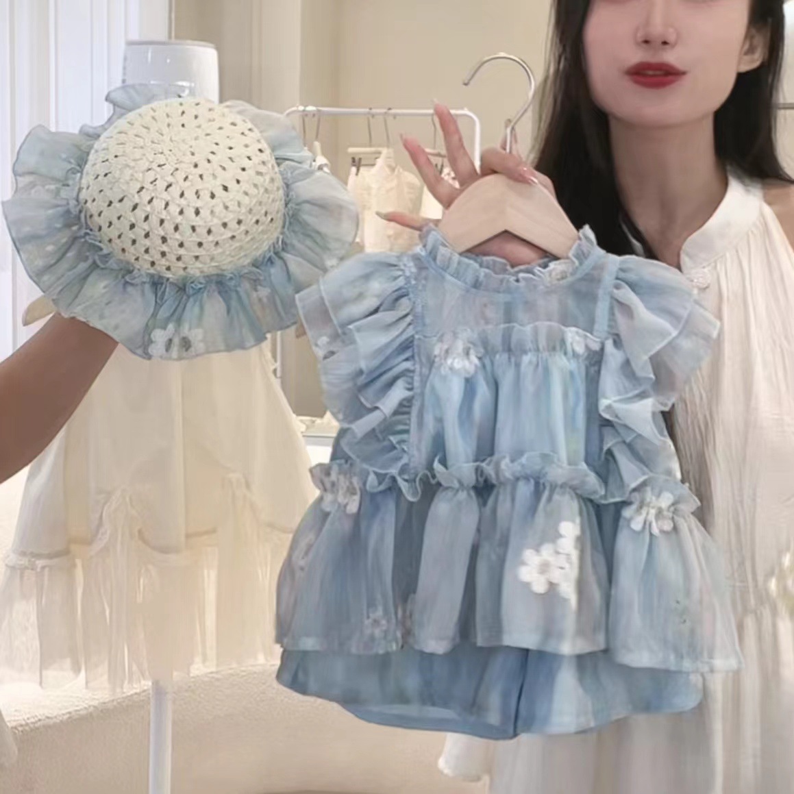 어린이 스타 라운드 한국 스타일 아동복 2025 신상 여름 여아 플라잉 슬리브 베이비돌 셔츠 아동 패션 얇은 투피스 세트 트렌디