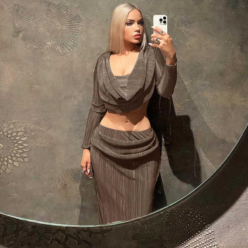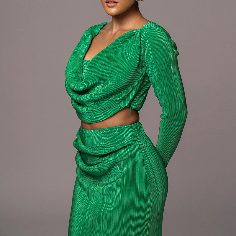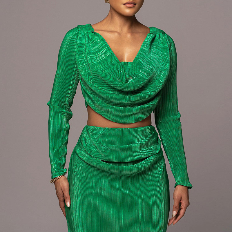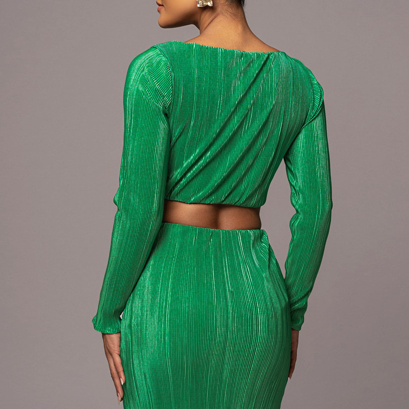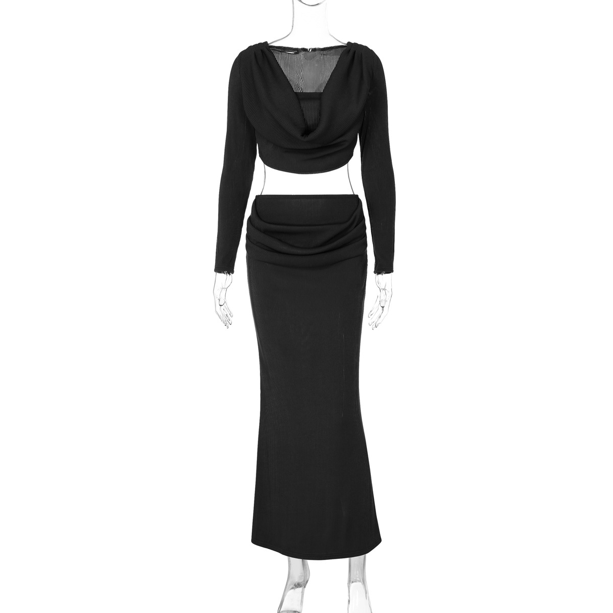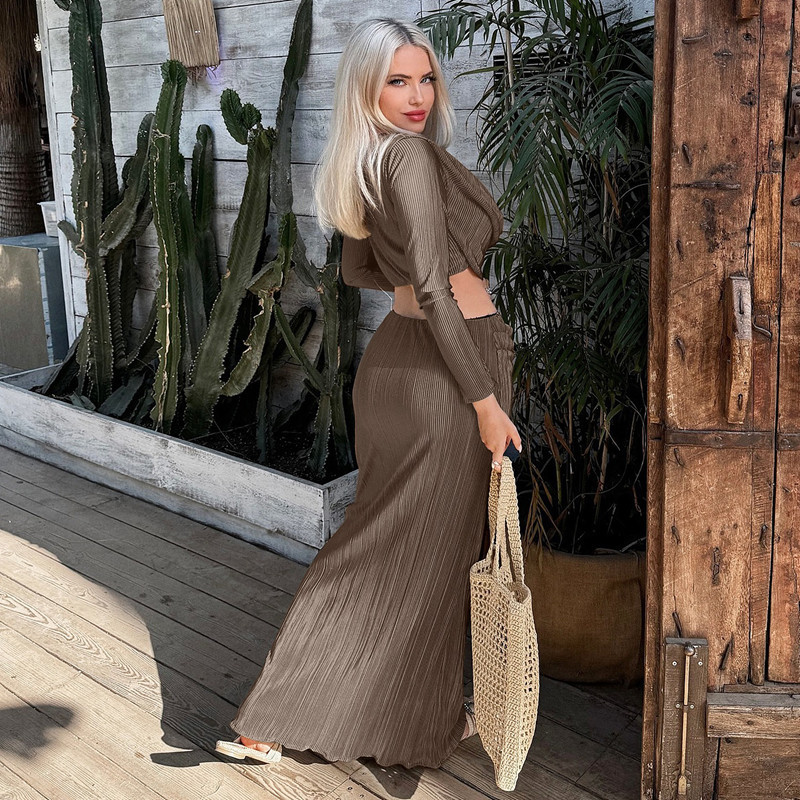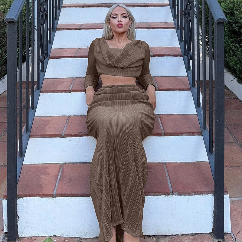 유럽과 미국의 국경 간 여성 2024 여름 새로운 긴 소매 스윙 칼라 갈비 긴 원피스 투피스 세트 패션 캐주얼 세트 여성