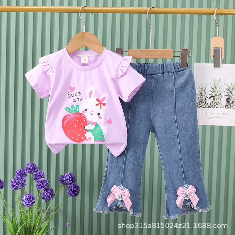 소녀 아기 2024 여름 새로운 만화 유니콘 반팔 활 데님 바지 어린이 투피스 세트