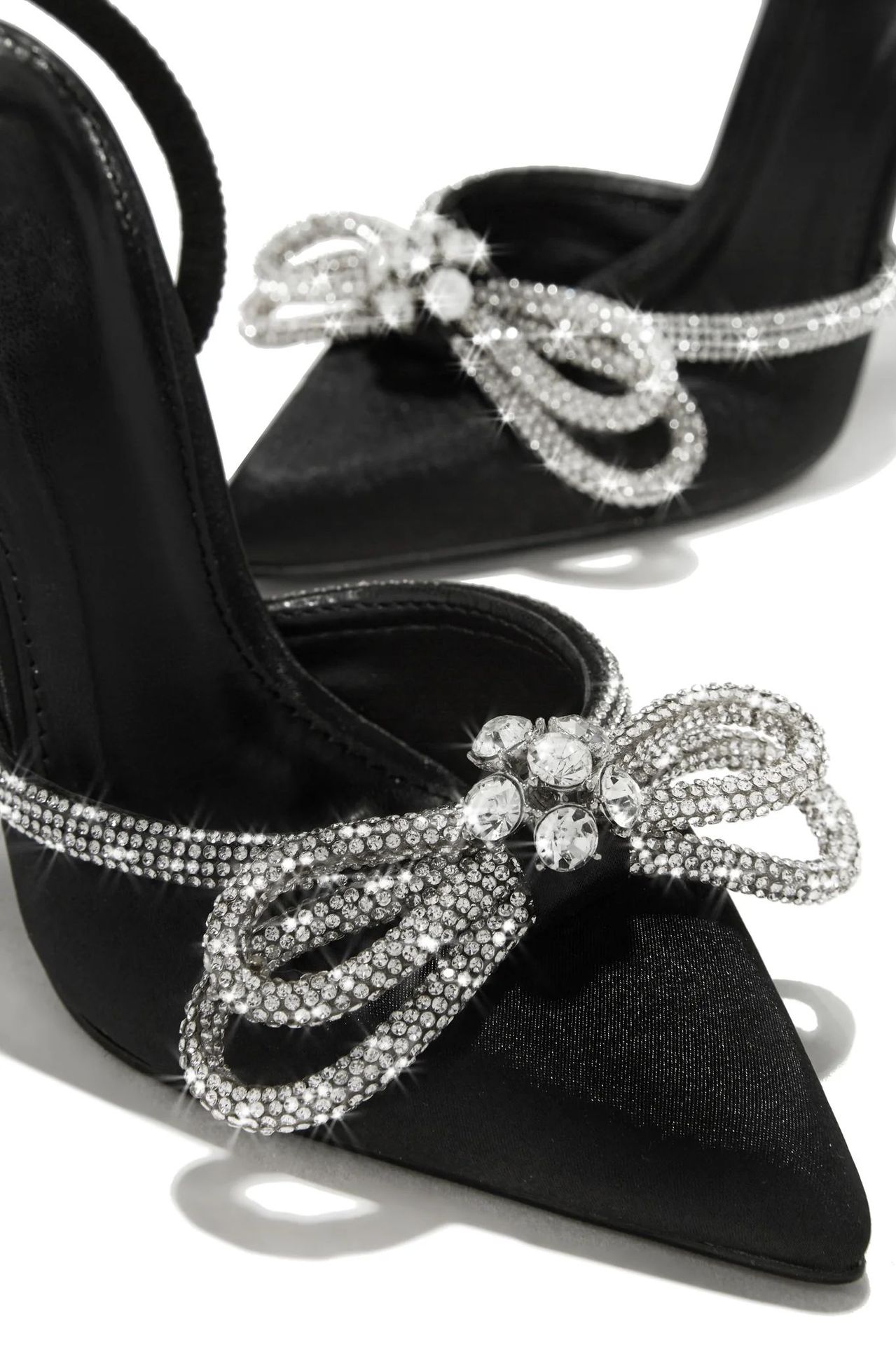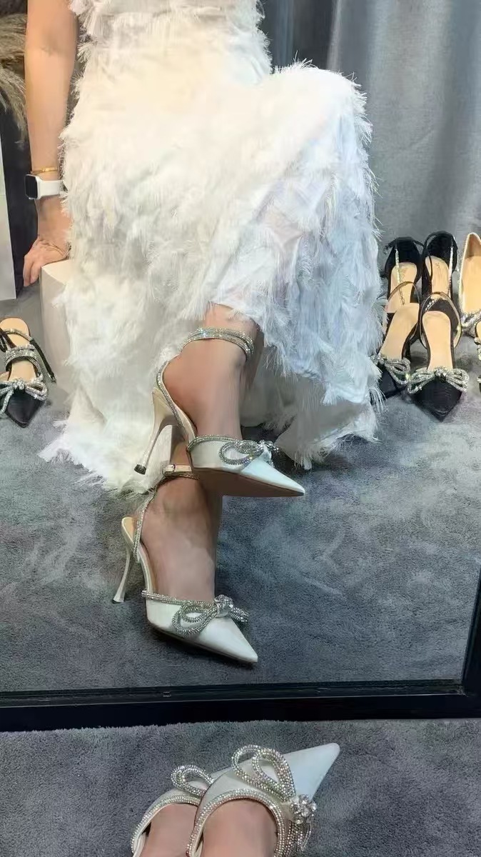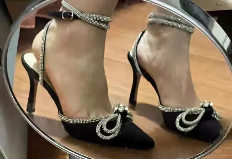 2024夏新款尖头闪亮水钻蝴蝶结细高跟细带缠绕绑带派对宴会女士高跟单鞋