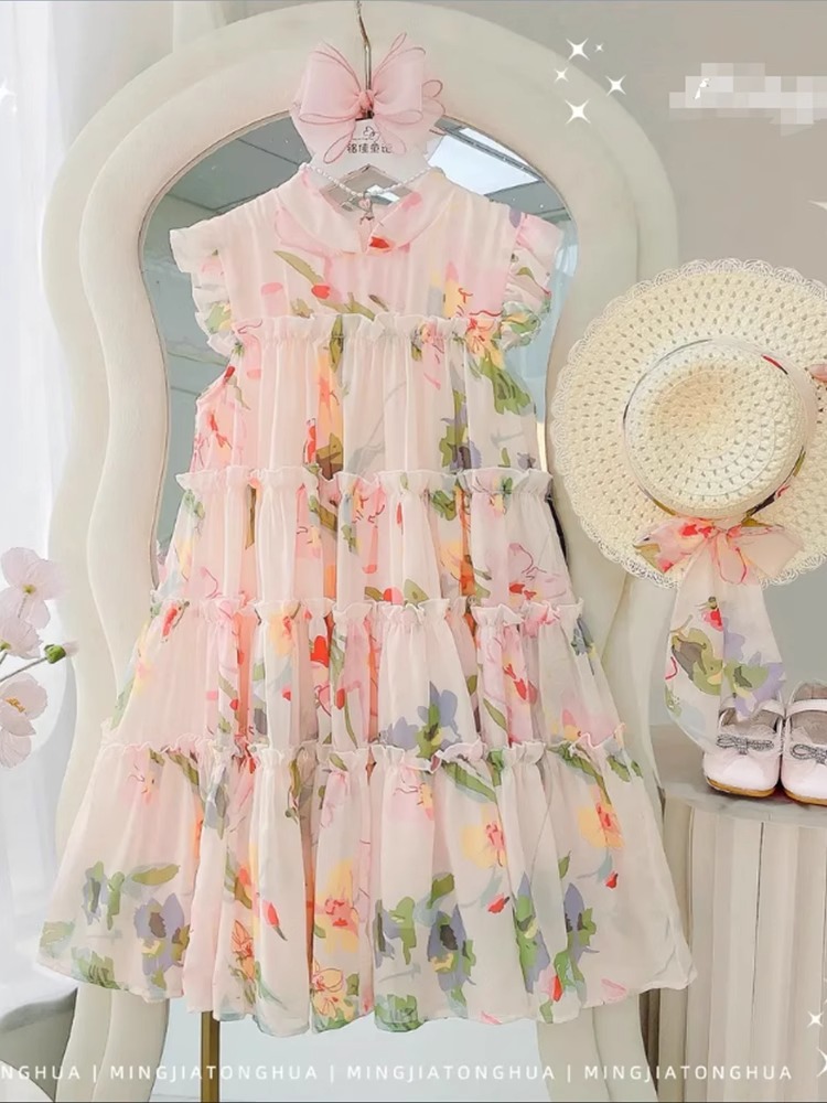 2024 새로운 소녀 원피스 여름 원피스 서양식 어린이 원피스 꽃 공주 원피스 소녀 여름 케이크 원피스