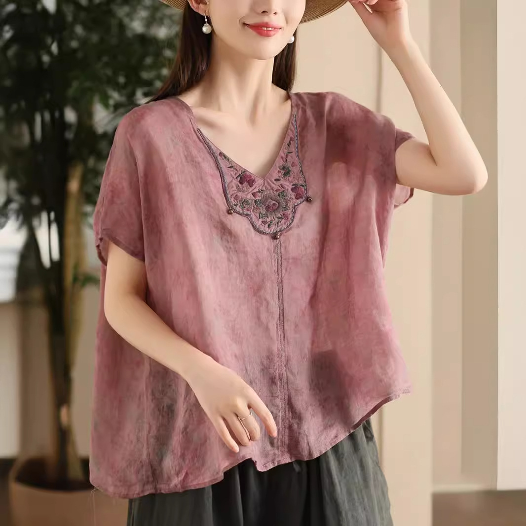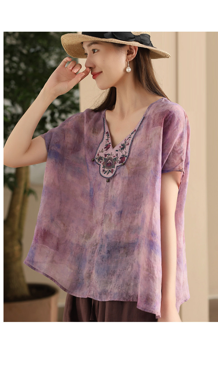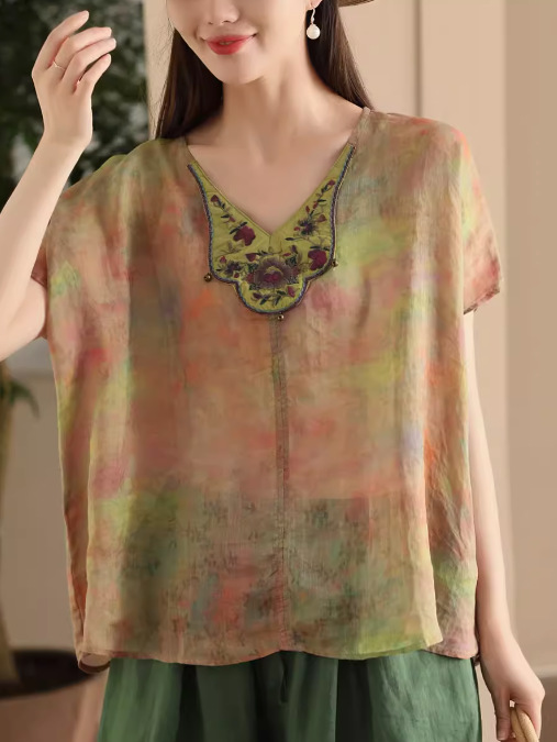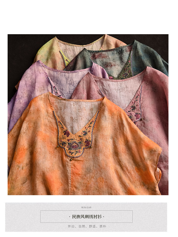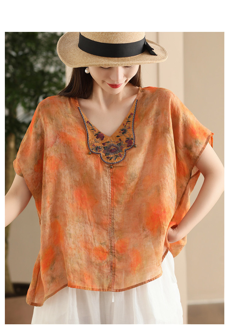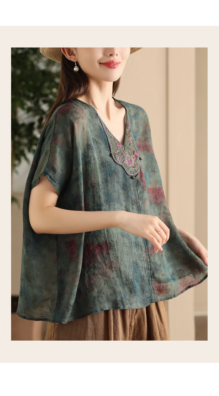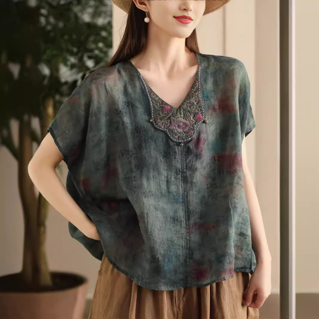 빈티지 민족 자수 라미 셔츠 프라이드 컬러 인쇄 된 배트 소매 셔츠 우아한 풀오버 탑