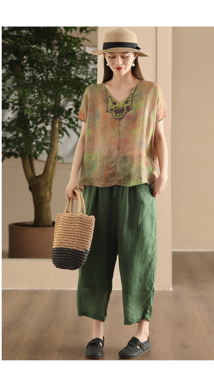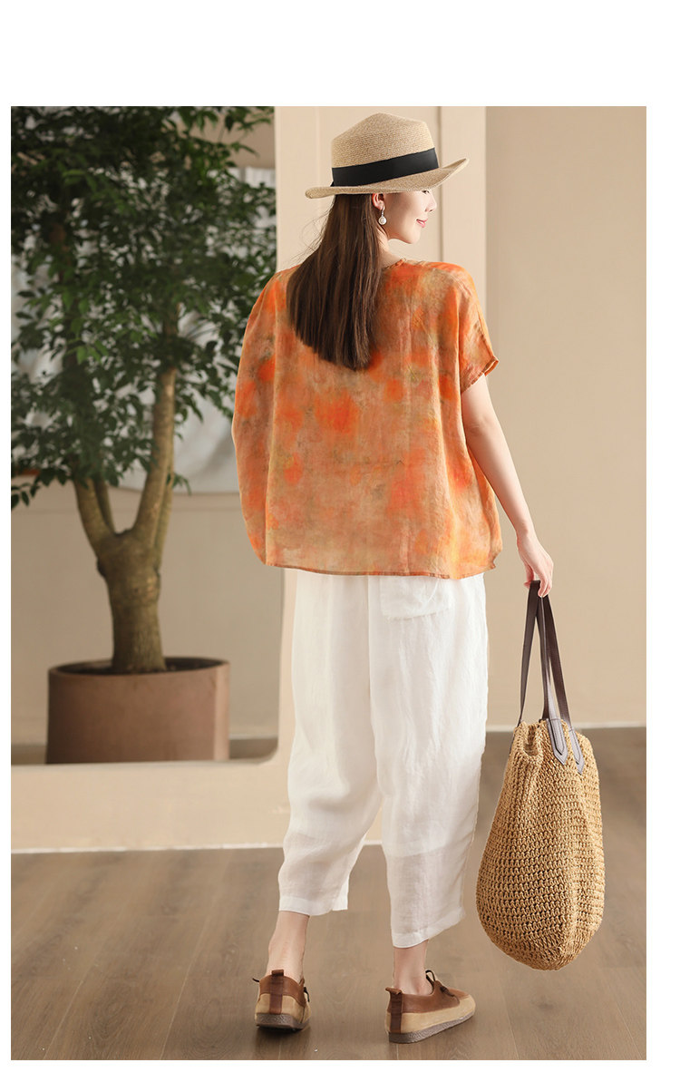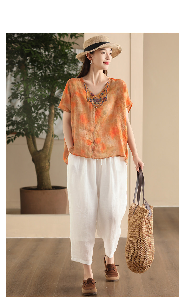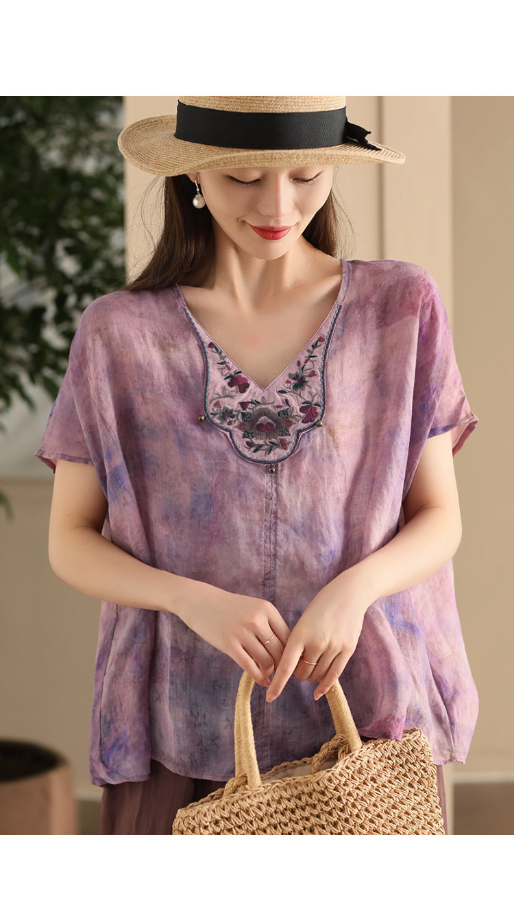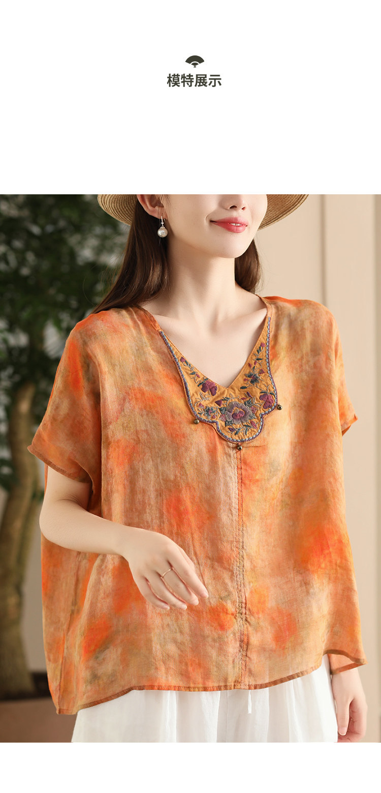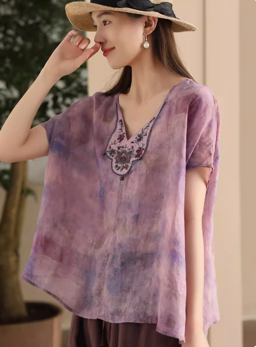 빈티지 민족 자수 라미 셔츠 프라이드 컬러 인쇄 된 배트 소매 셔츠 우아한 풀오버 탑