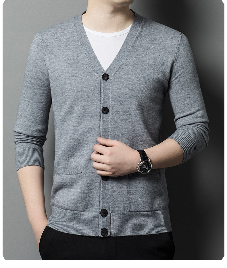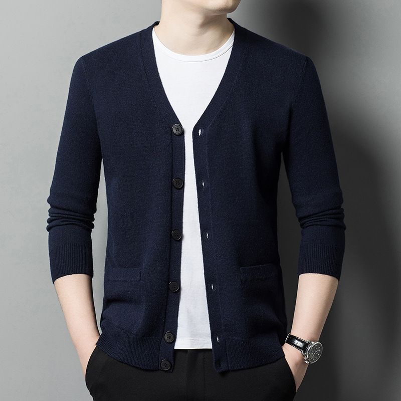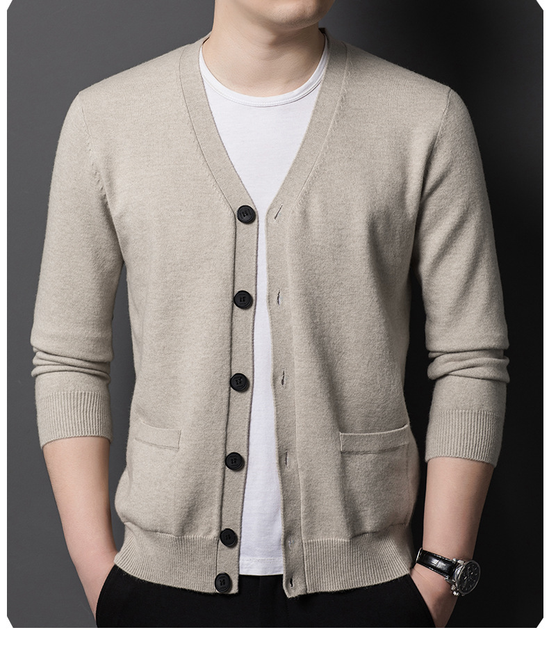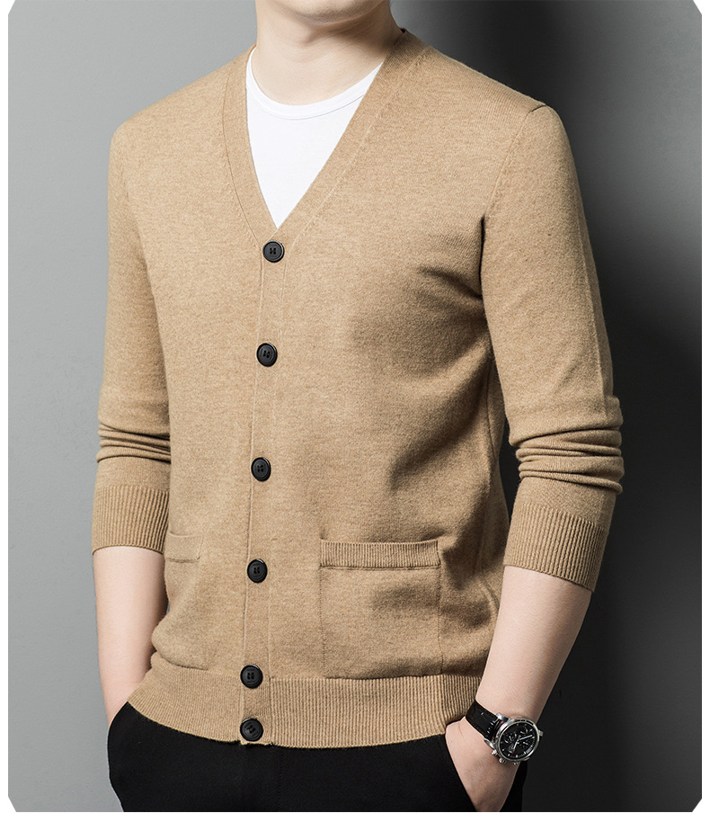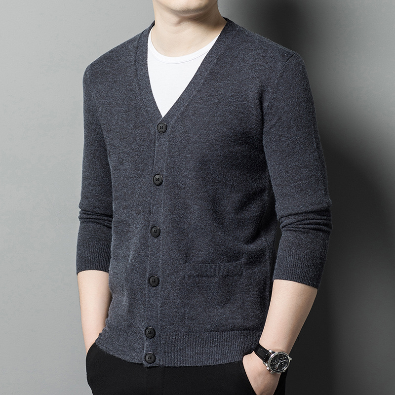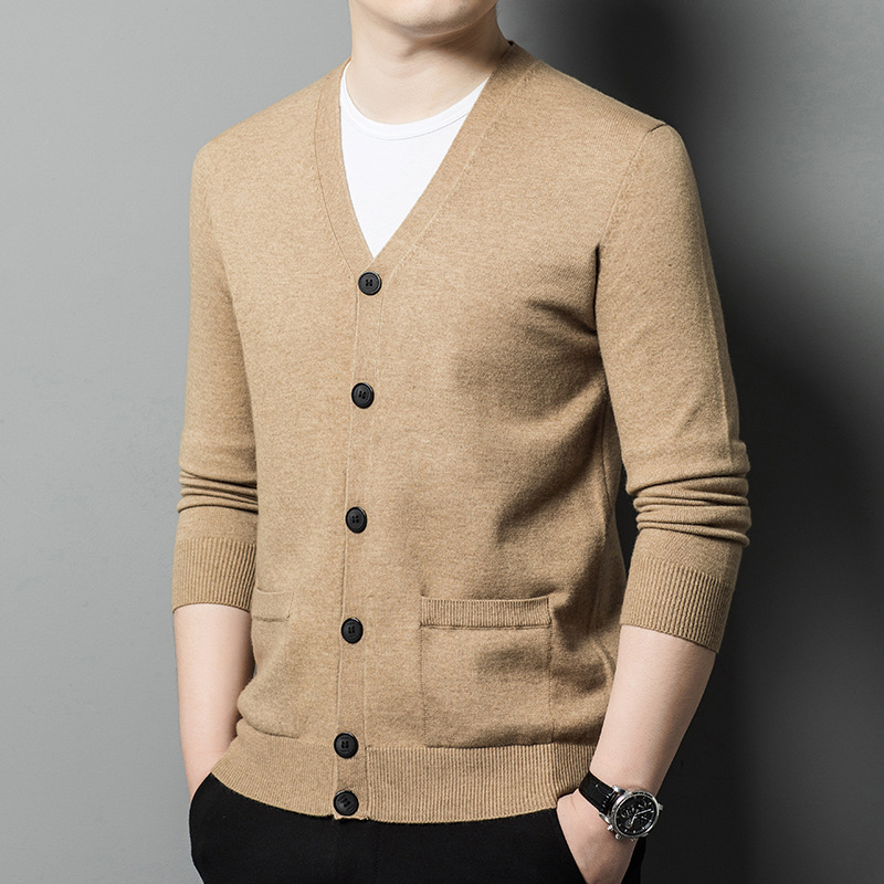 남성용 젊고 중년의 고급 봄과 가을 새로운 V 넥 솔리드 컬러 카디건 리얼 포켓 간단한 패션 니트 긴팔 재킷