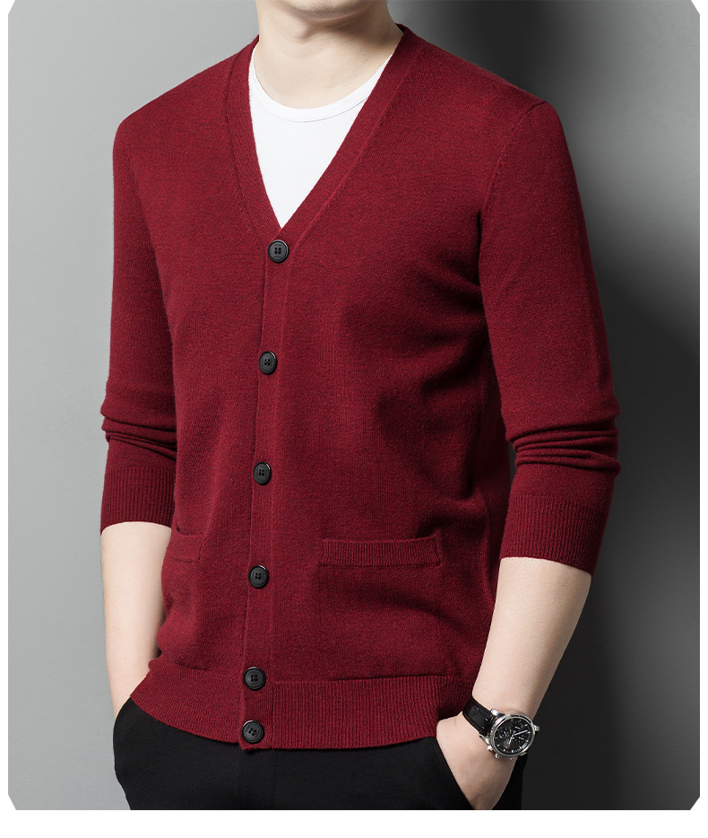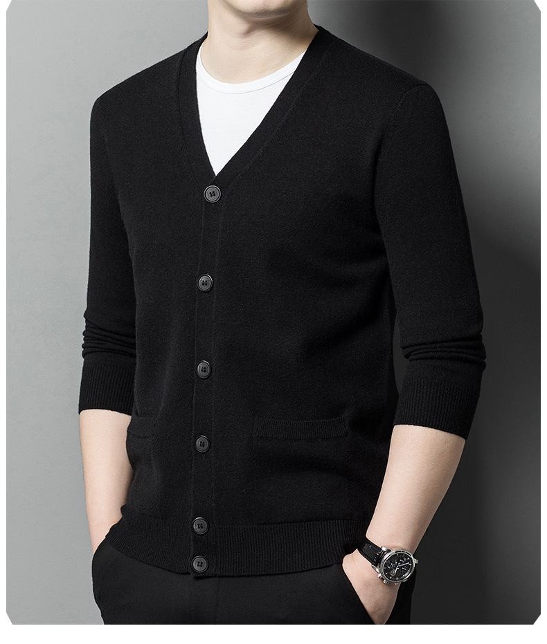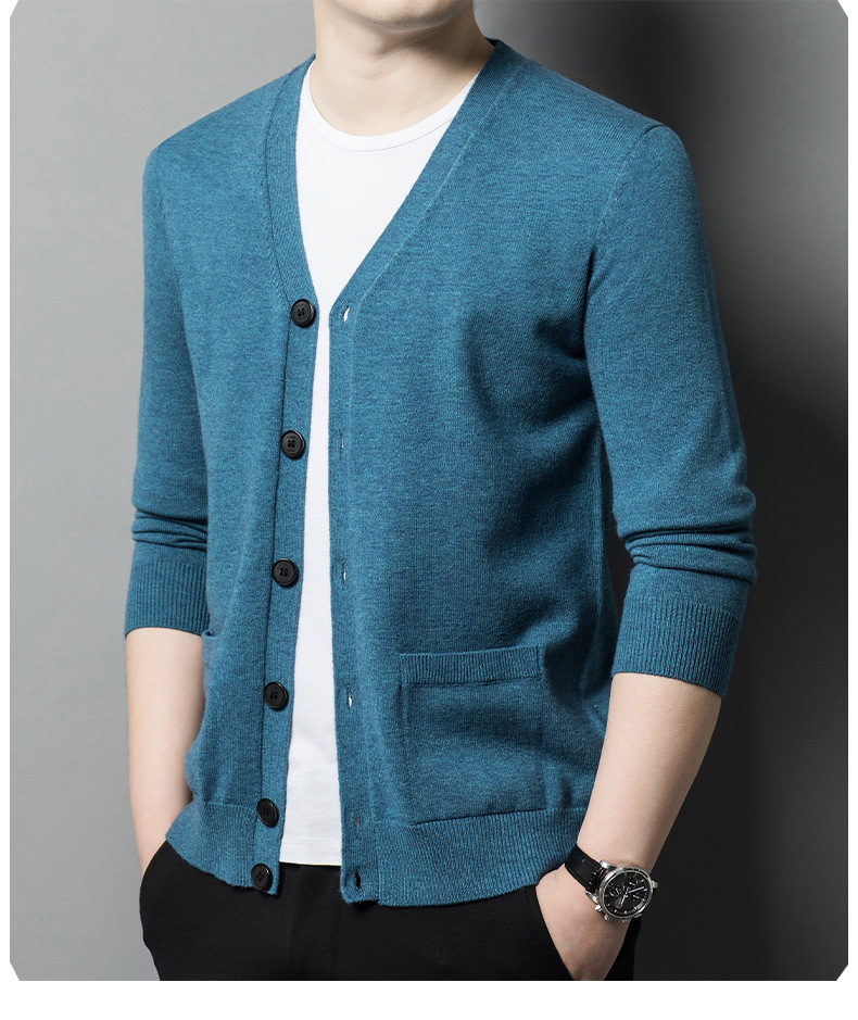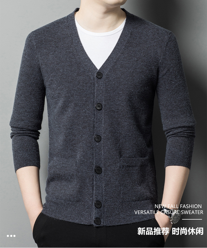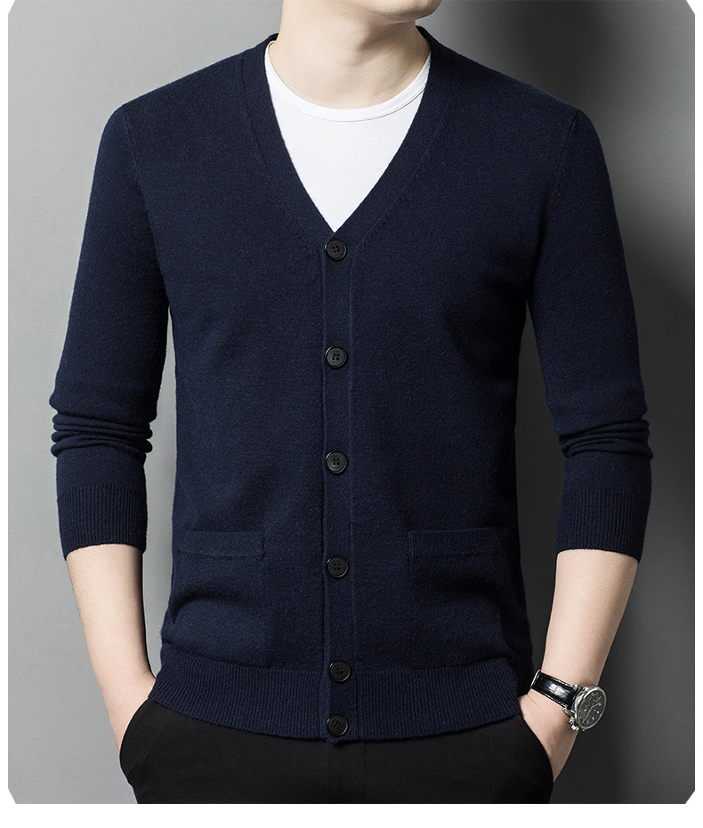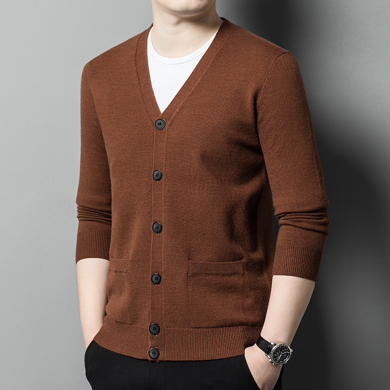 남성용 젊고 중년의 고급 봄과 가을 새로운 V 넥 솔리드 컬러 카디건 리얼 포켓 간단한 패션 니트 긴팔 재킷