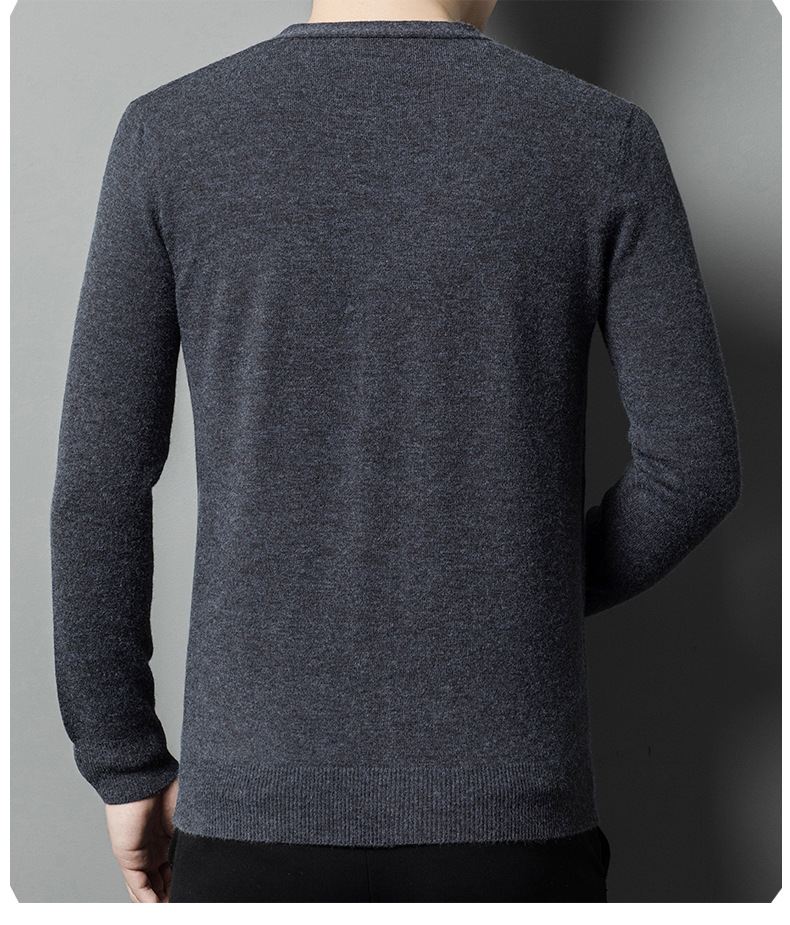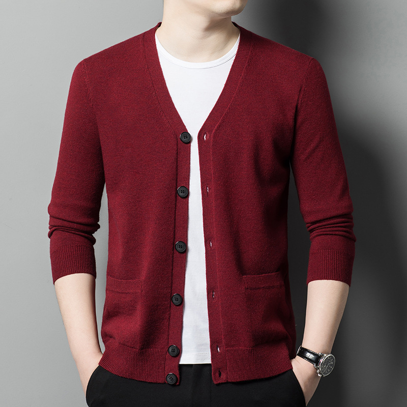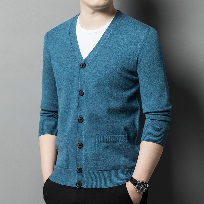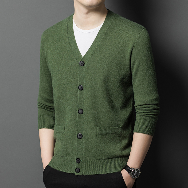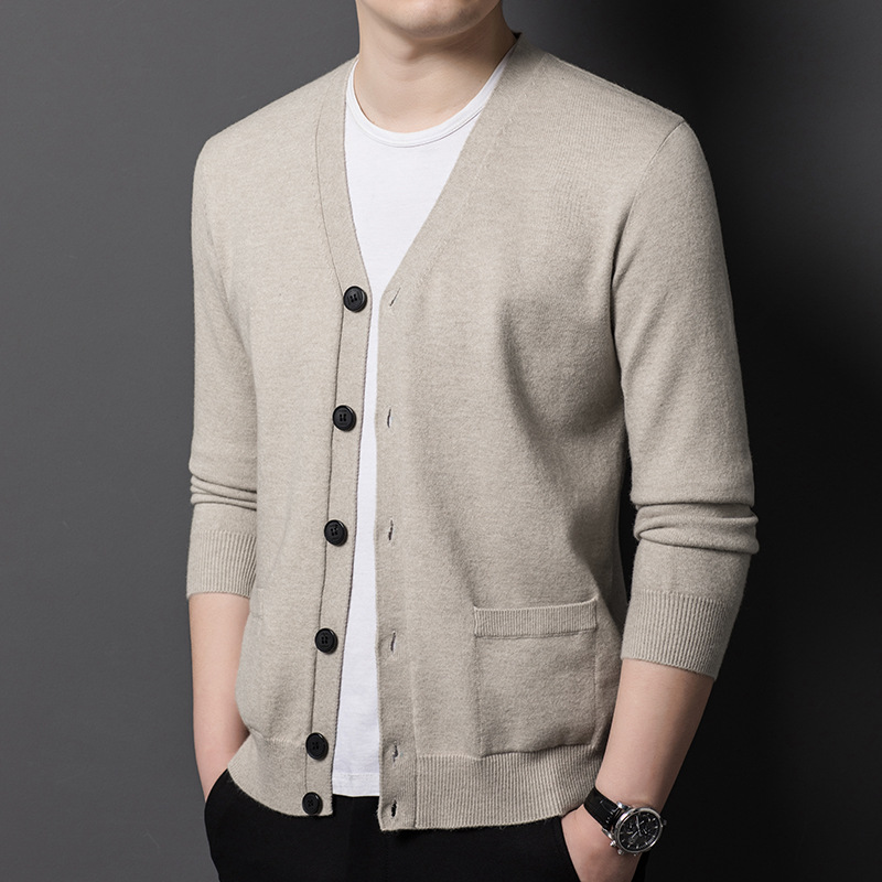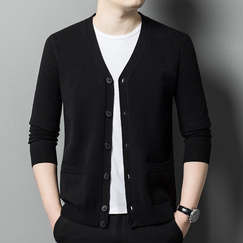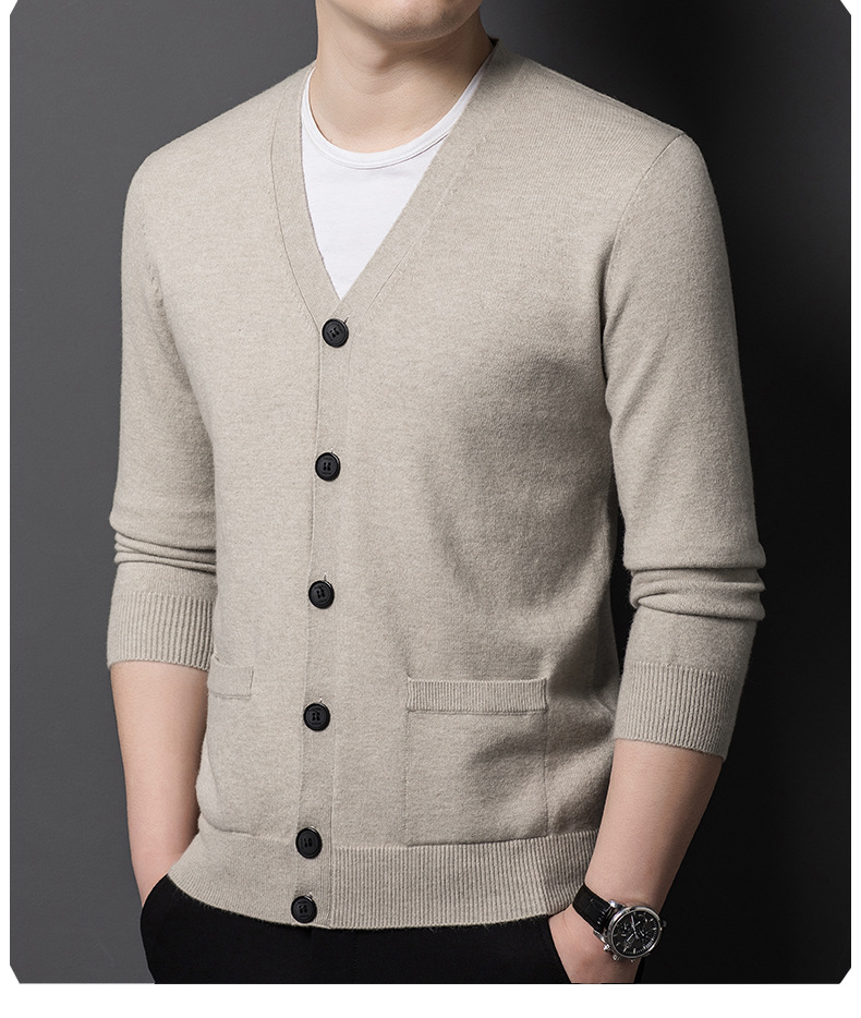 남성용 젊고 중년의 고급 봄과 가을 새로운 V 넥 솔리드 컬러 카디건 리얼 포켓 간단한 패션 니트 긴팔 재킷