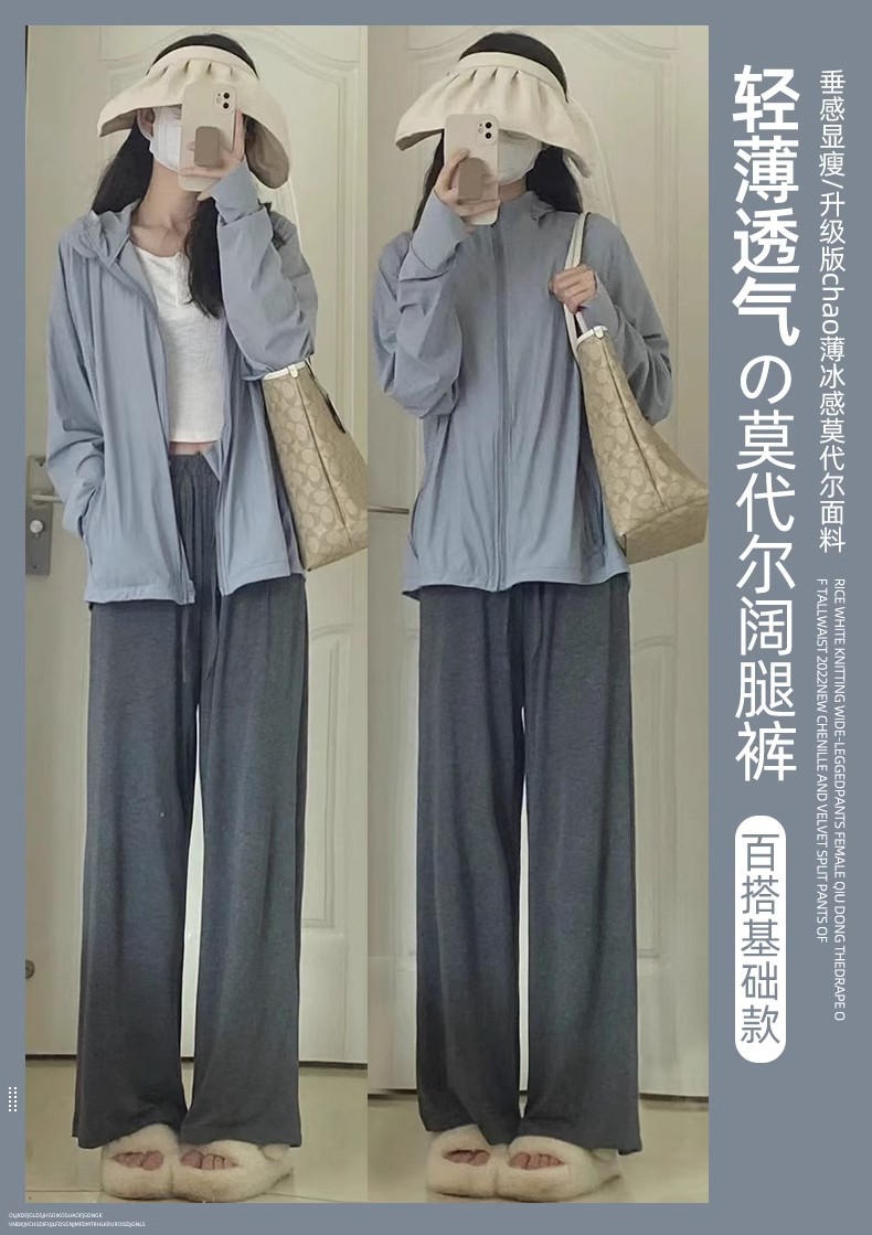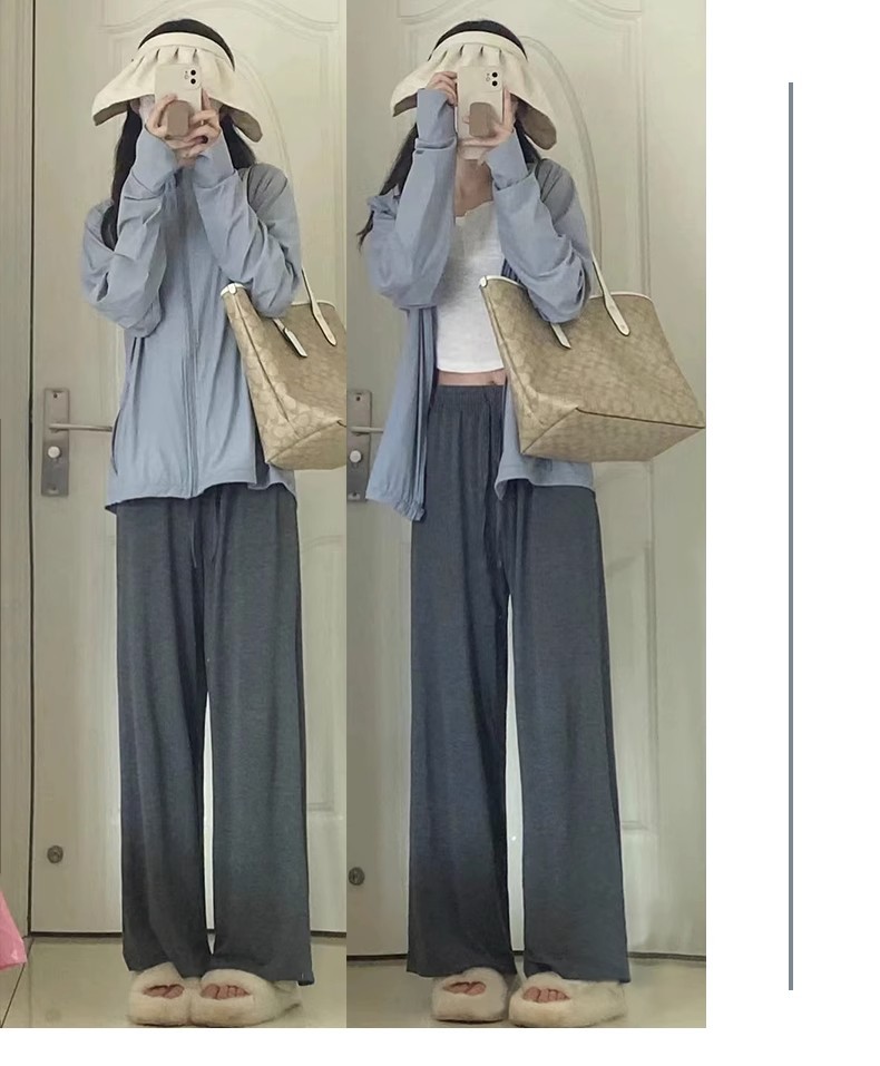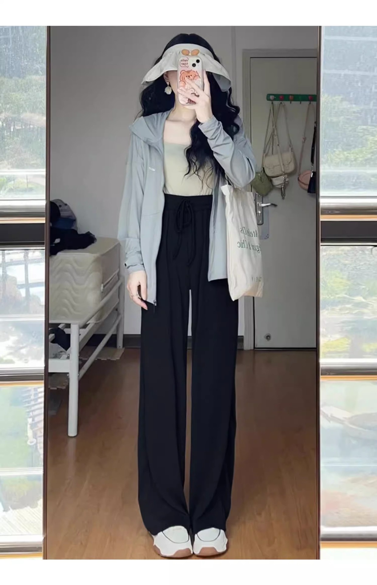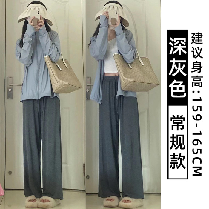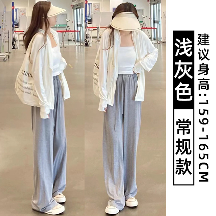 회색 아이스 실크 스포츠 바지 여성의 여름 얇은 높은 허리 느슨한 스트레이트 캐주얼 와이드 다리 바지 쿨 안티 모기 선 스크린 바지스토어 가기