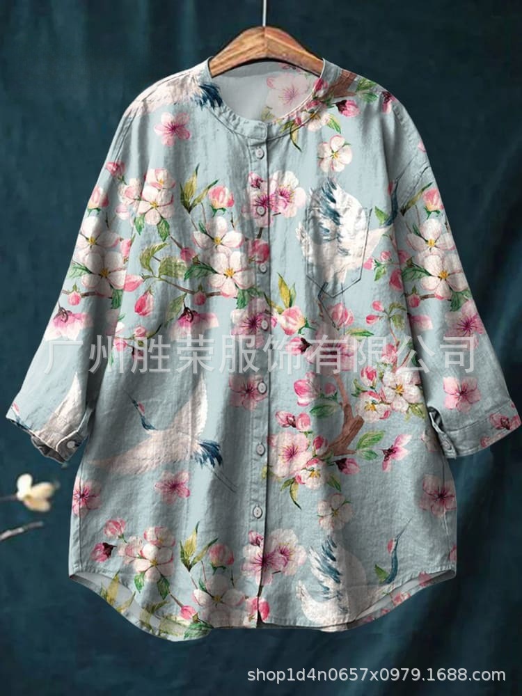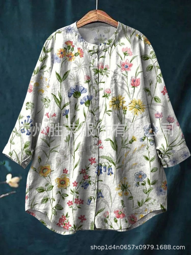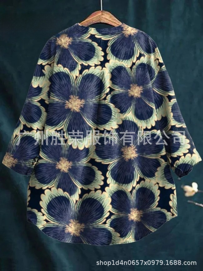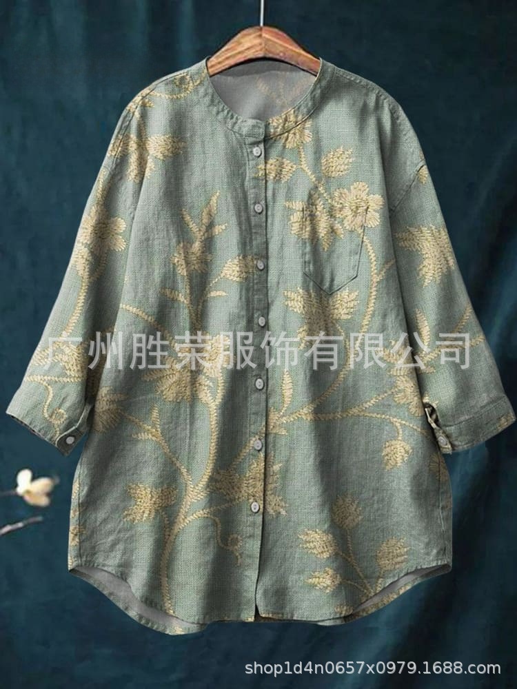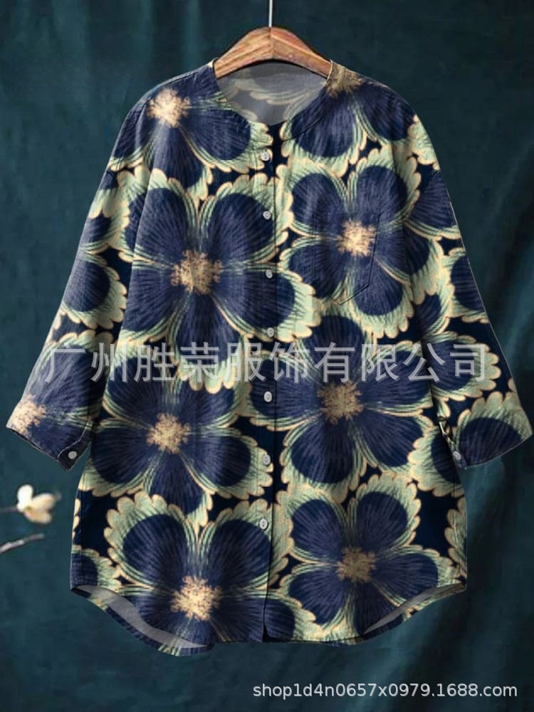 2024 년 새로운 재고 국경 대외 무역 유럽과 미국 여성 독립 역 폭발 9 소매 포켓 프린트 라운드 넥 셔츠스토어 가기