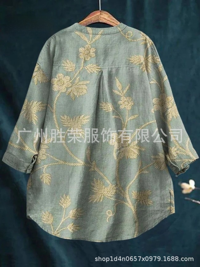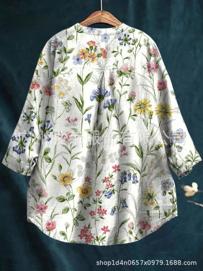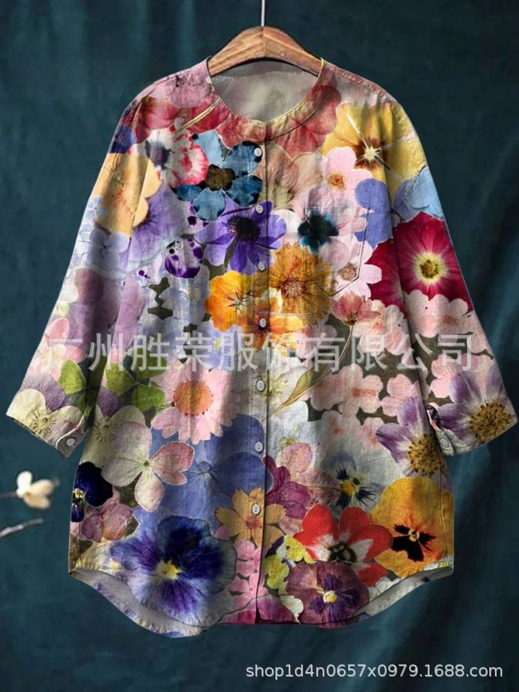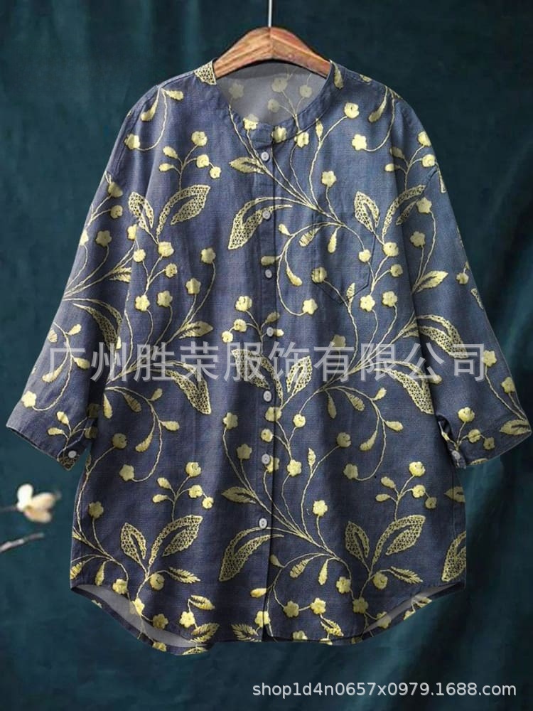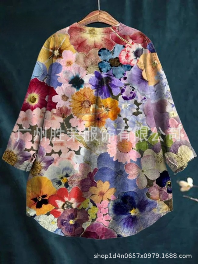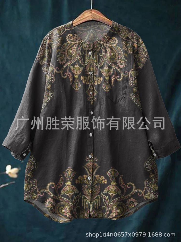 2024 년 새로운 재고 국경 대외 무역 유럽과 미국 여성 독립 역 폭발 9 소매 포켓 프린트 라운드 넥 셔츠스토어 가기