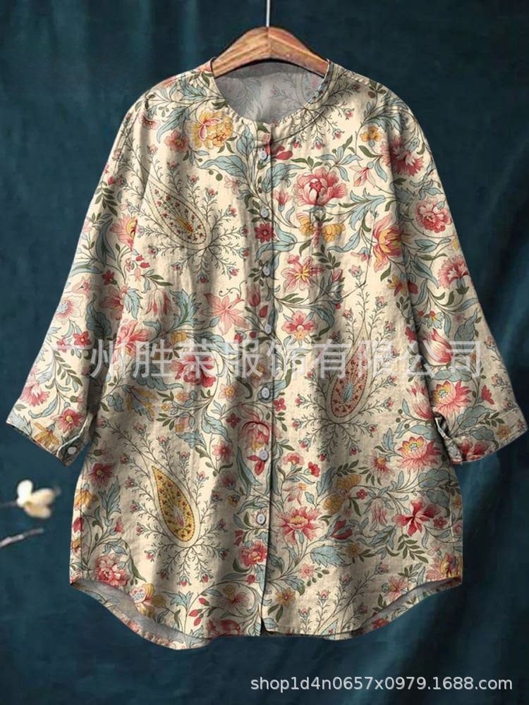 2025 신상품 재고 있음 해외 무역 유럽 및 미국 여성복 독립 사이트 인기상품 9부 소매 포켓 프린트 라운드넥 셔츠스토어 가기