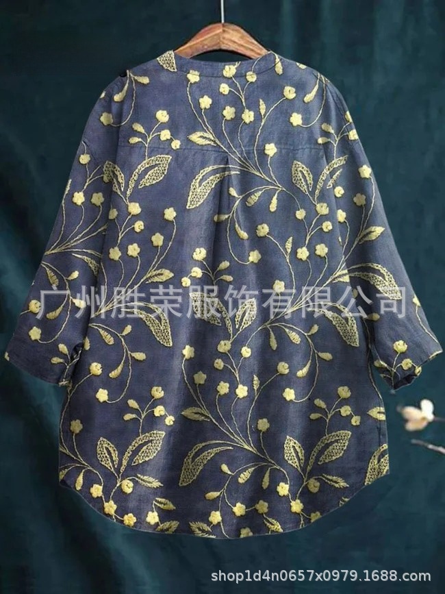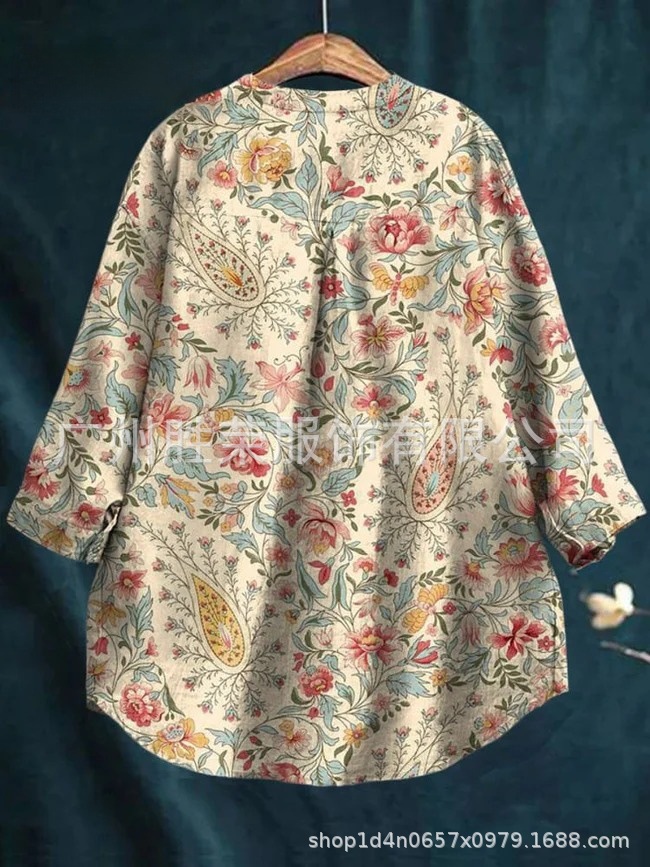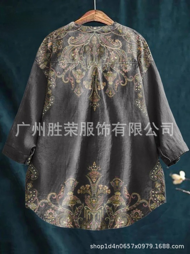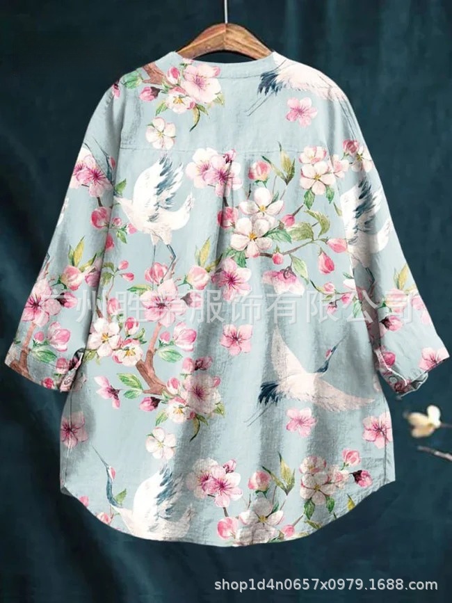 2024 년 새로운 재고 국경 대외 무역 유럽과 미국 여성 독립 역 폭발 9 소매 포켓 프린트 라운드 넥 셔츠