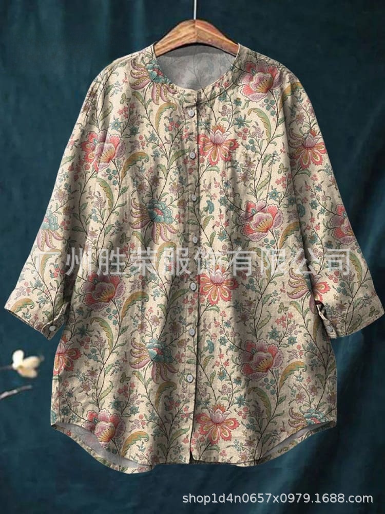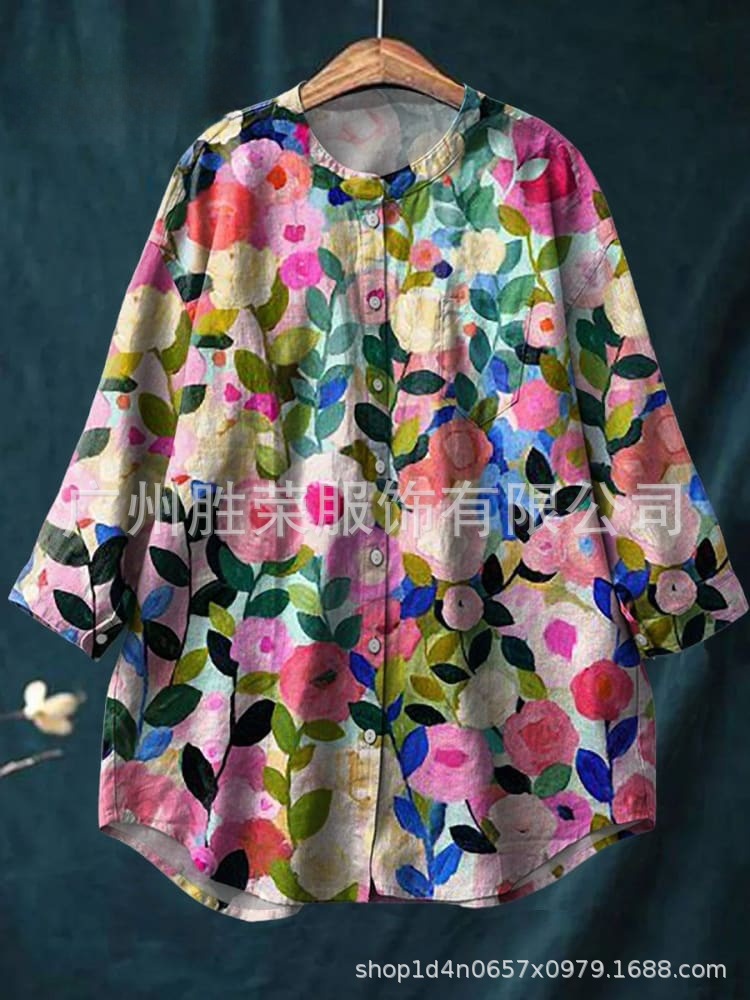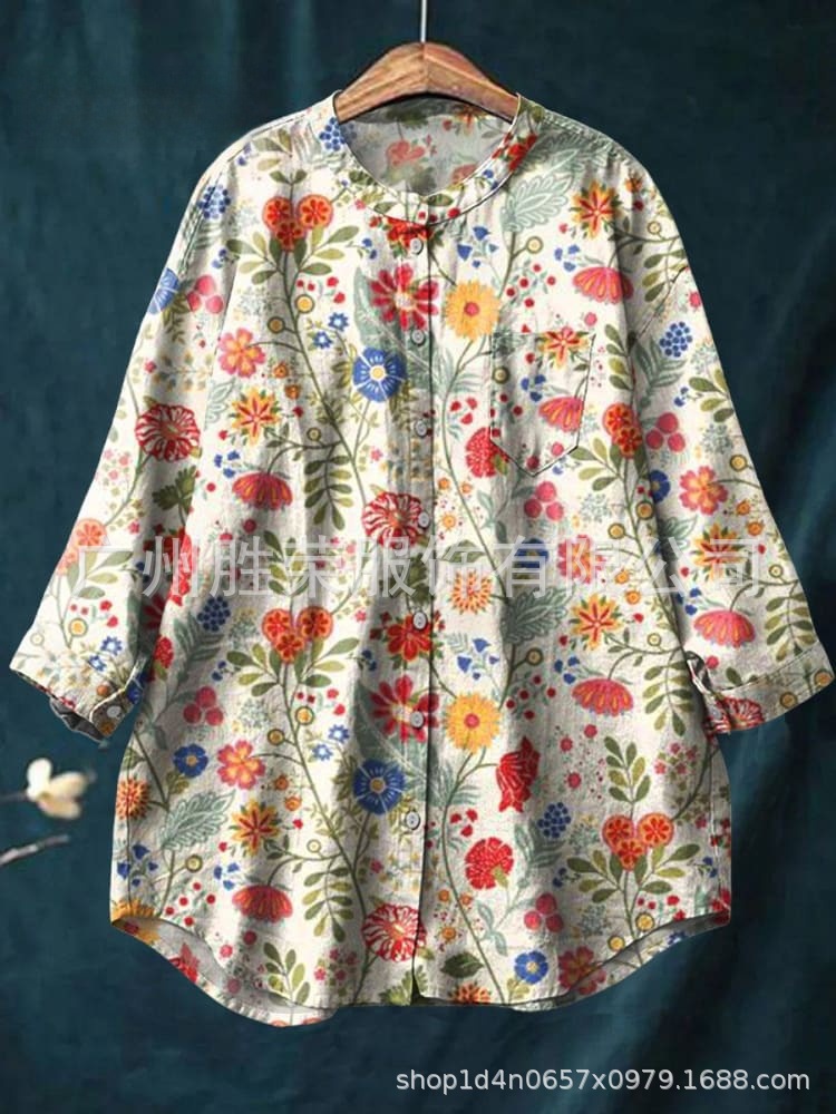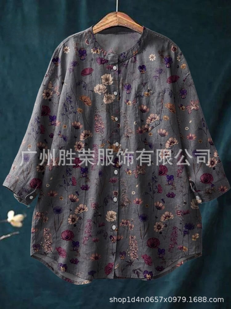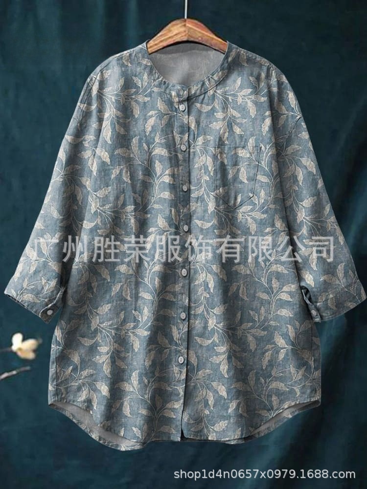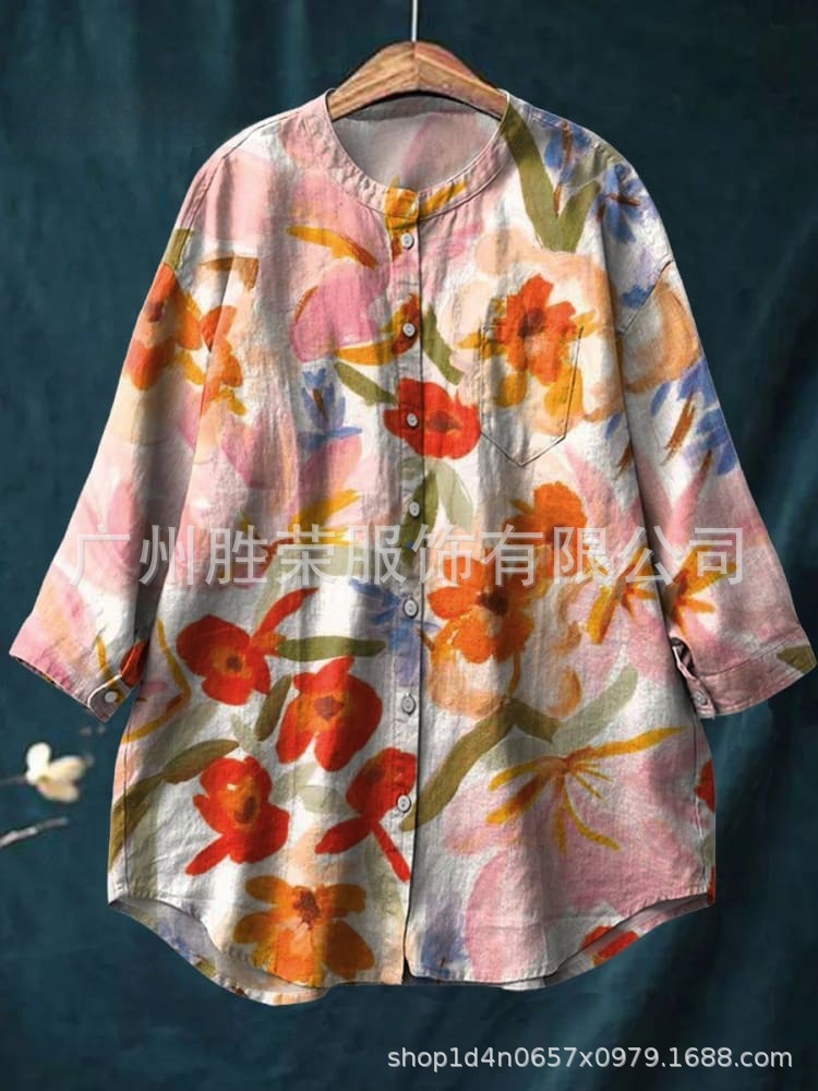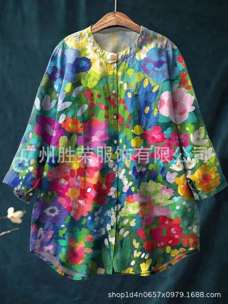 2024 년 새로운 재고 국경 대외 무역 유럽과 미국 여성 독립 역 폭발 9 소매 포켓 프린트 라운드 넥 셔츠스토어 가기