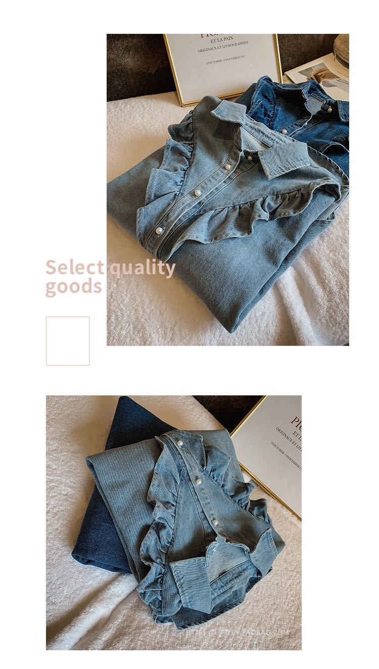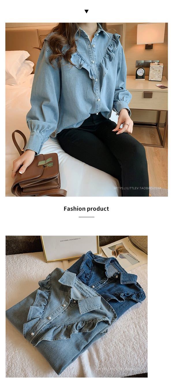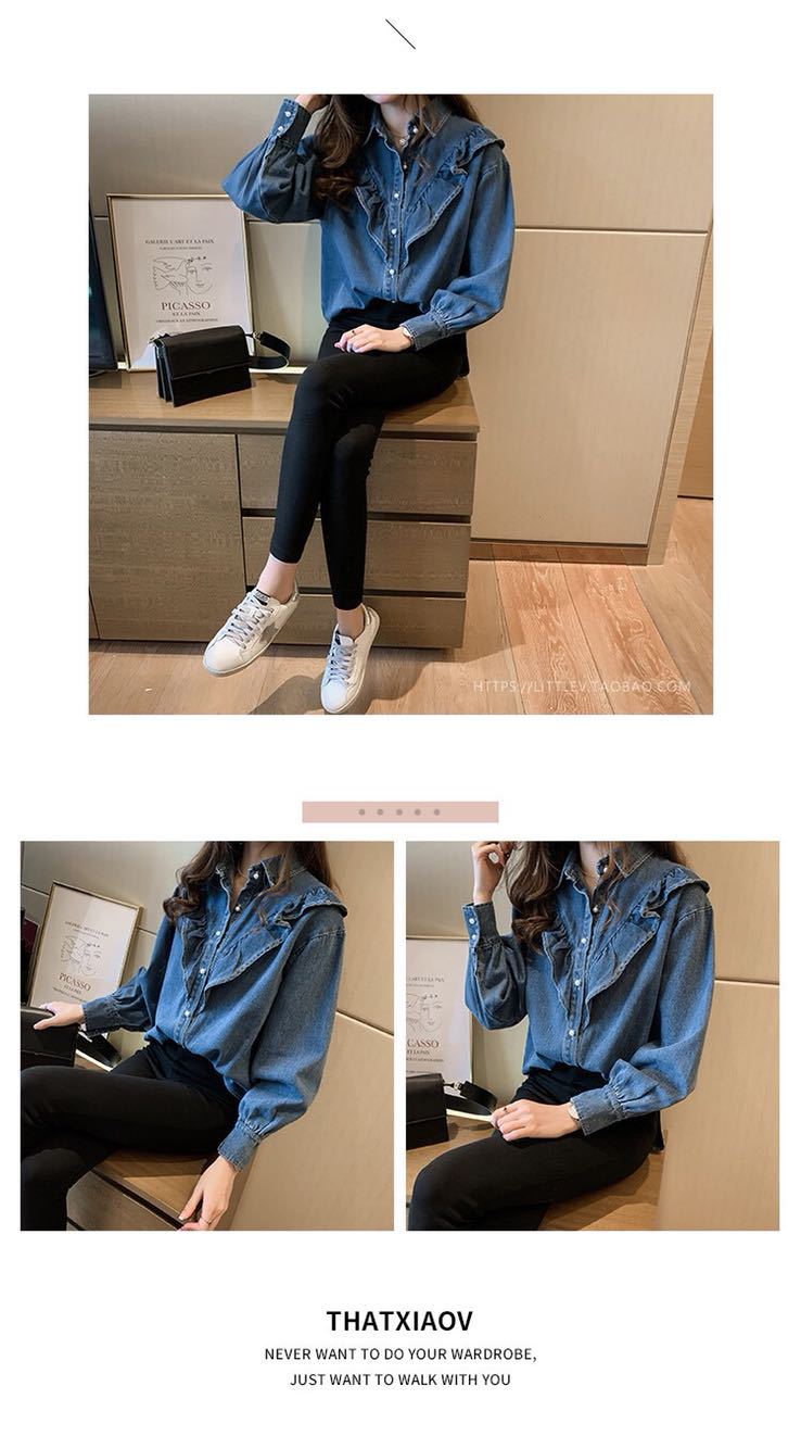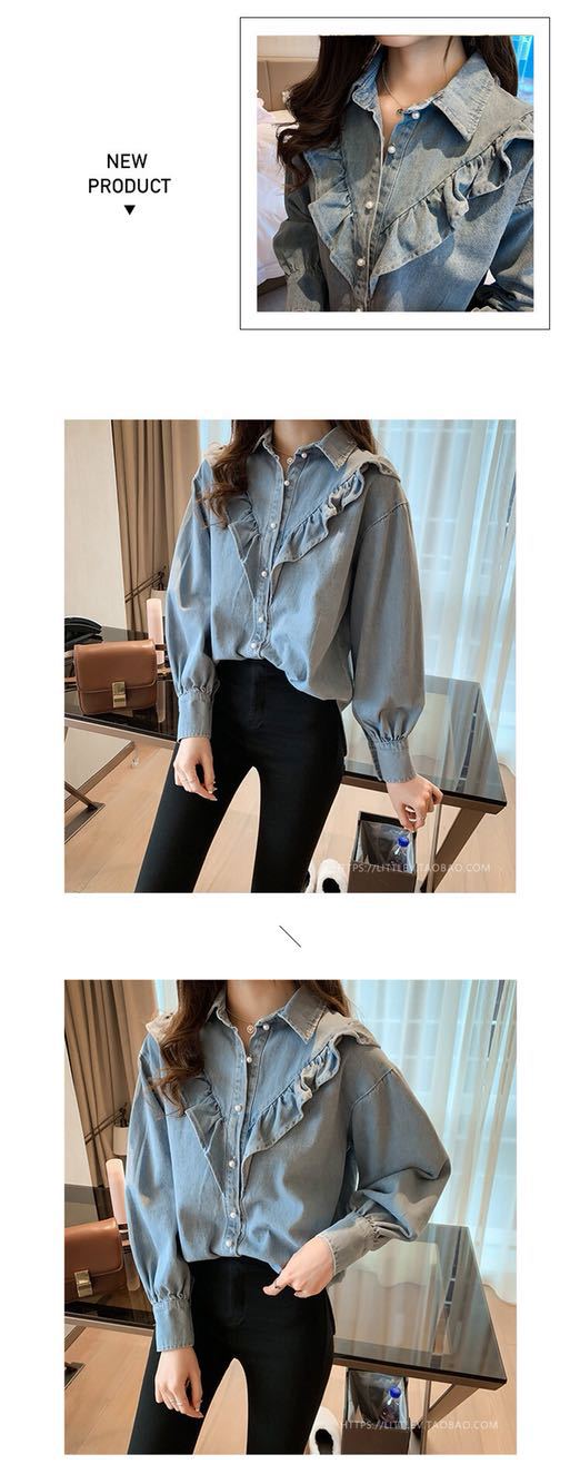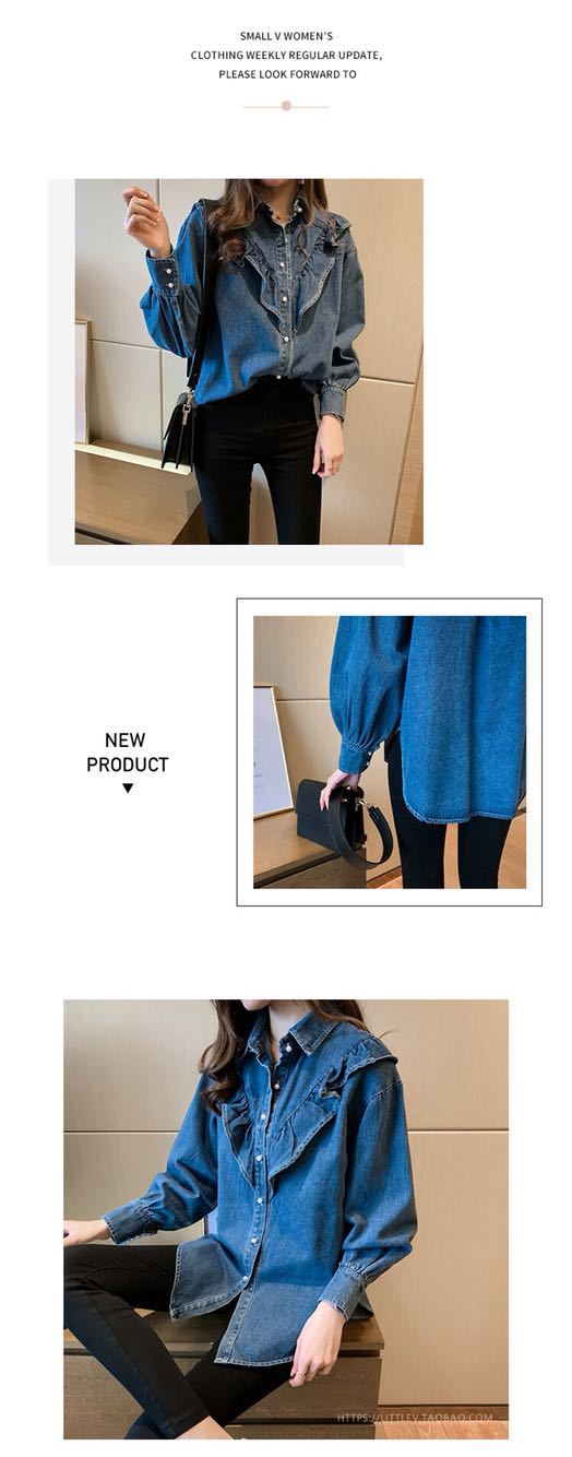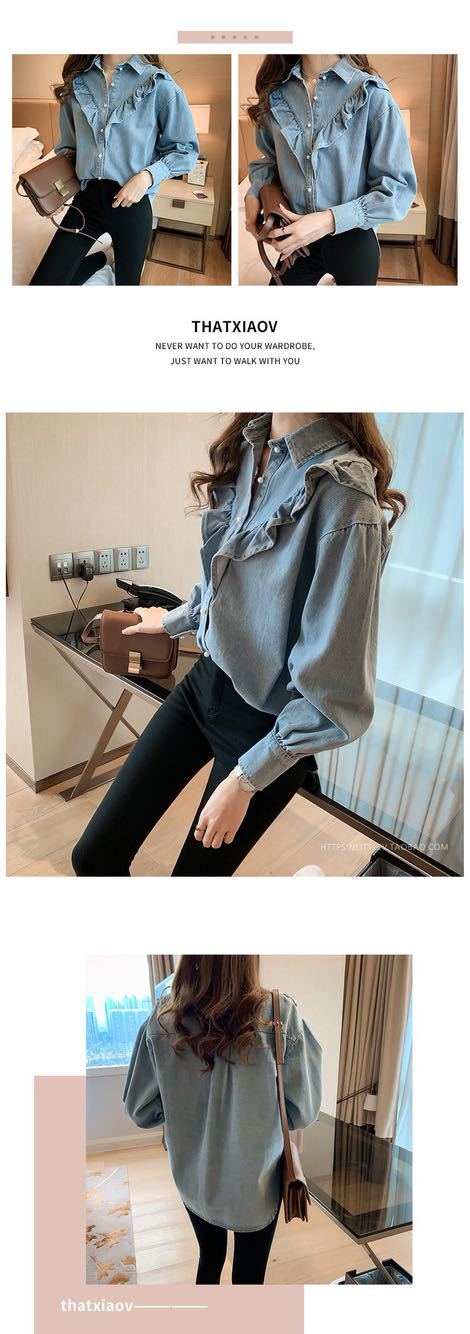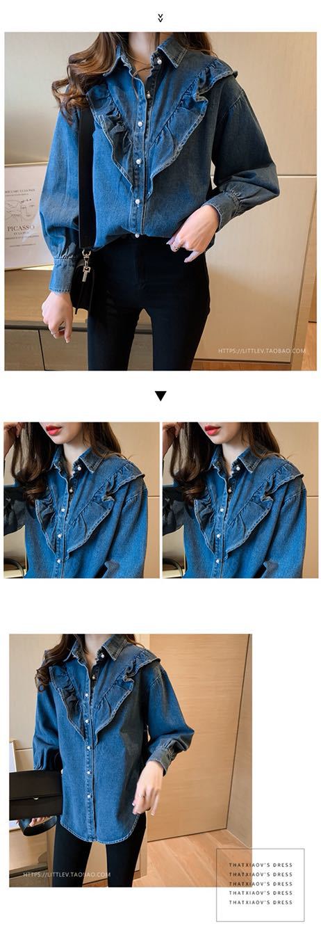 봄 새로운 한국 스타일 달콤한 러플 데님 셔츠 여성의 느슨한 슬리밍 긴팔 탑 트렌디베이스 셔츠스토어 가기