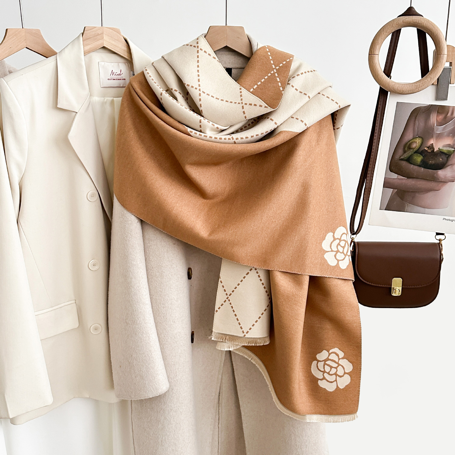 샤오샹 스타일 동백 모방 캐시미어 스카프 여자 겨울 한국식 올매치 우아한 양면 따뜻한 목 목도리