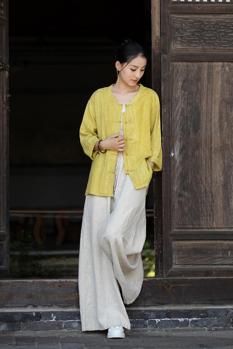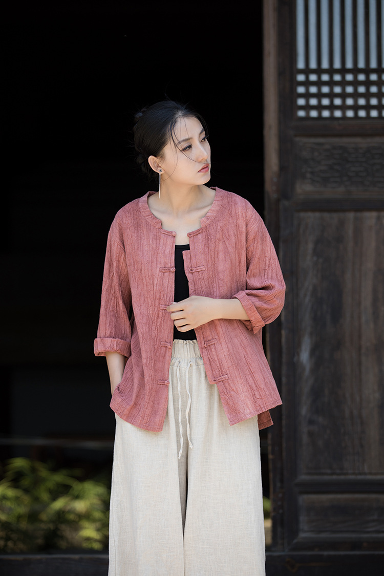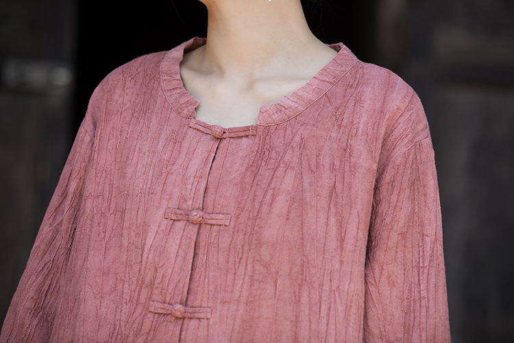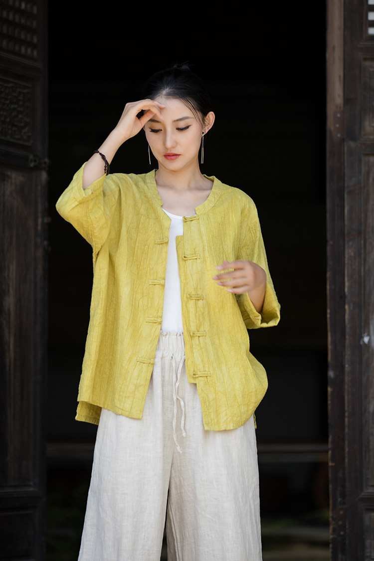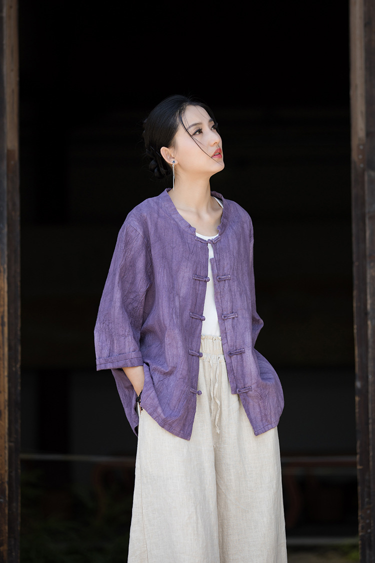 24 여름 면화 및 리넨 여성 의류 새로운 수제 넥타이 염색 수직 칼라 버튼 블라우스 새로운 중국 스타일 아름다운 카디건 선 스크린 아우터웨어
