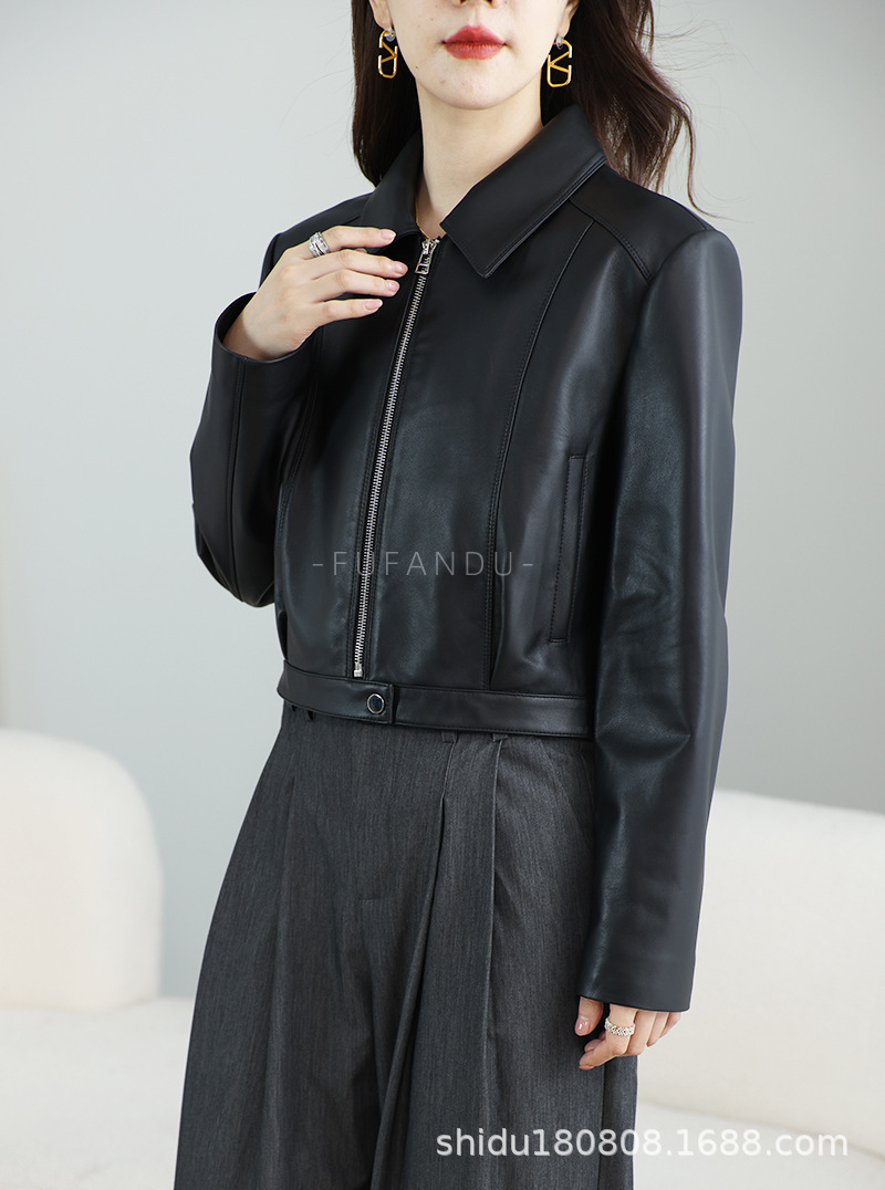 Haining 봄과 가을 새로운 여성 지퍼 오토바이 가죽 코트 라펠 블랙 양피 정품 가죽 자켓 짧은 가죽 코트
