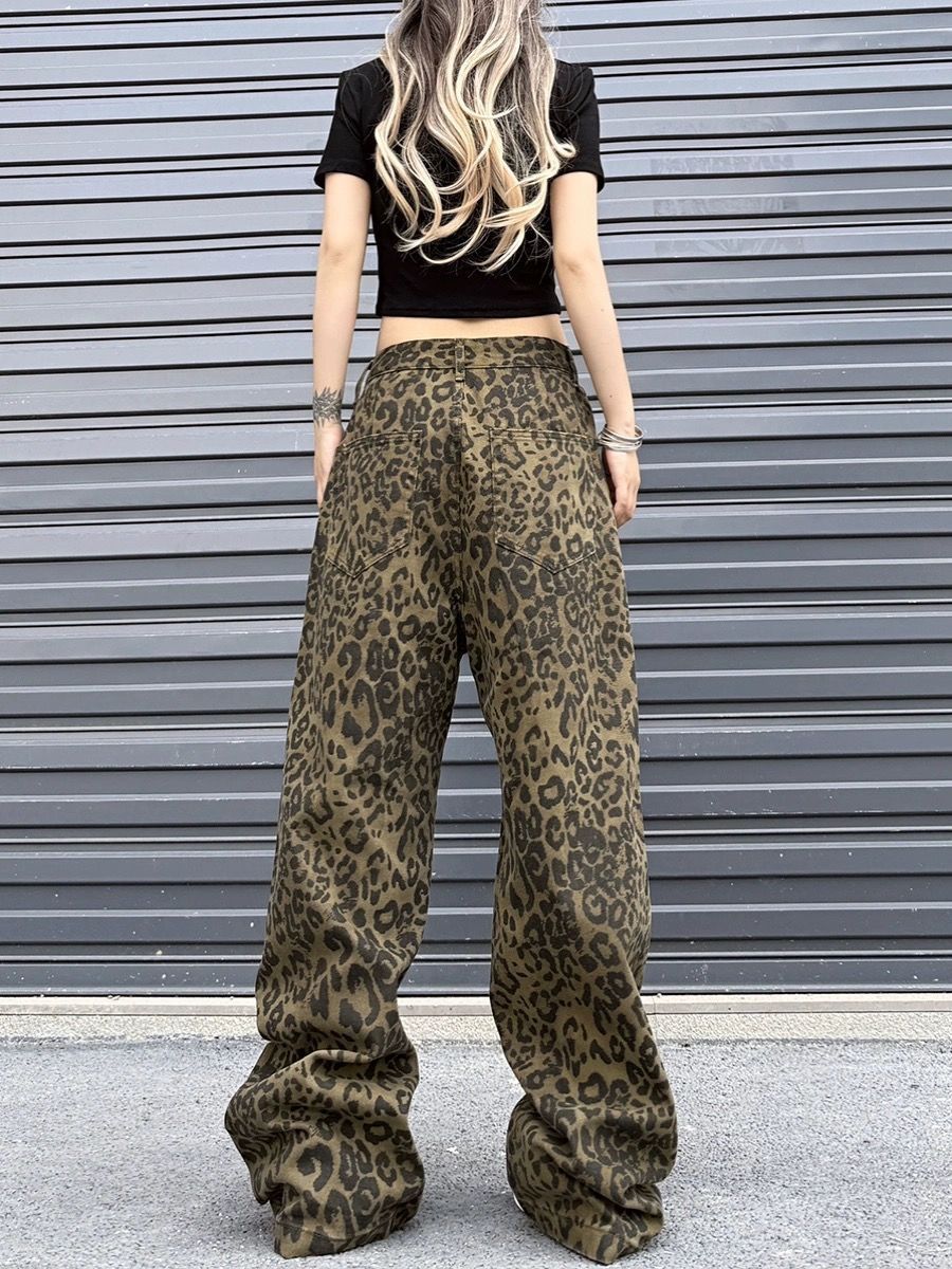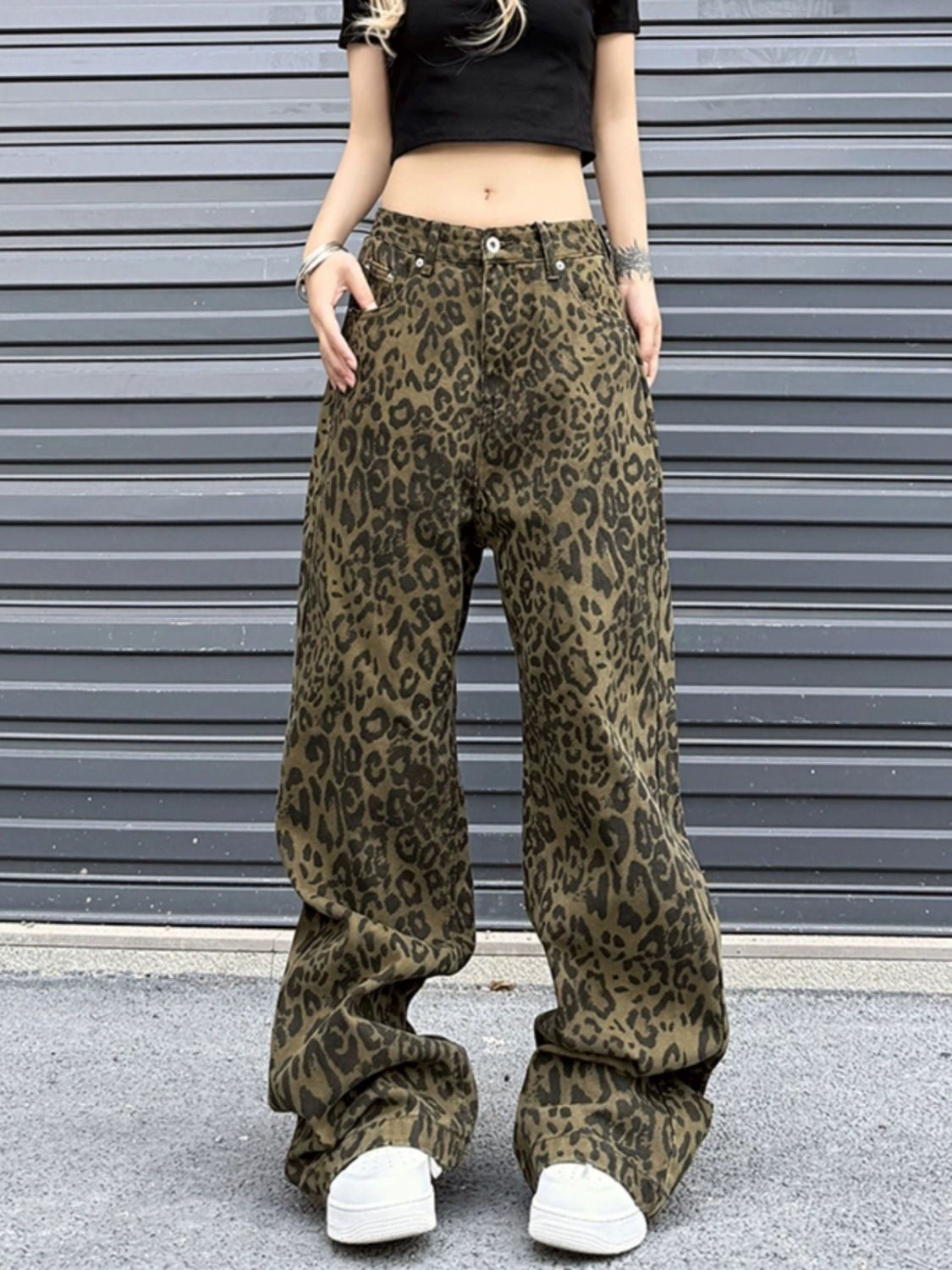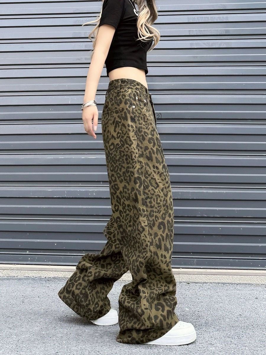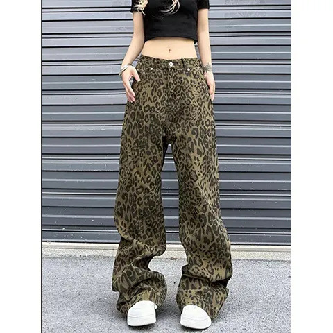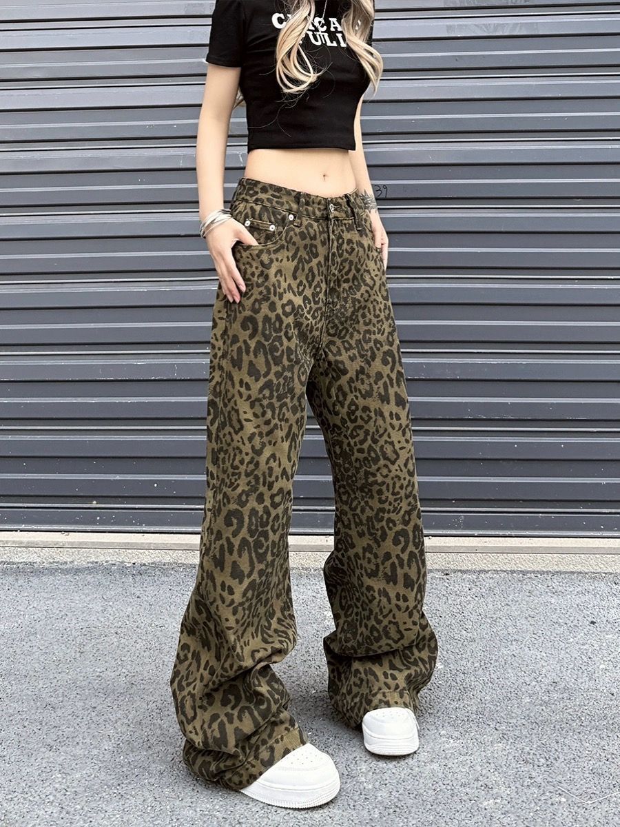 아메리칸 스타일 레트로 레오파드 무늬 넓은 다리 청바지 여성 여름 새로운 하이 스트리트 디자인 센스 루즈 하이 허리 스트레이트 캐주얼 바지스토어 가기