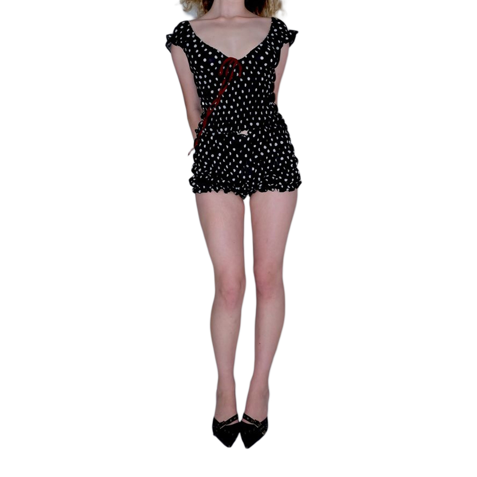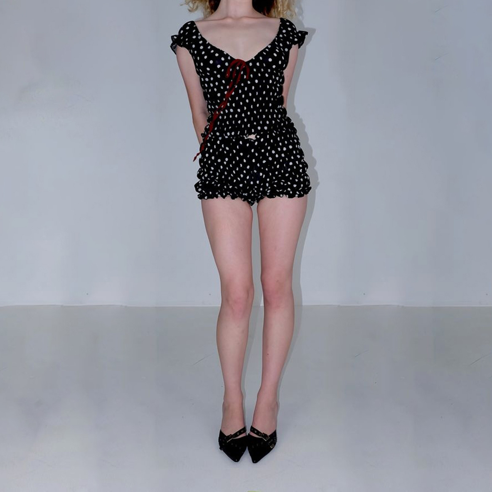 2024 국경을 넘는 뜨거운 여성의 새로운 파도 점 깊은 v 짧은 소매 v 칼라 짧은 최고 반바지 세트